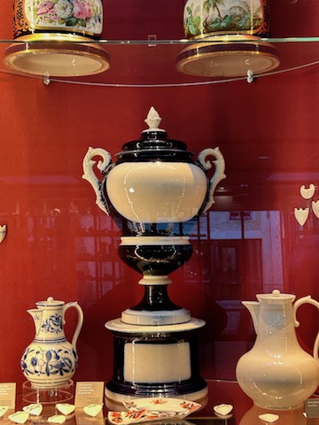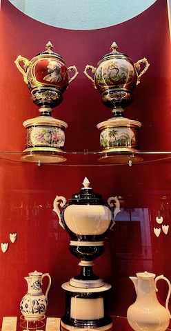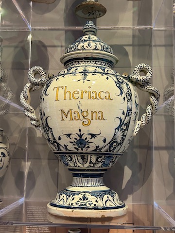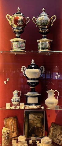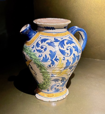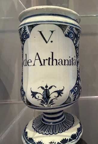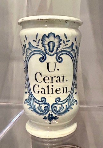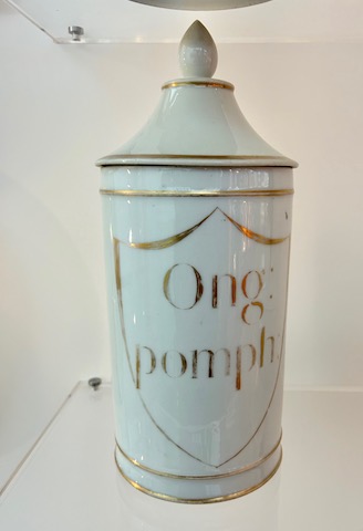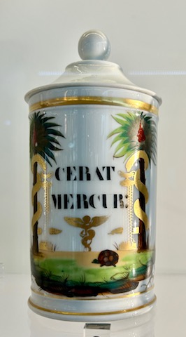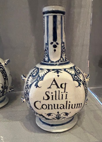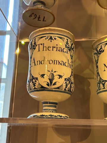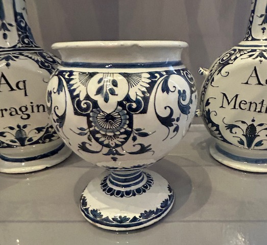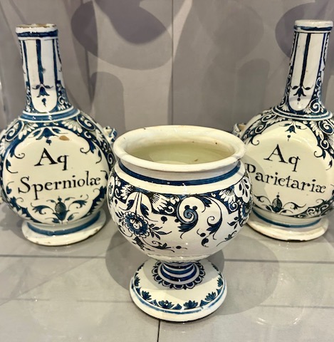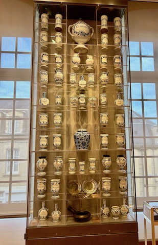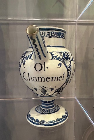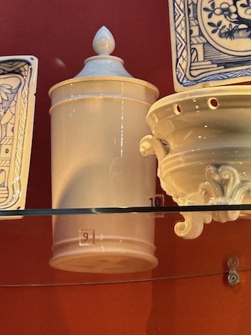Le premier objet pharmaceutique présenté est une chevrette de Laurent Abaquesne (XVIIème siècle), fils de Masséot Abaquesne. puis dans l'espace du XVIIIème siècle ont été rassemblés tous les pots de l'ancien Hôtel-Dieu de Bayeux. Ils sont d'origine Rouennaise et datent des XVIème au XVIIIème siècle. Ensuite d'autres pots fabriqués à Bayeux au XIXème siècle sont présentés et en particulier deux magnifiques "Pots de Monstres".