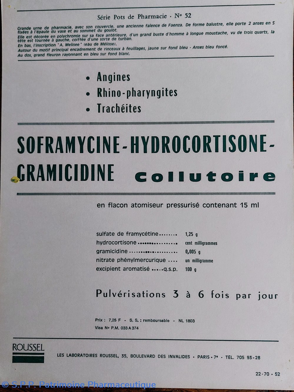 Au verso : Promotion pour SOFRAMYCINE- HYDROCORTISONE et GRAMICIDINE collutoire