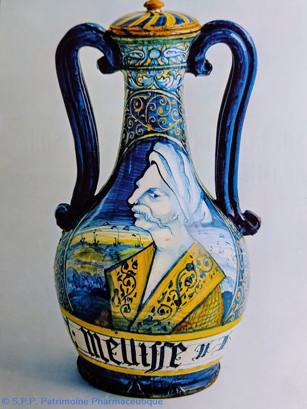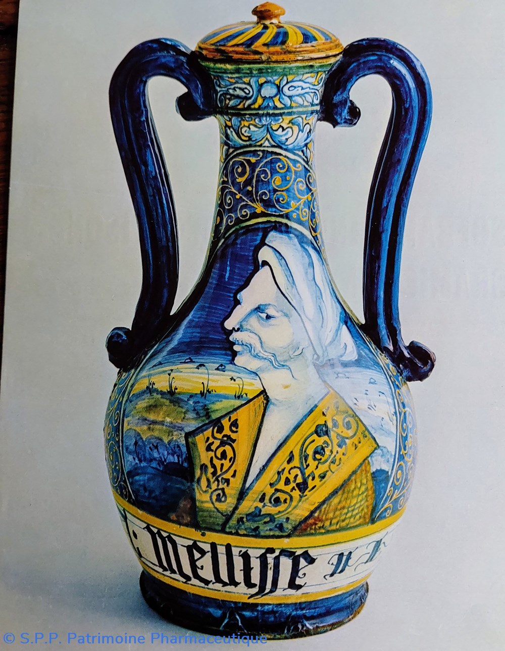 Au recto : Une de pharmacie avec couvercle - Faience de Faenza - 2 anses - Décor polychrome - Inscription " A.Melisee" ( Eau de mélisse)