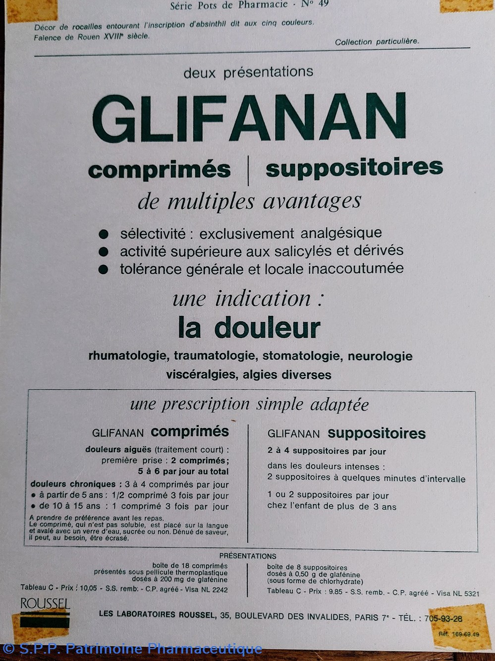 Au verso : Promotion du GLIFANAN ( Comprimés ou suppositoires) contre les douleurs .