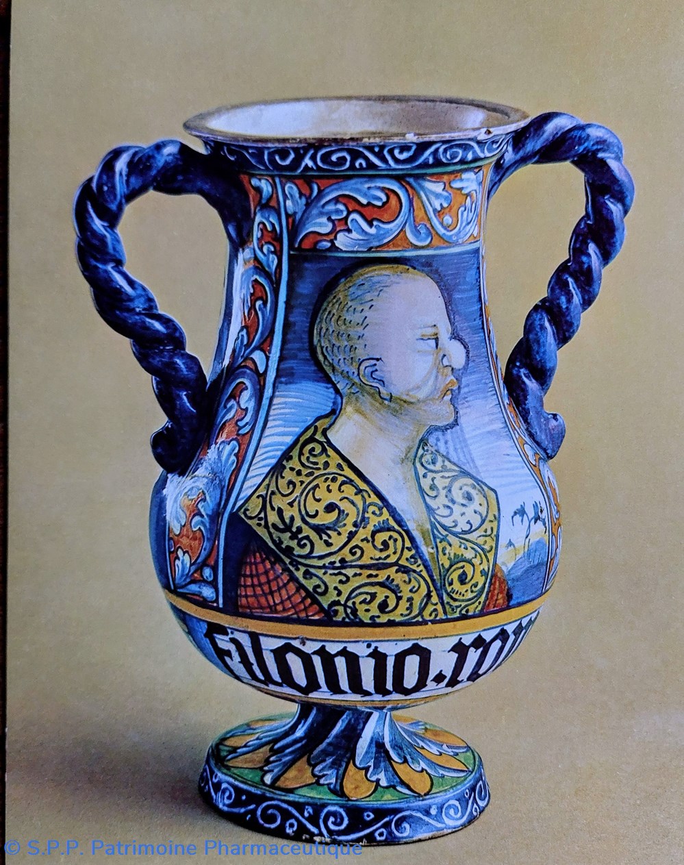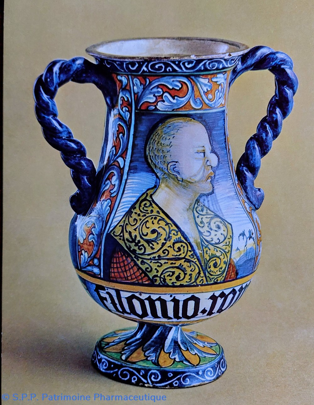 Vase de pharmacie en ancienne faience de Faenza - Forme balustre sur piedouche circulaire. Inscription " Filonio Romd : " Musée des Arts déco Lyon.
