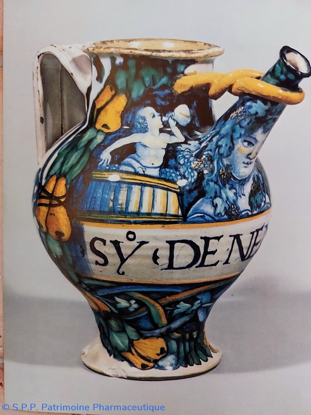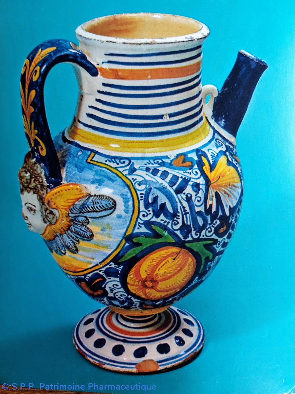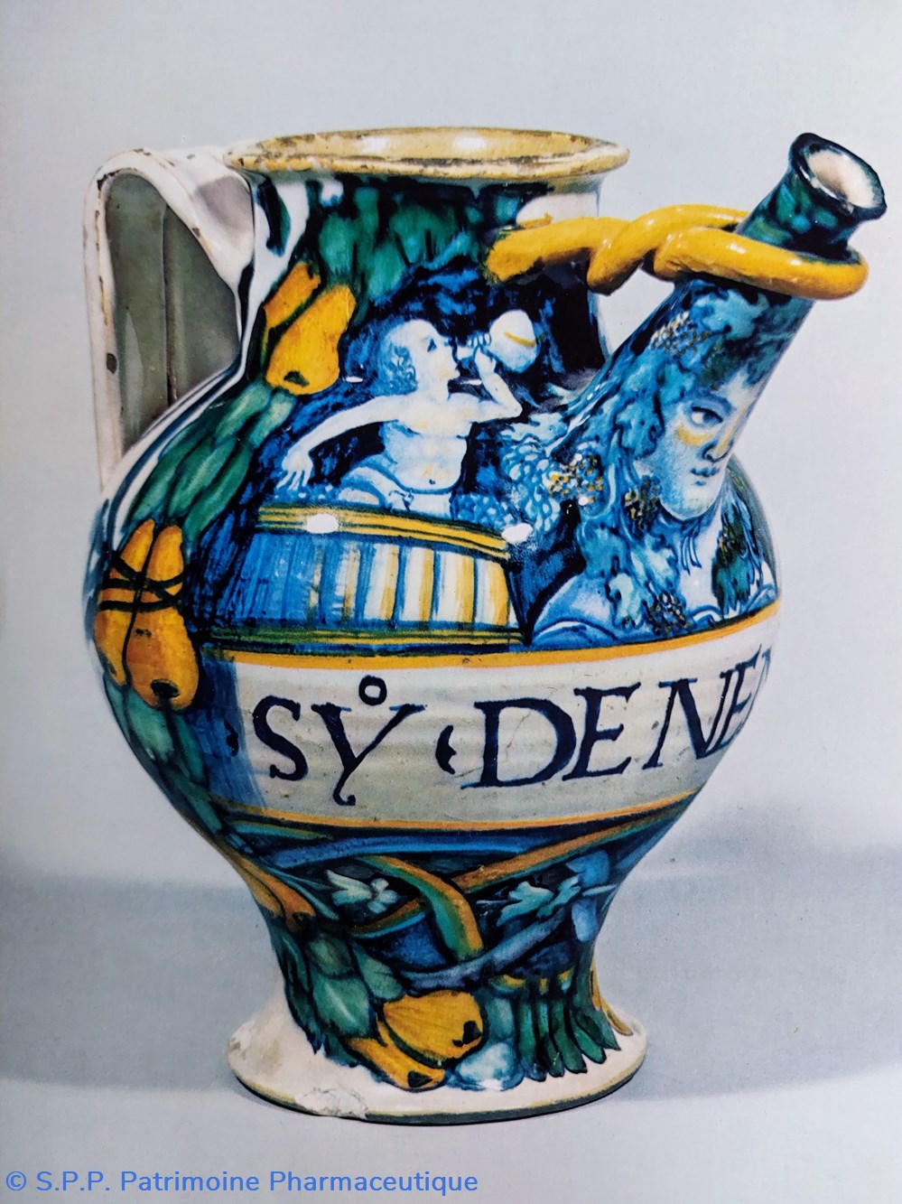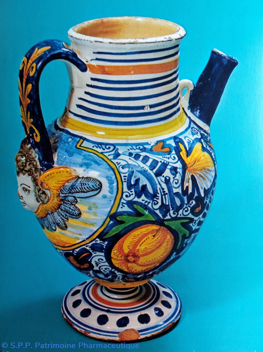 Au recto : Chevrette Faience de Sienne - date 1507- Décor de scènes de vendanges.- Ruban jaune reliant le bec au col de la chevrette.