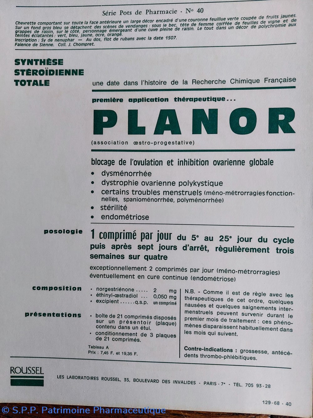 Au verso : Promotion du comprimé PLANOR ( blocage de l'ovulation )