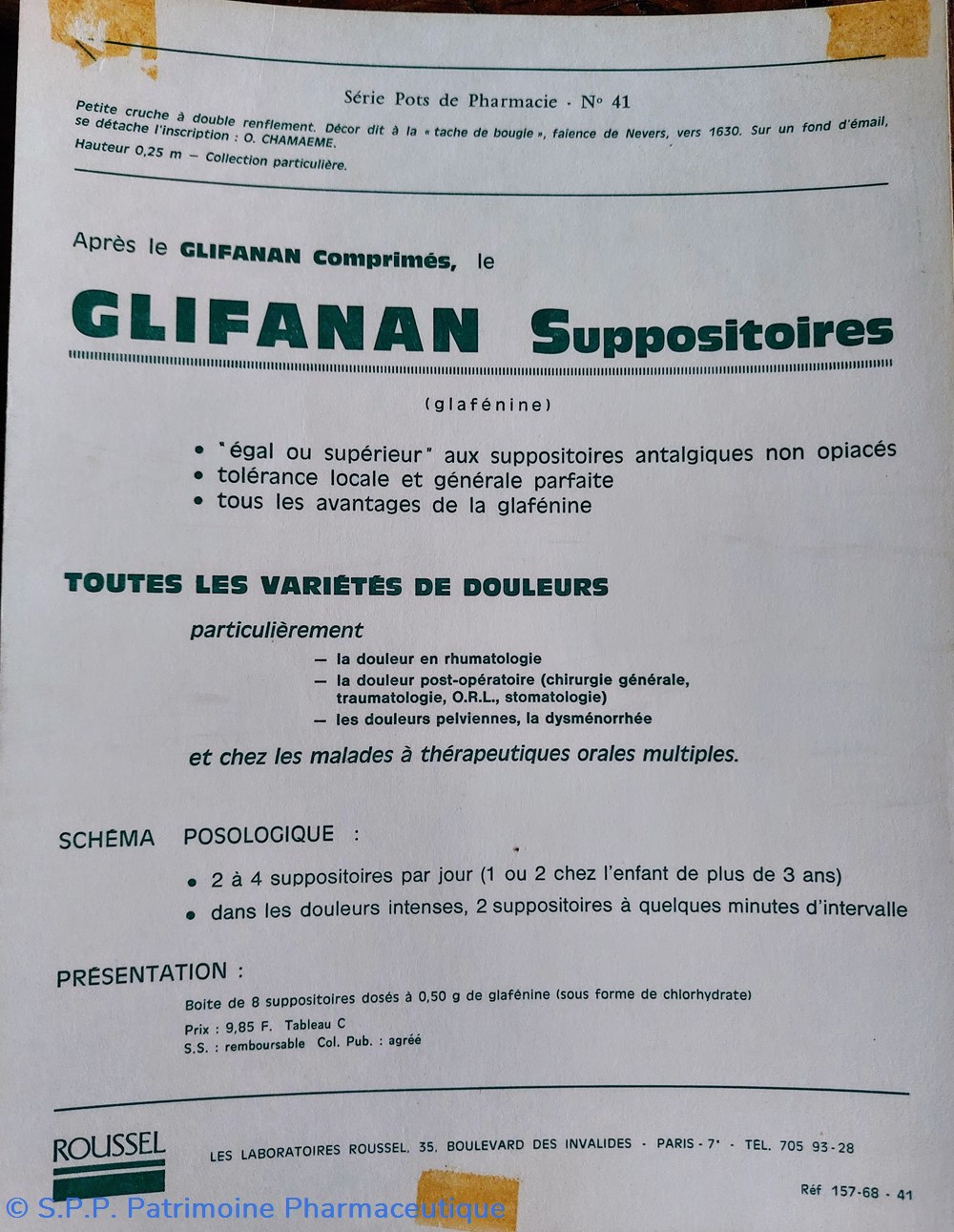 Au verso : Promotion des suppositoires GLIFANAN pour les douleurs.