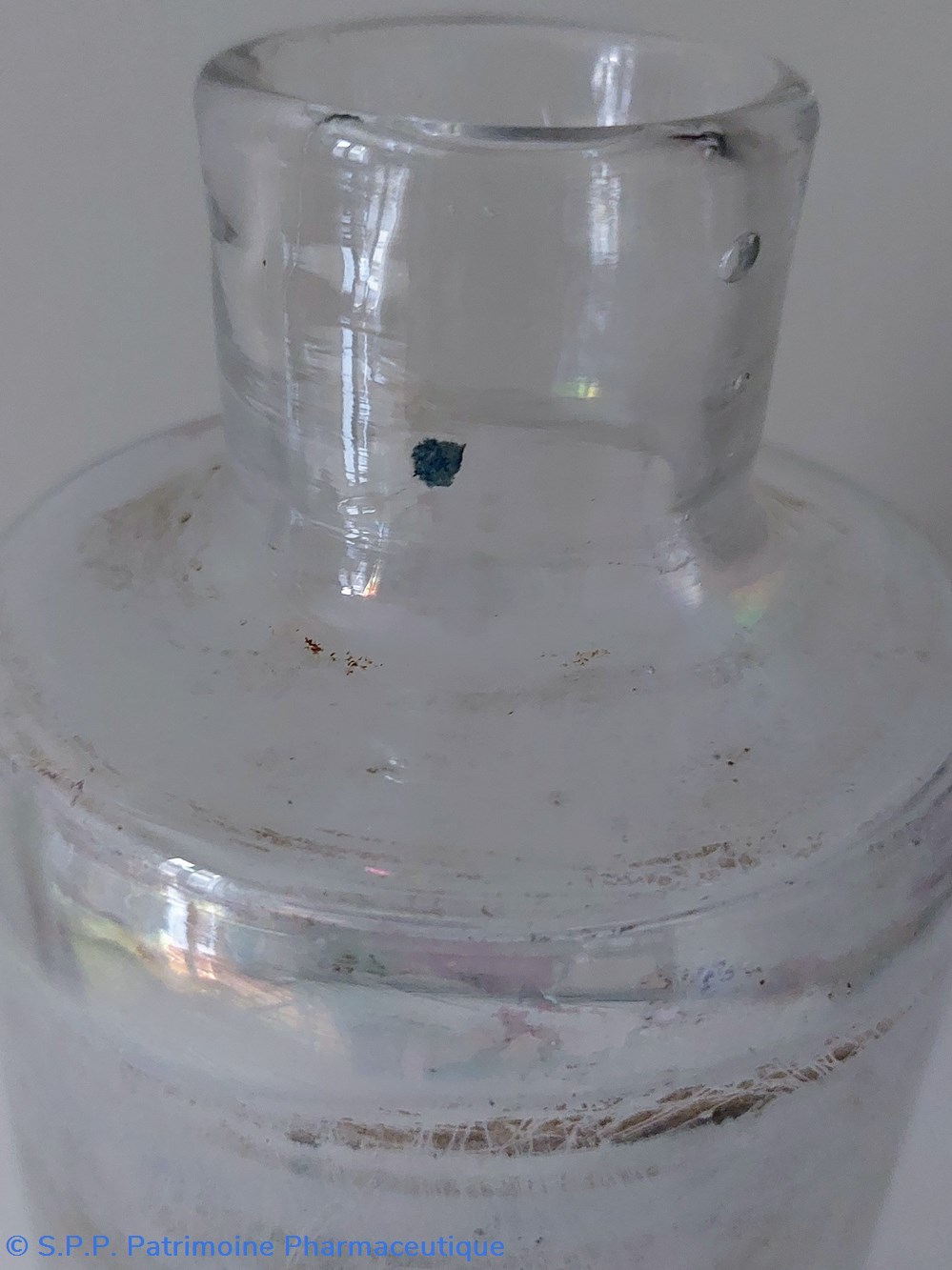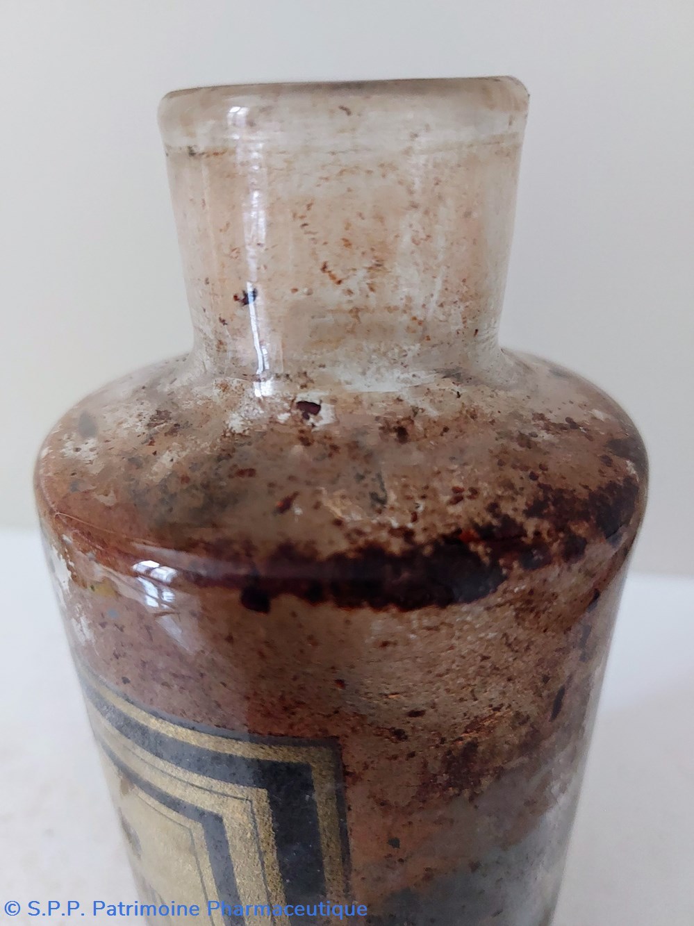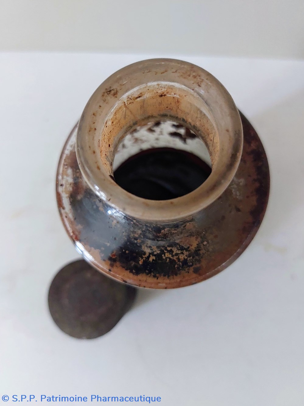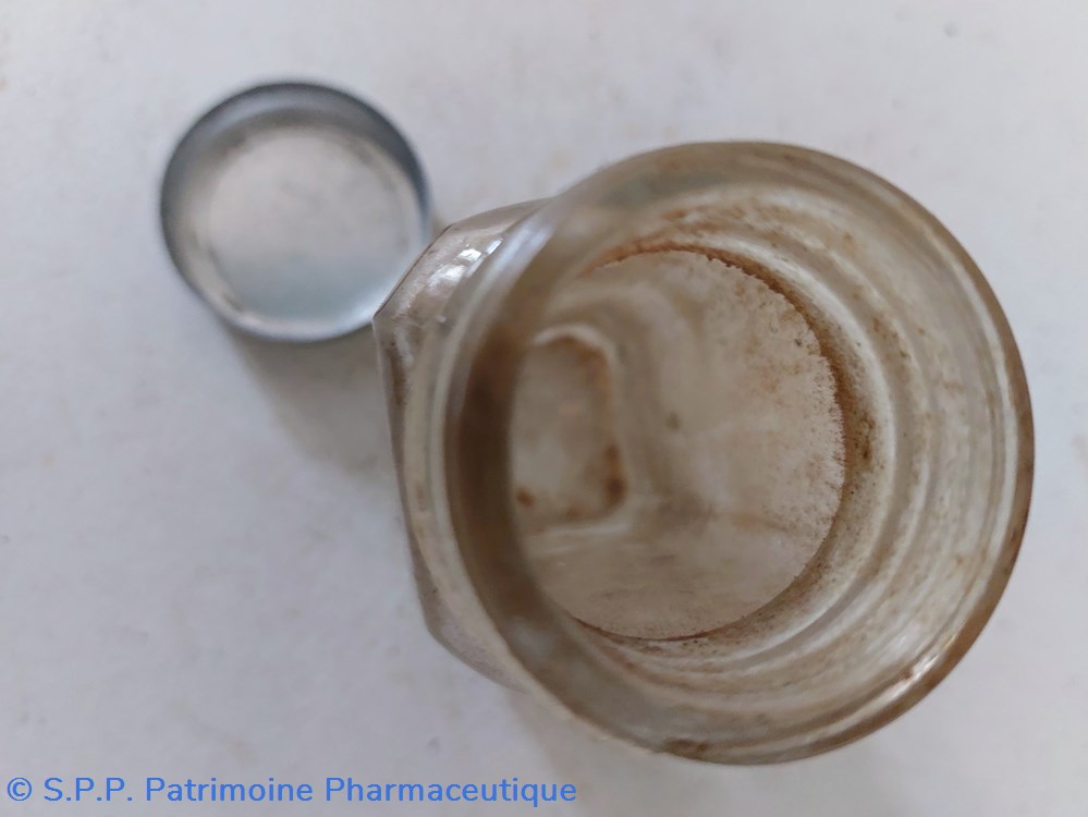 Flacon en verre blanc fermé par un couvercle en tôle rouillée.