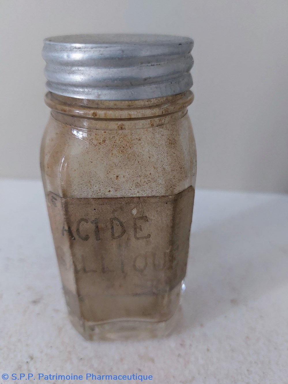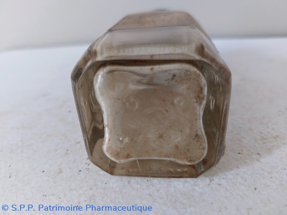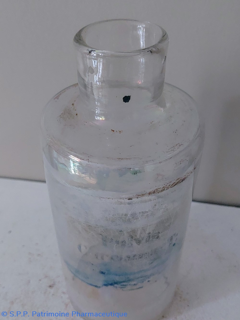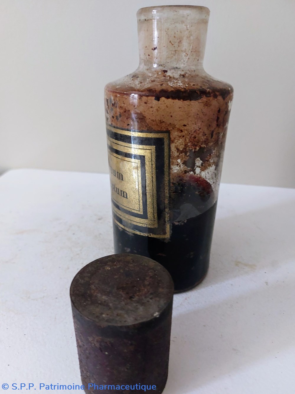 Flacon en verre blanc fermé par un couvercle en tôle rouillée.