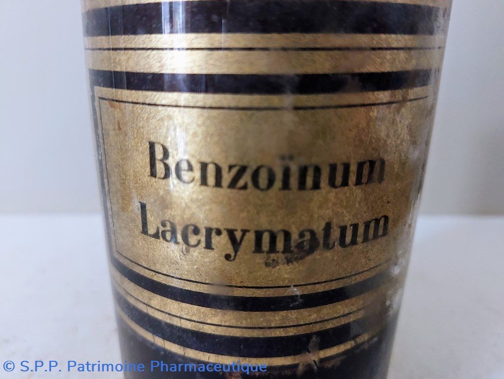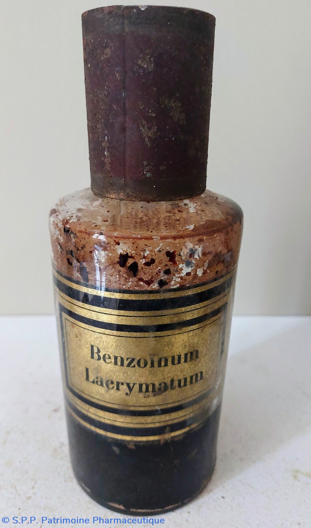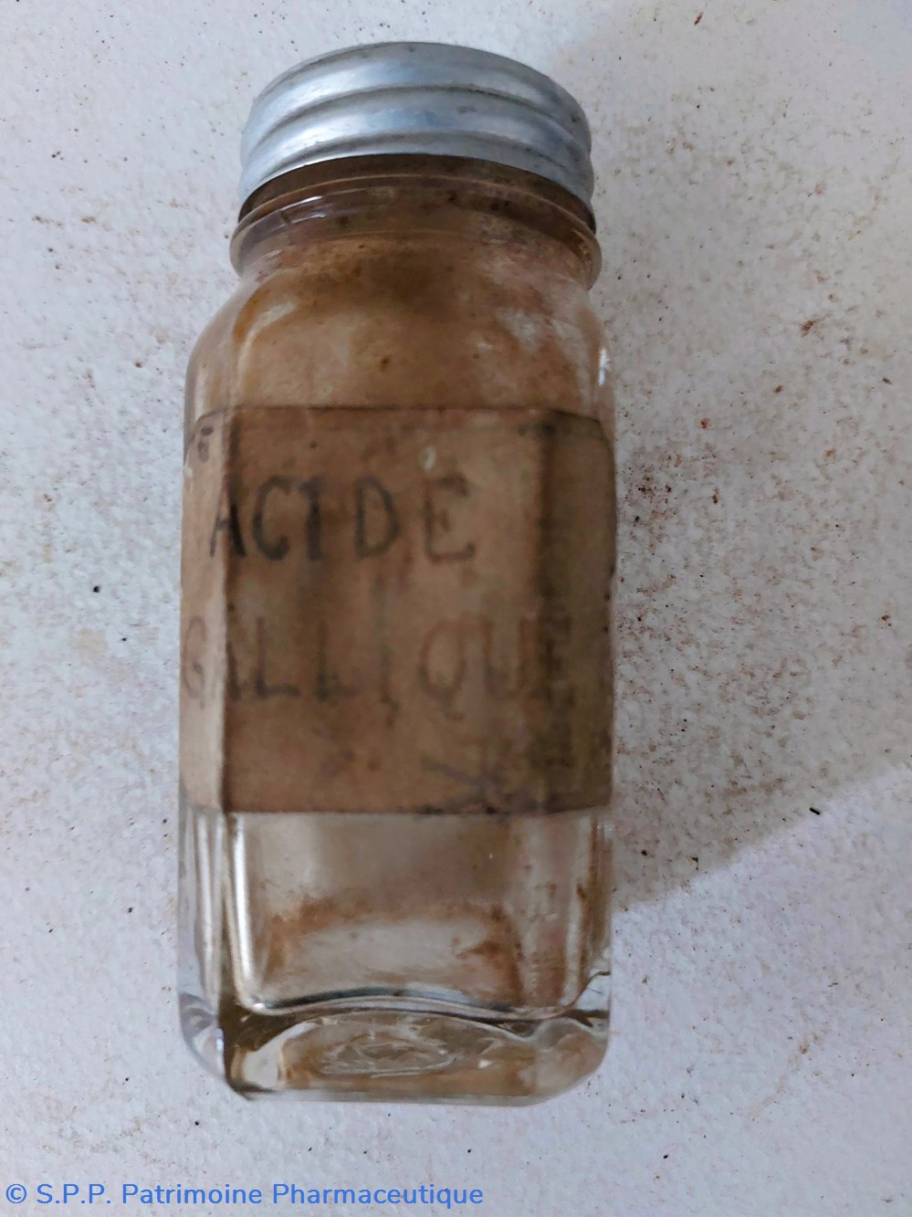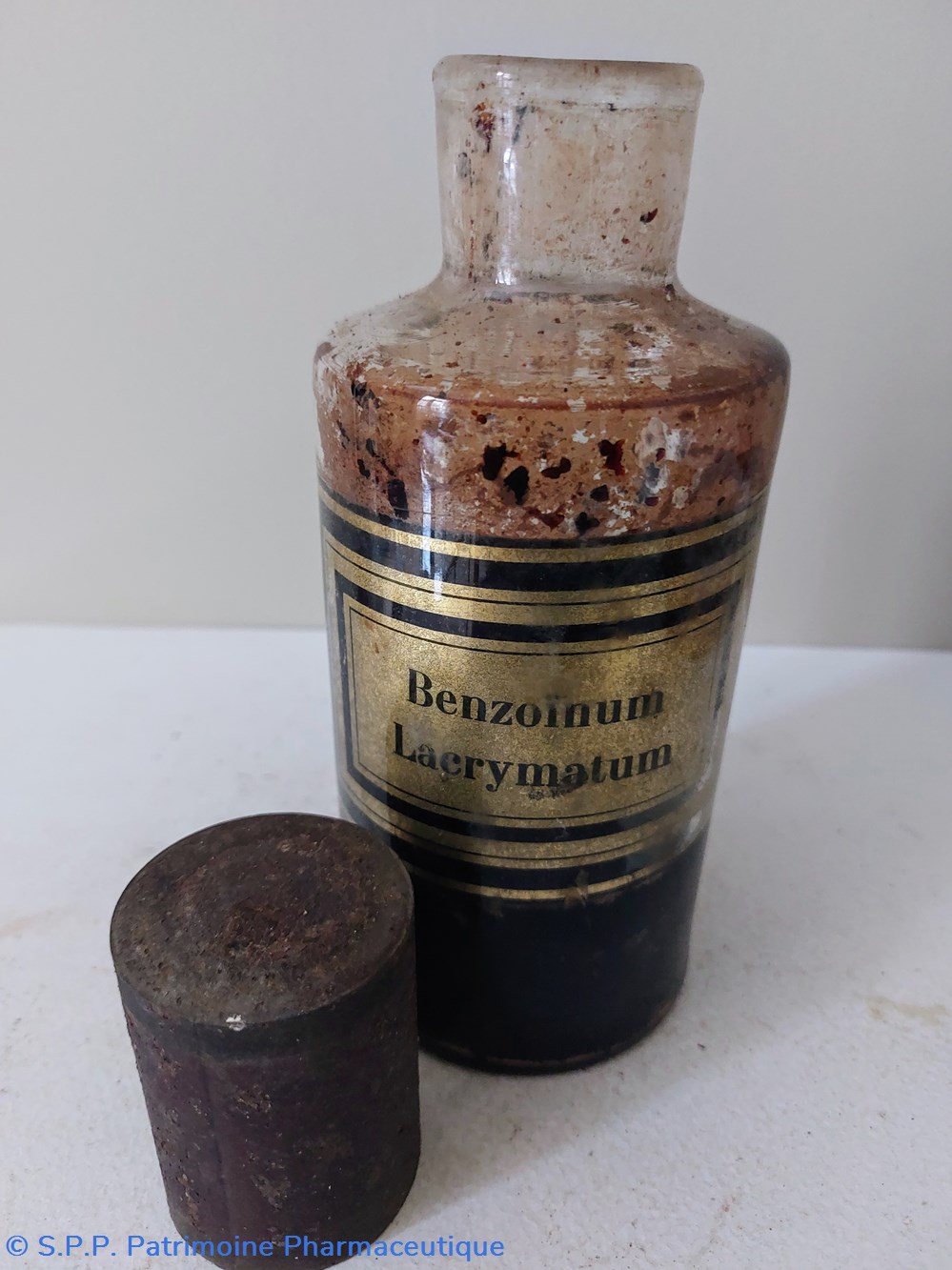 Flacon en verre blanc fermé par un couvercle en tôle rouillée.