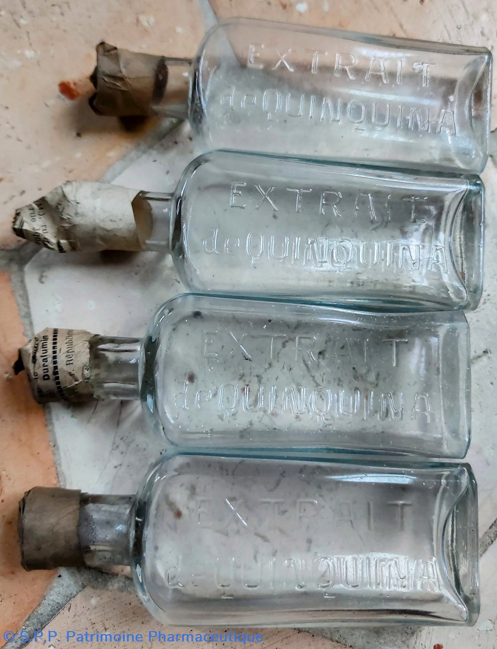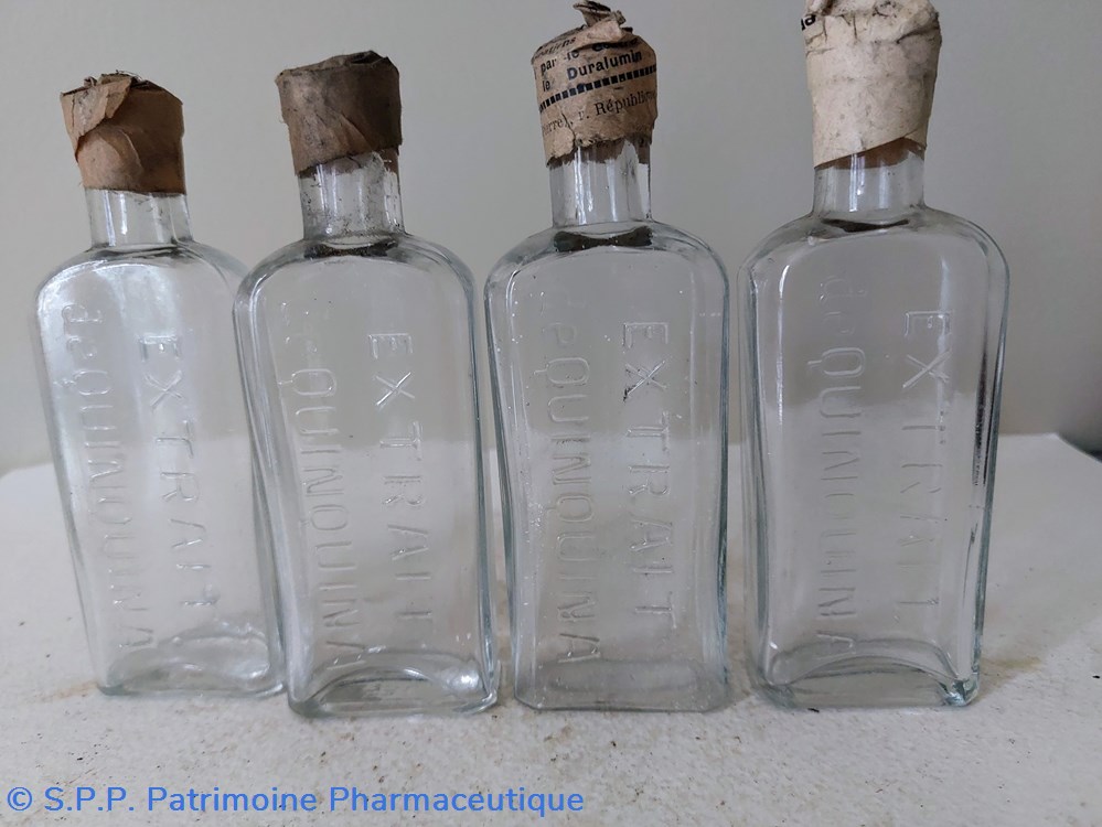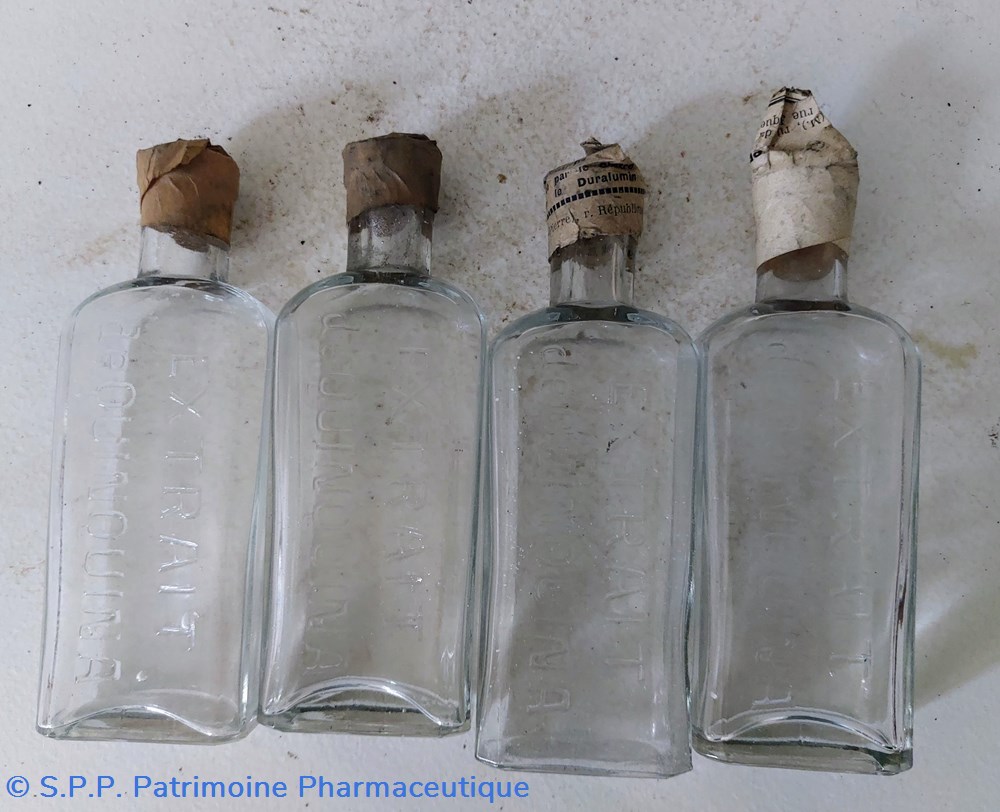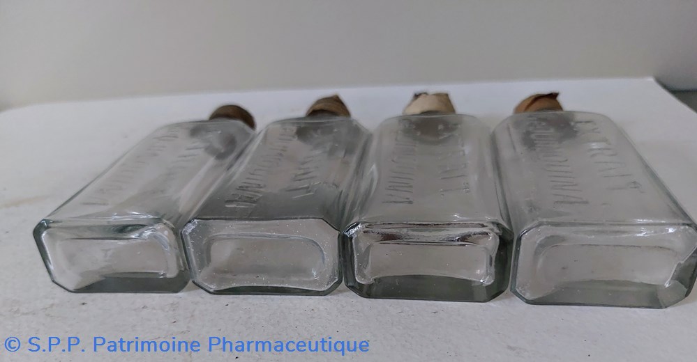 Lot de quatre petites bouteilles vides de forme parallélépipédique et de hauteur 13 cm.