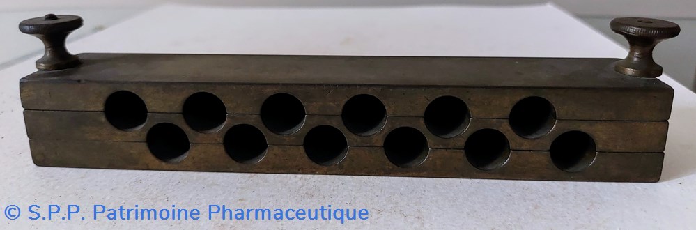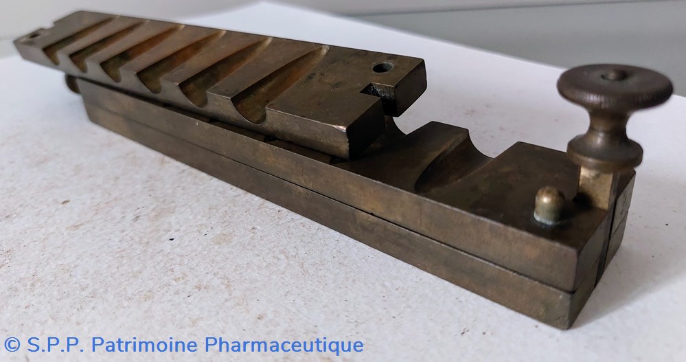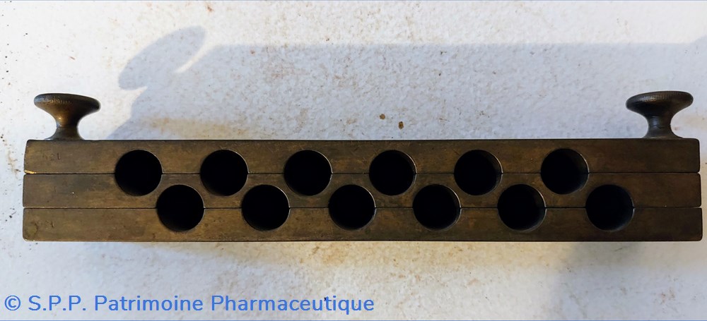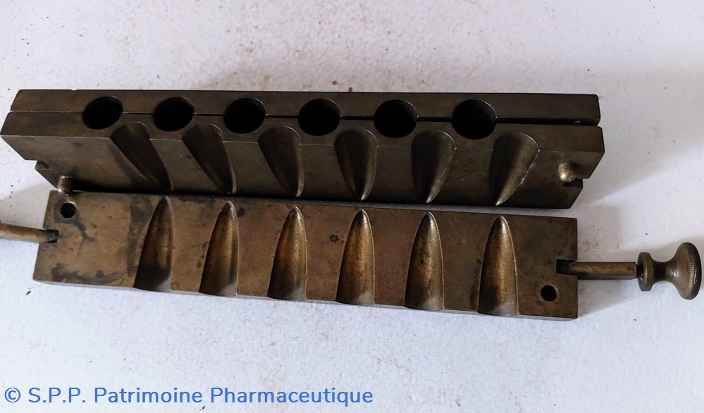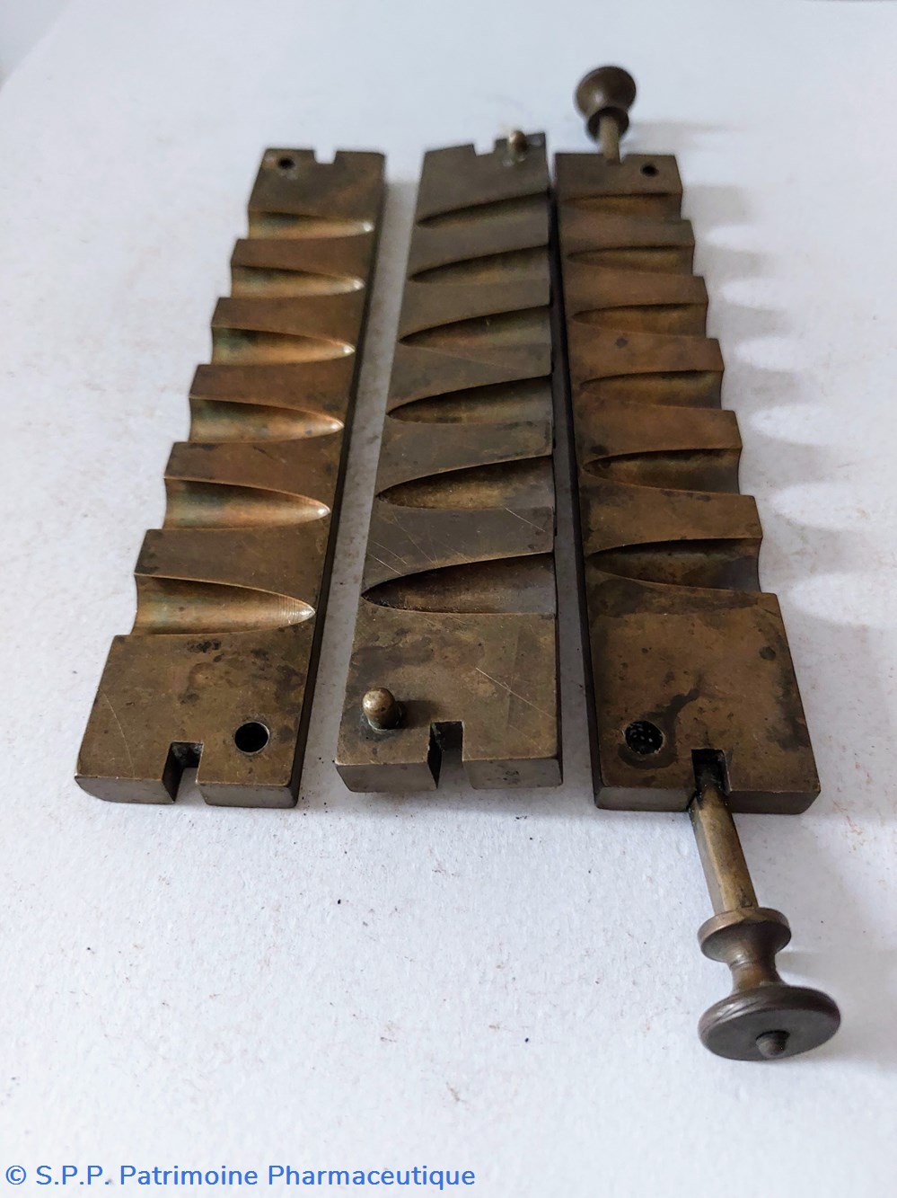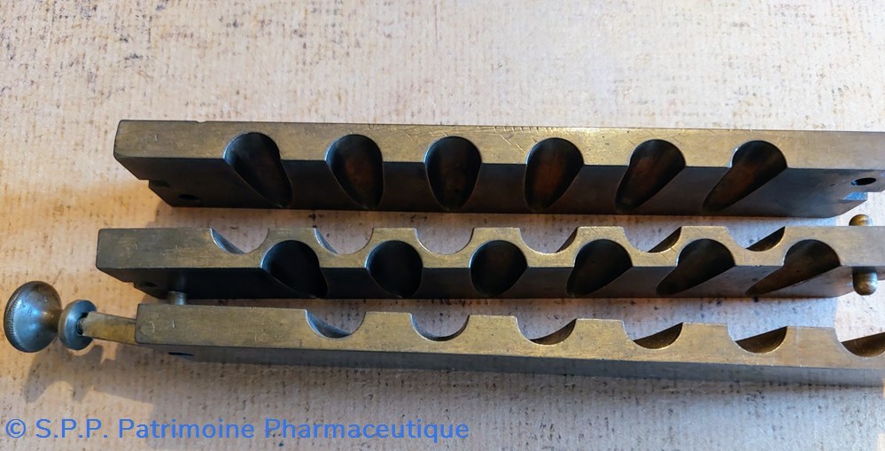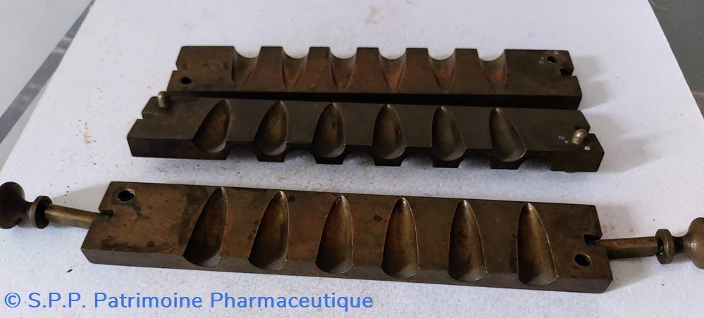 Les pièces inférieure et supérieure forme six demi suppositoires. La pièce milieu complète les alvéoles mentionnées ci- dessus.