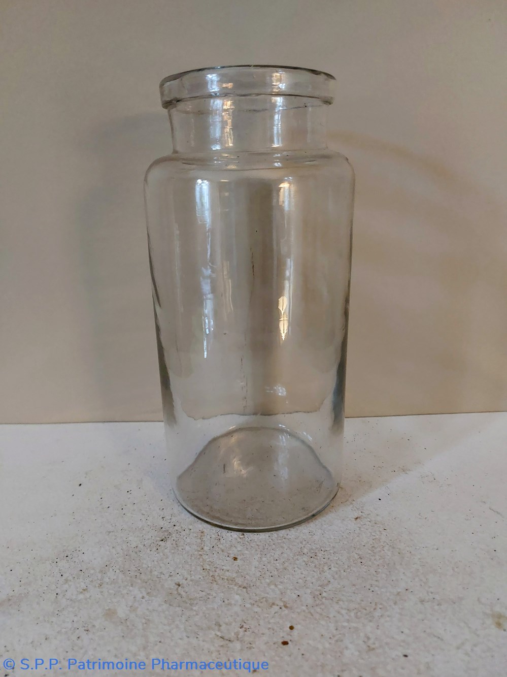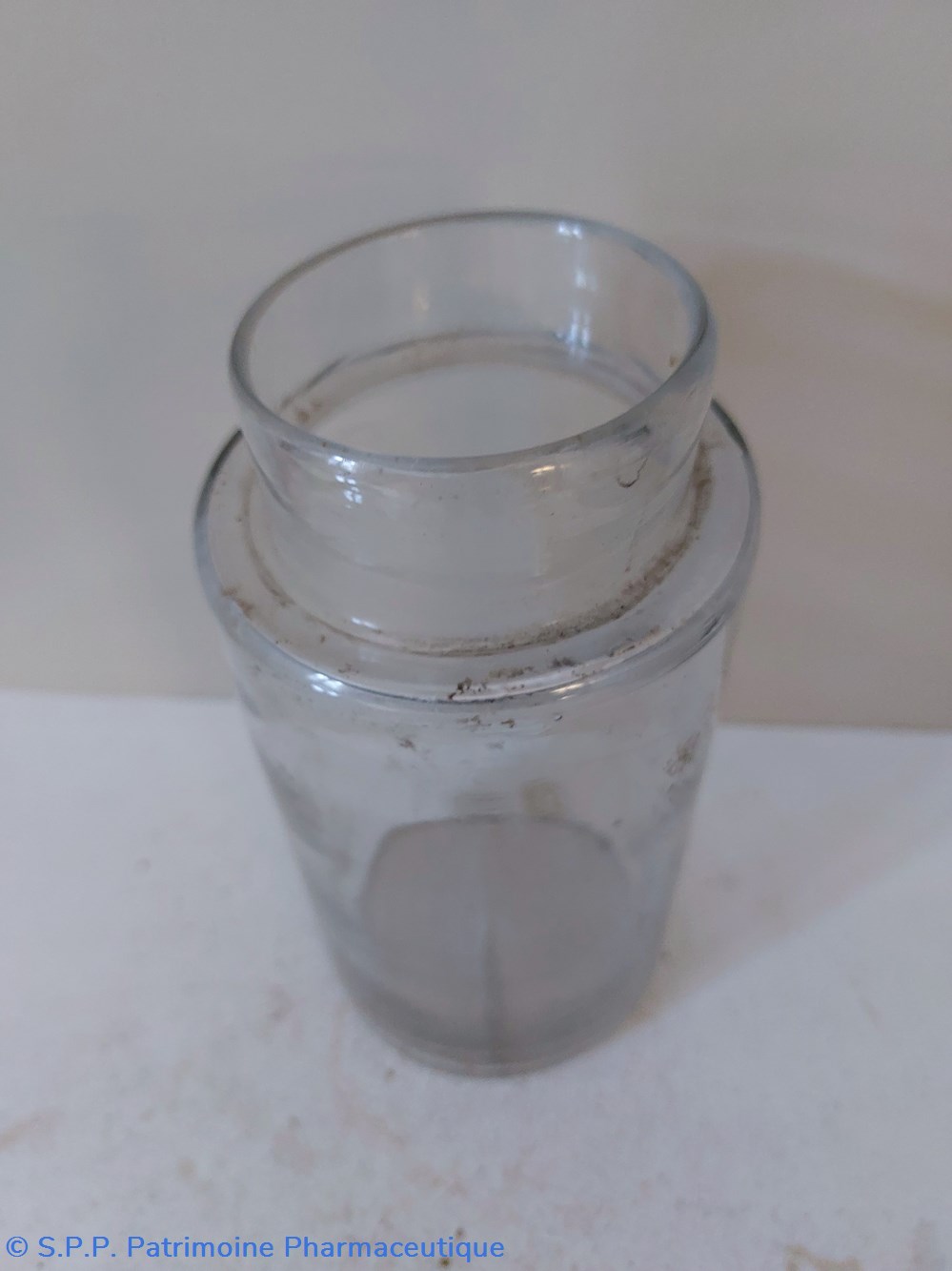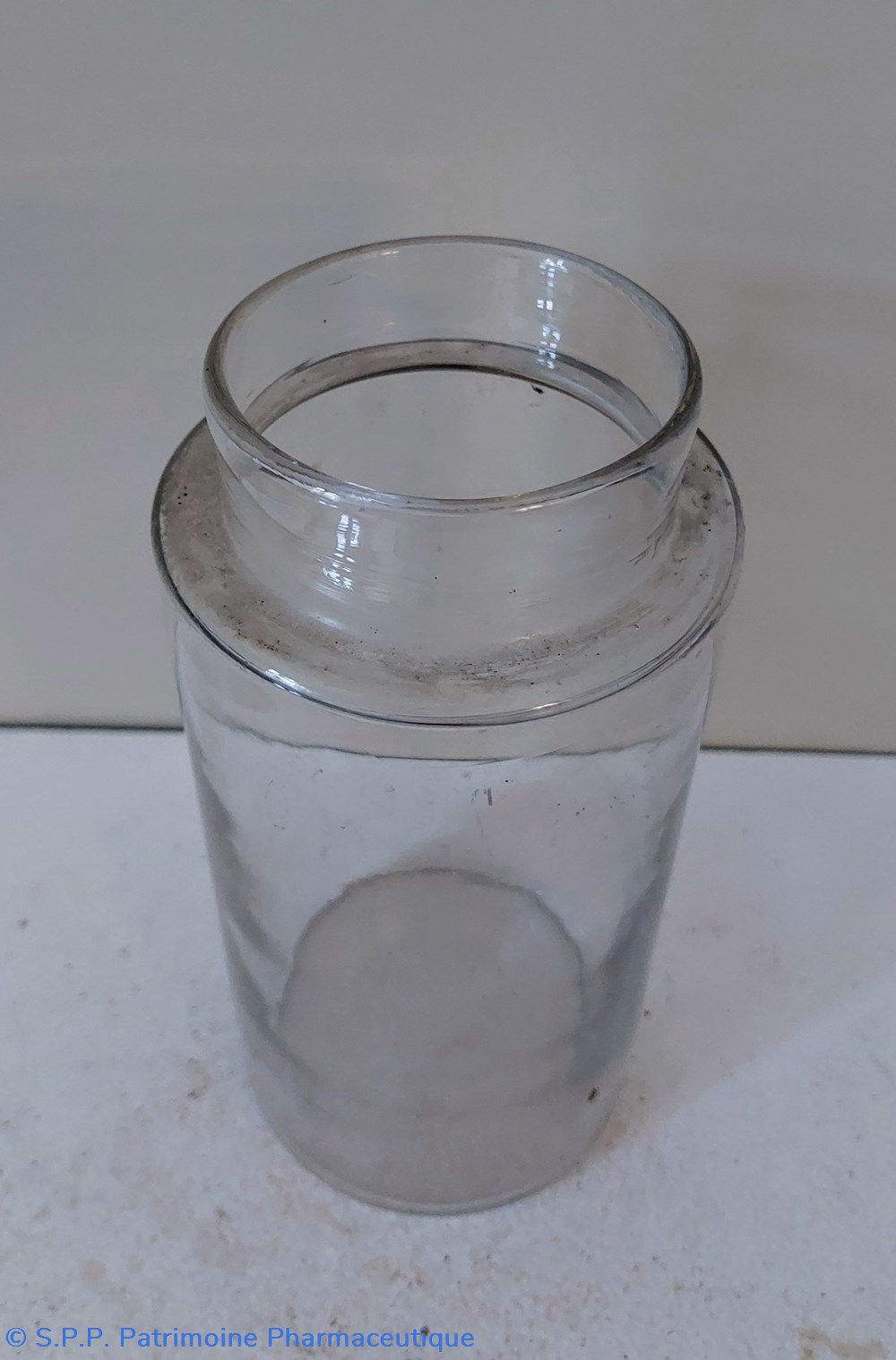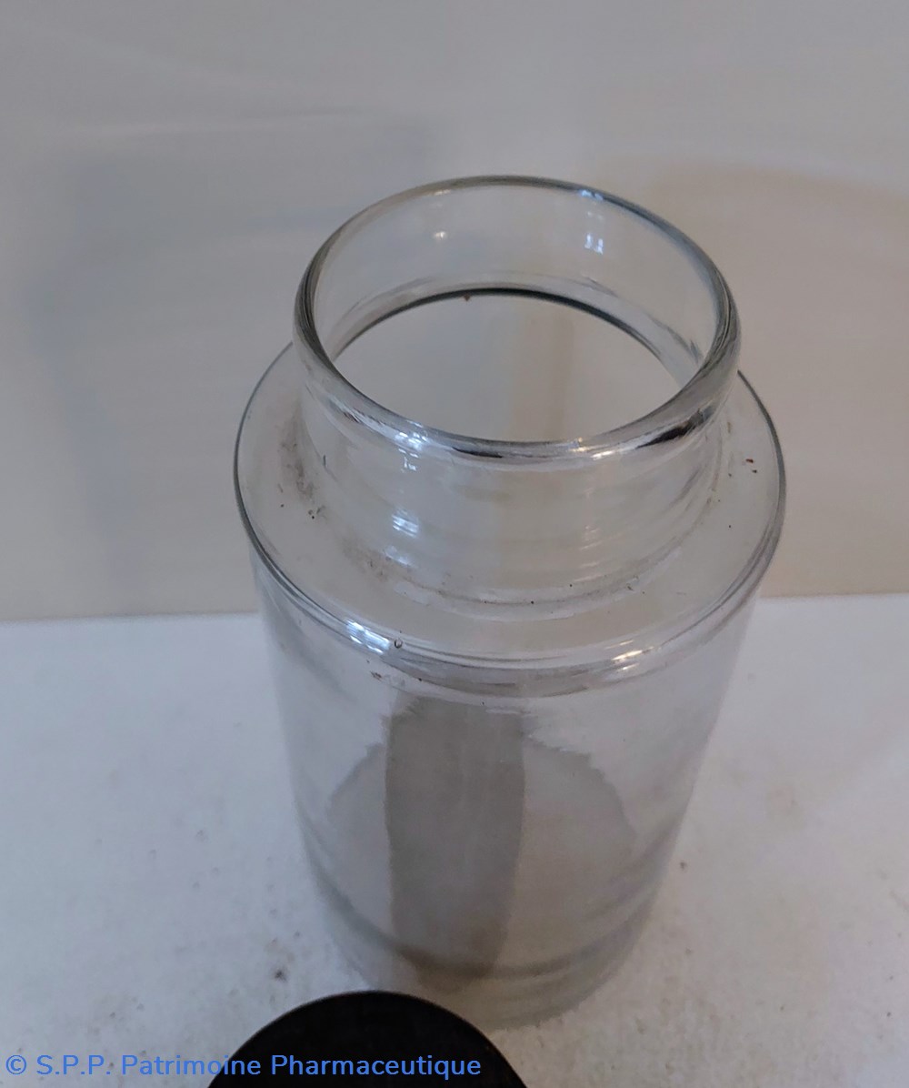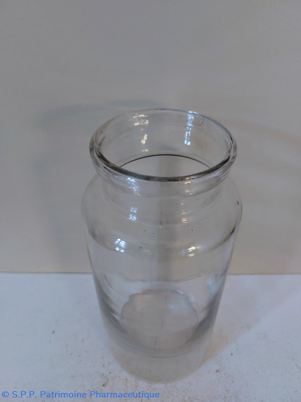 Pot de Pharmacie en verre vide et sans étiquette ni bouchon.