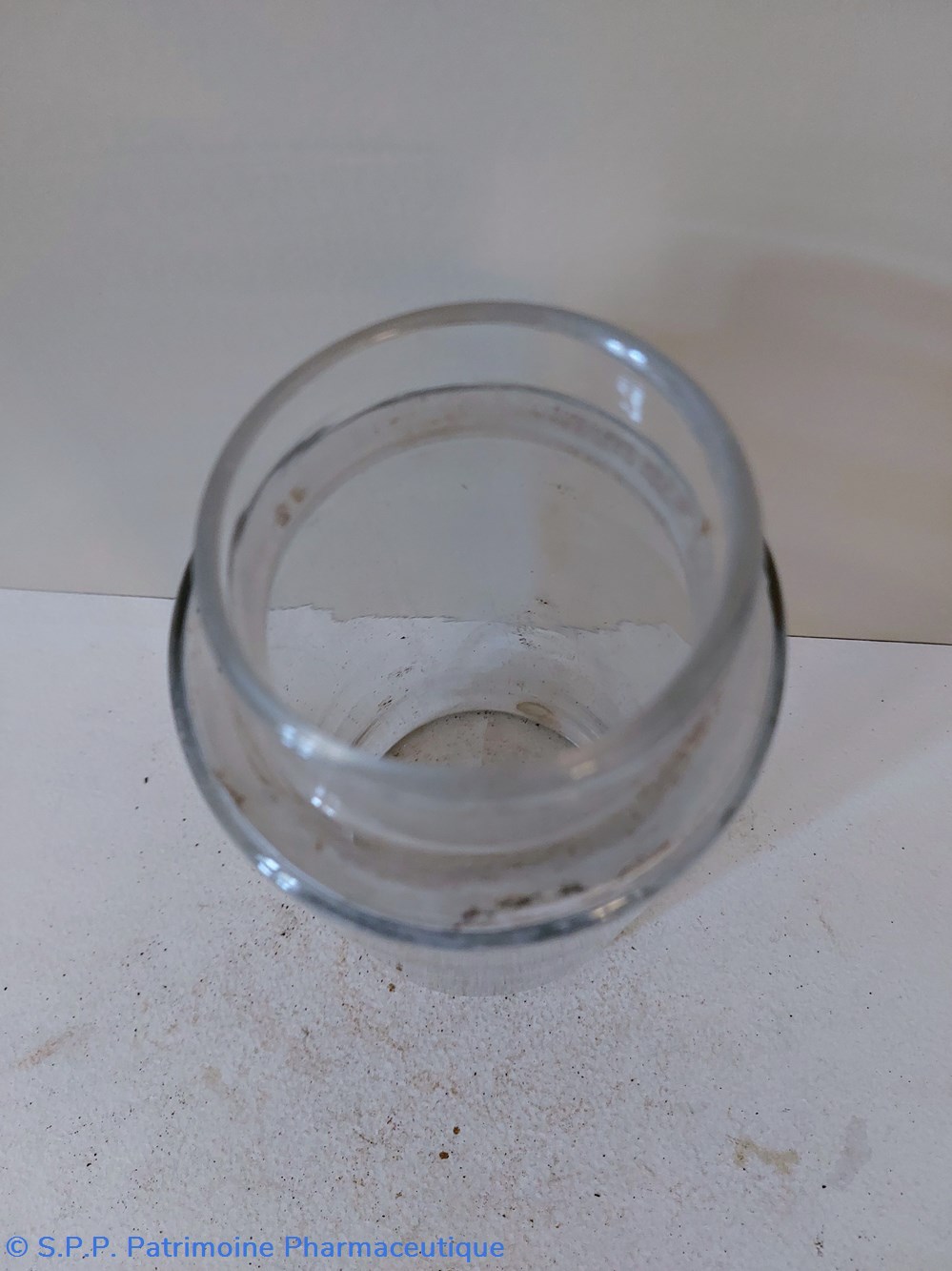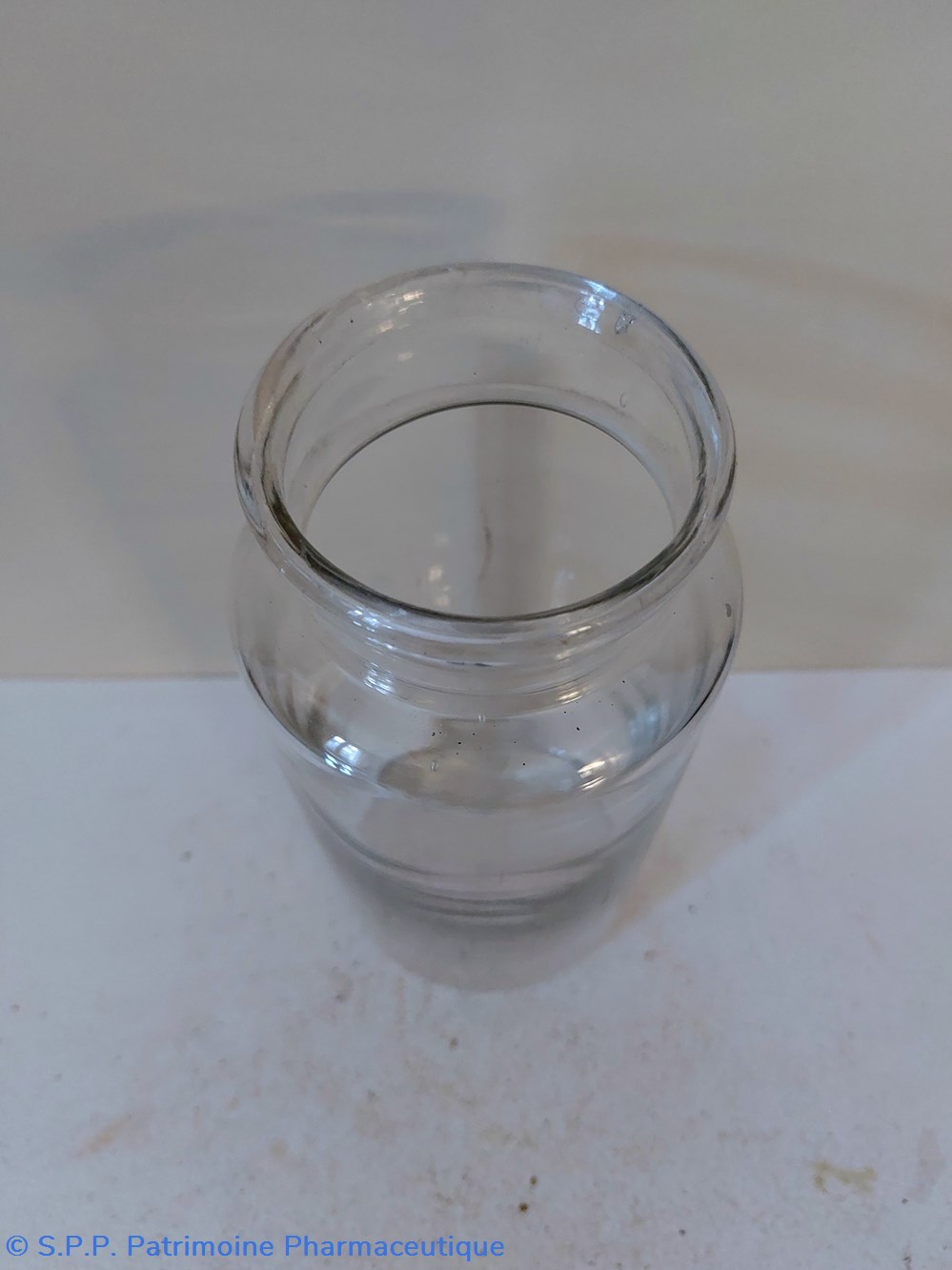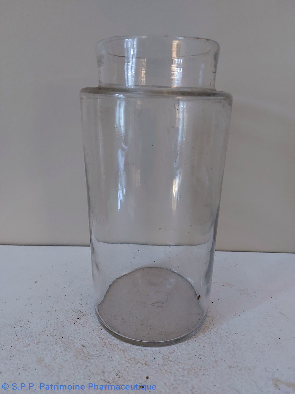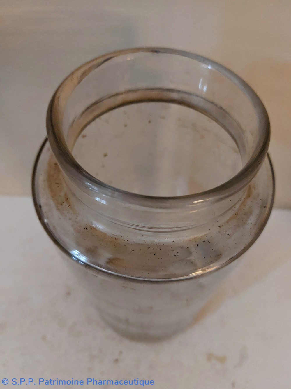 Pot de Pharmacie en verre vide et sans étiquette ni bouchon.
