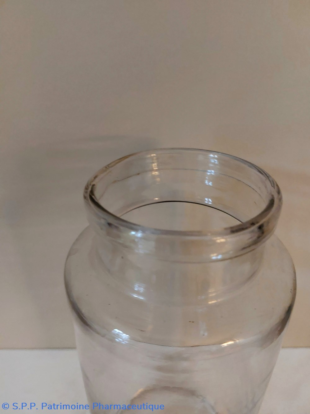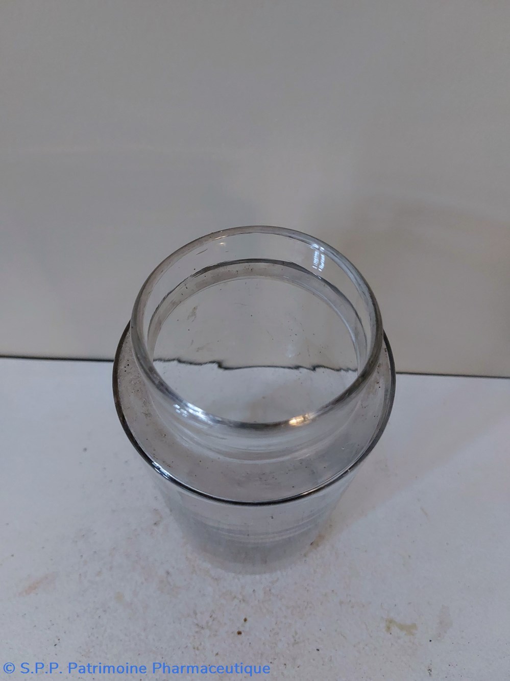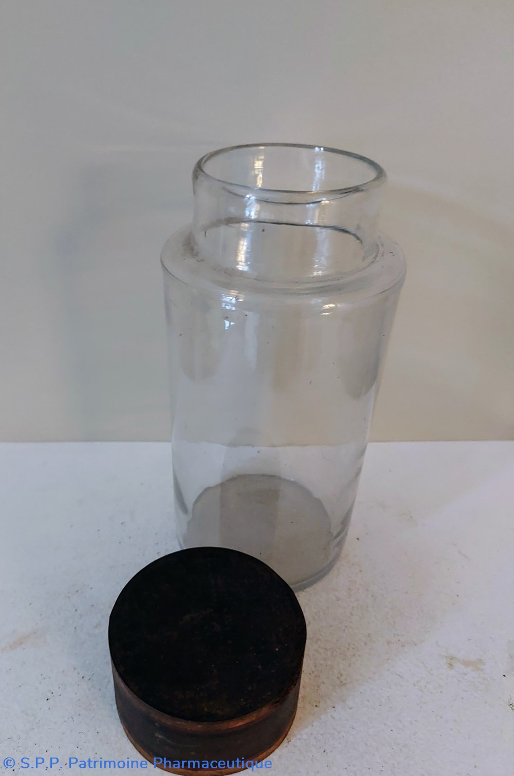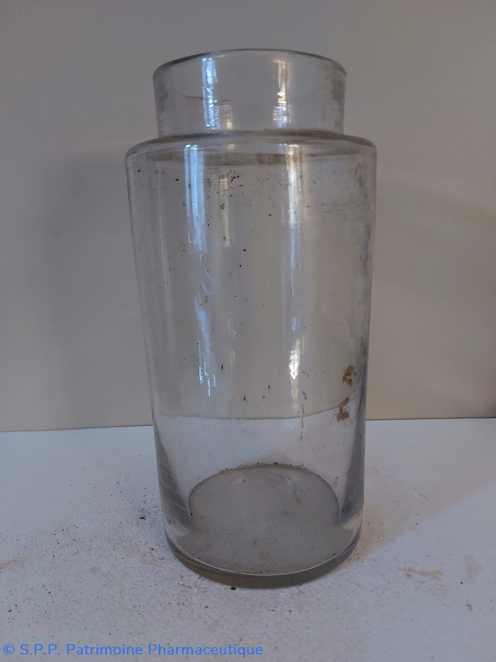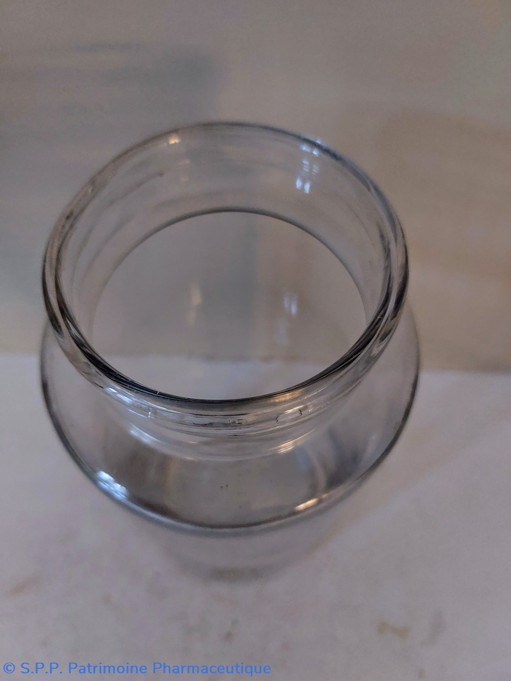 Pot de Pharmacie en verre vide et sans étiquette ni bouchon.
