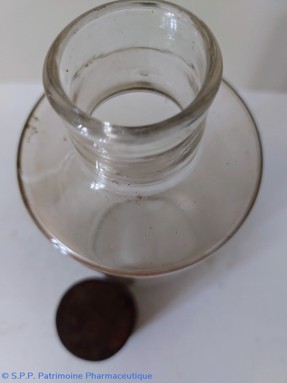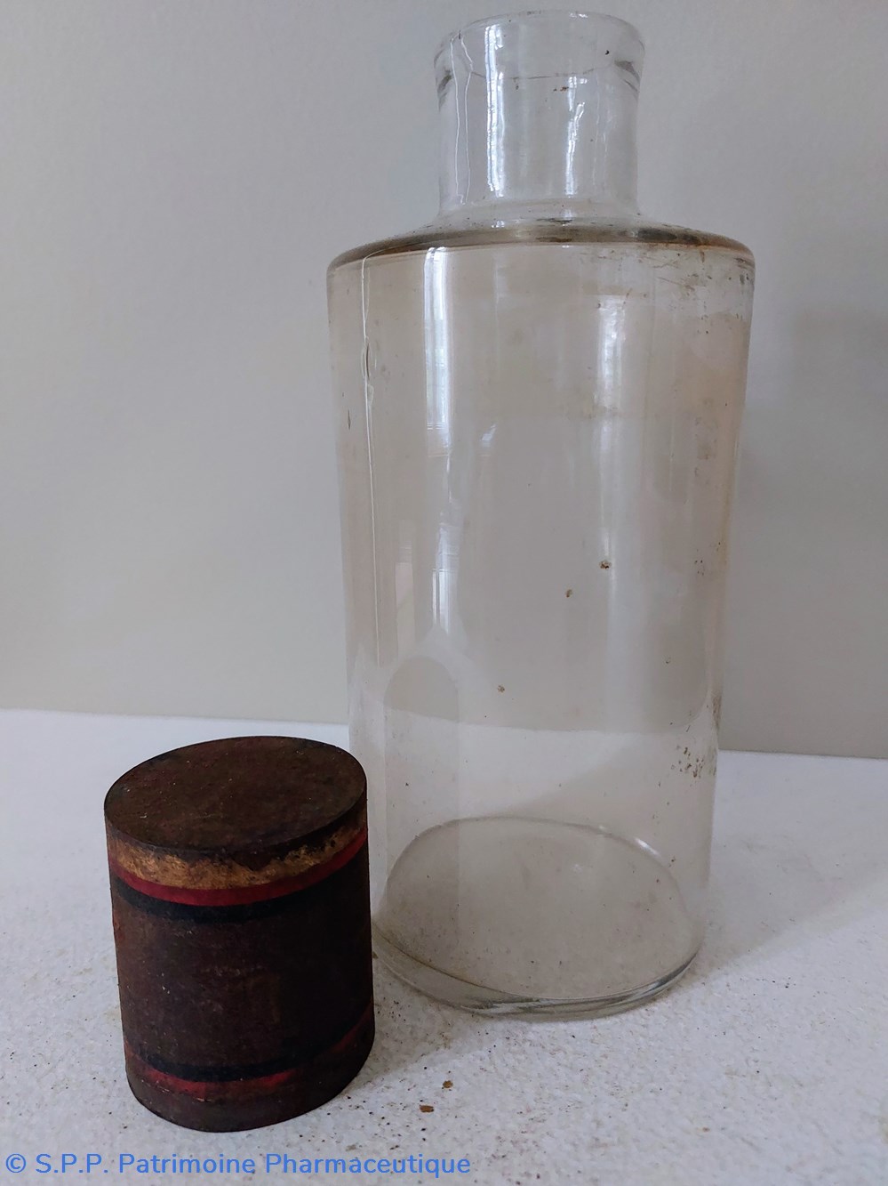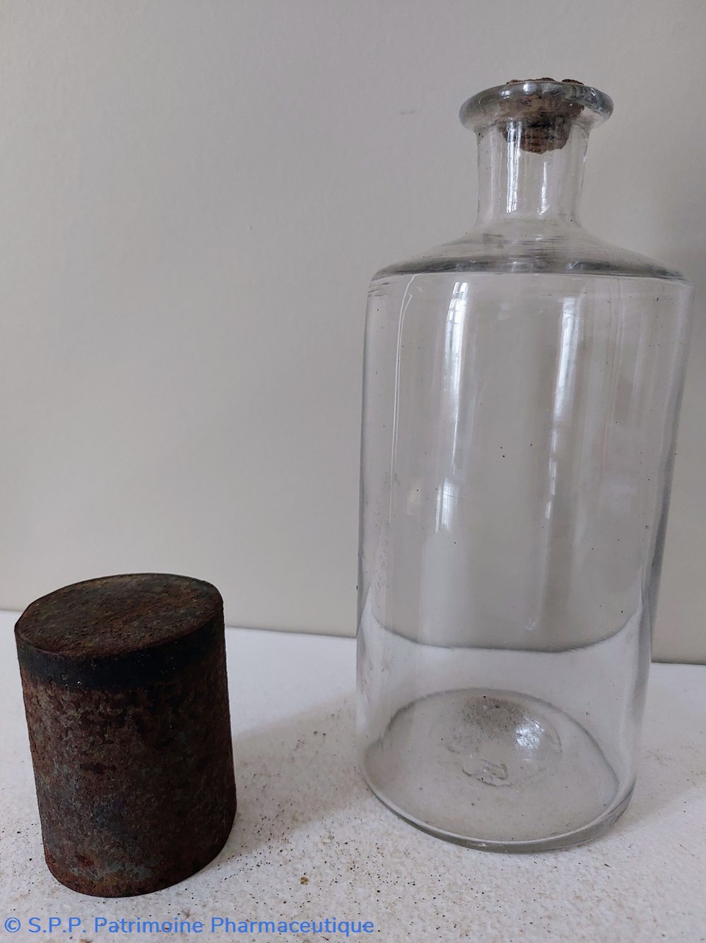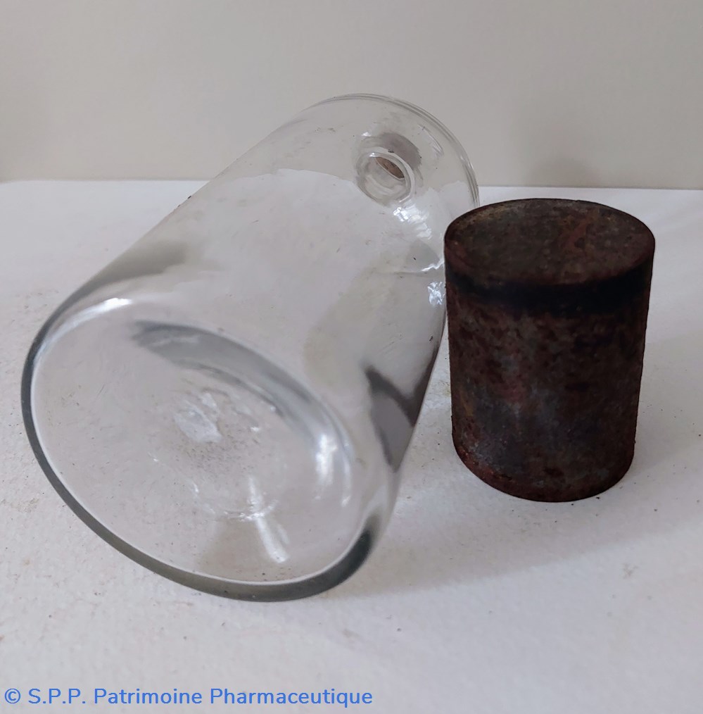 Flacon de Pharmacie vide Hauteur 19 cm Diamètre base 8.5 cm. Hauteur du col 3.5 cm Diamètre du goulot 3 cm