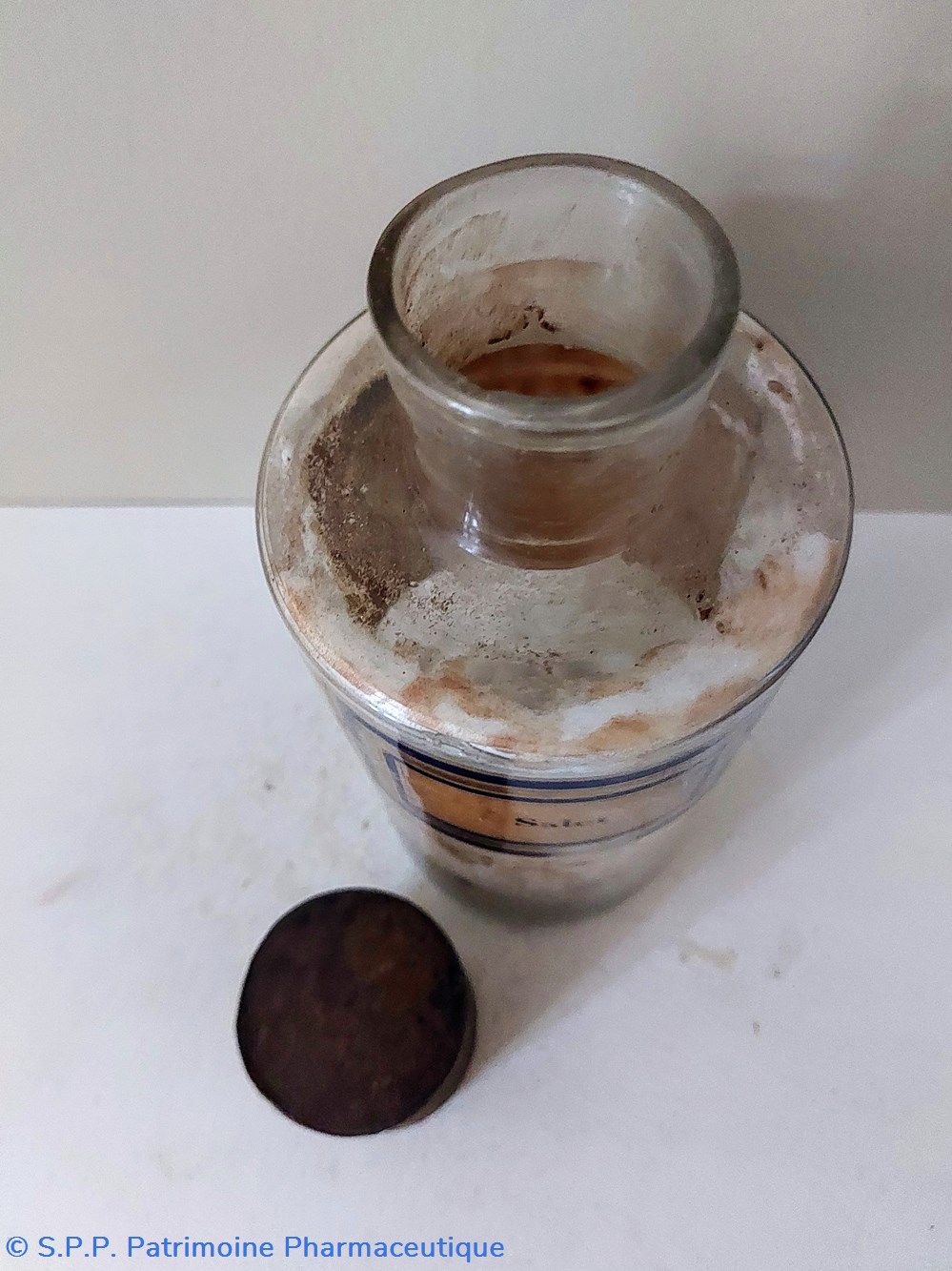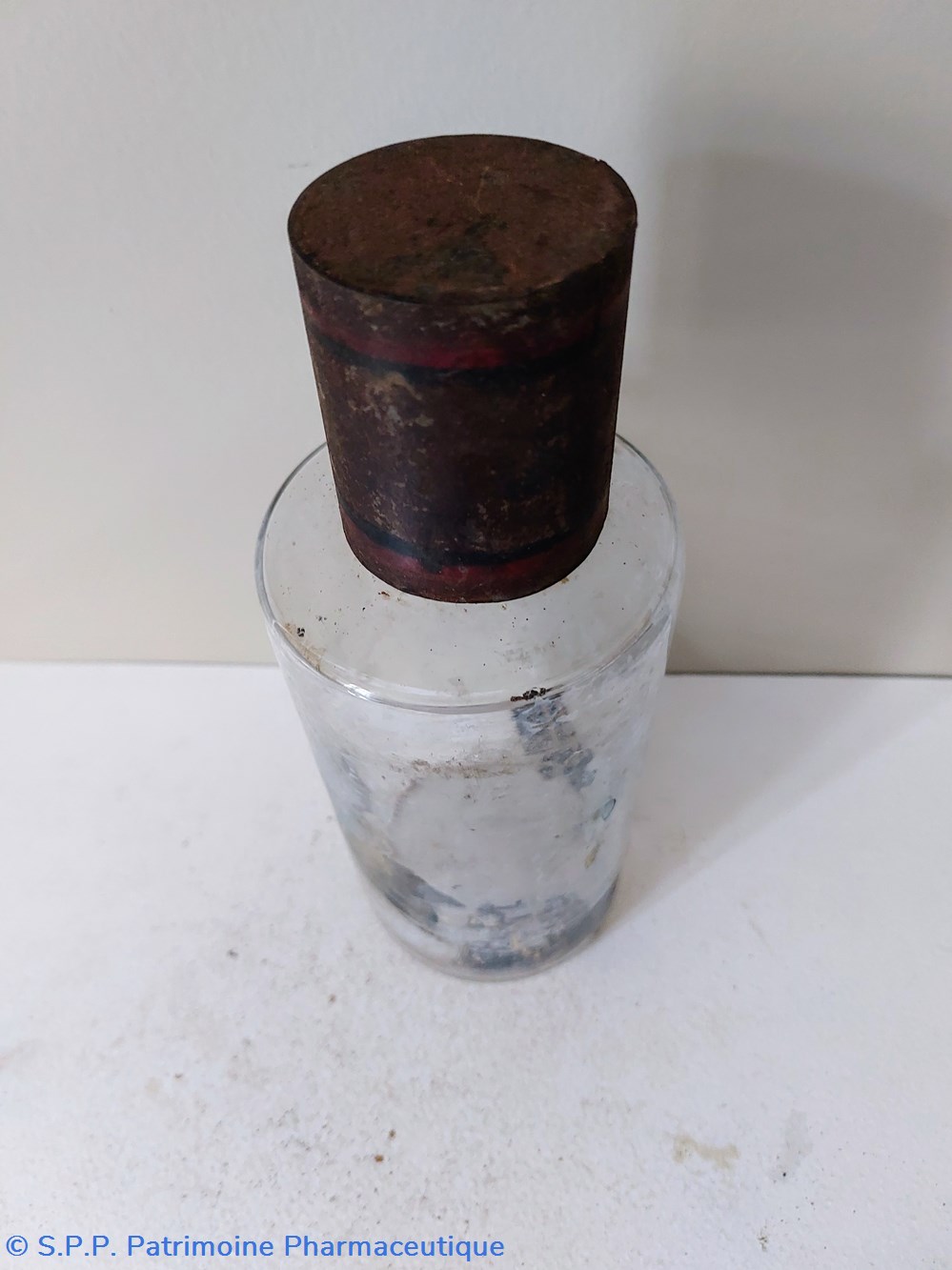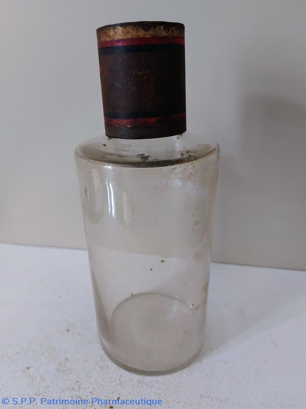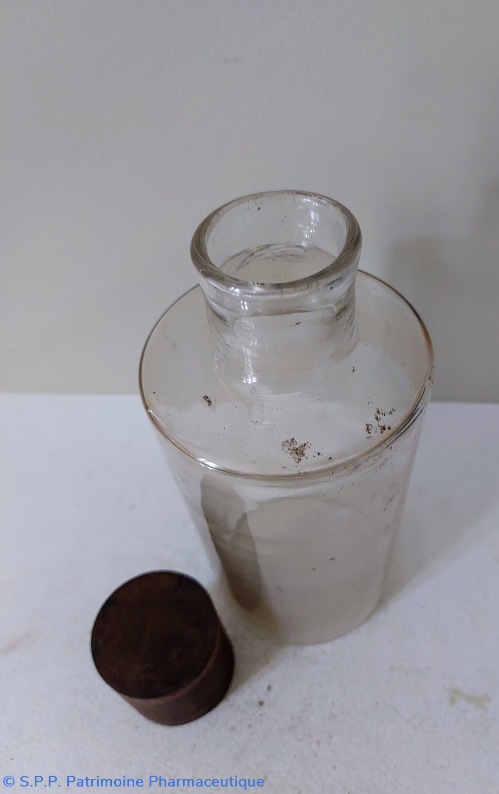 Flacon de Pharmacie vide Hauteur 19 cm Diamètre base 8.5 cm. Hauteur du col 3.5 cm Diamètre du goulot 3 cm