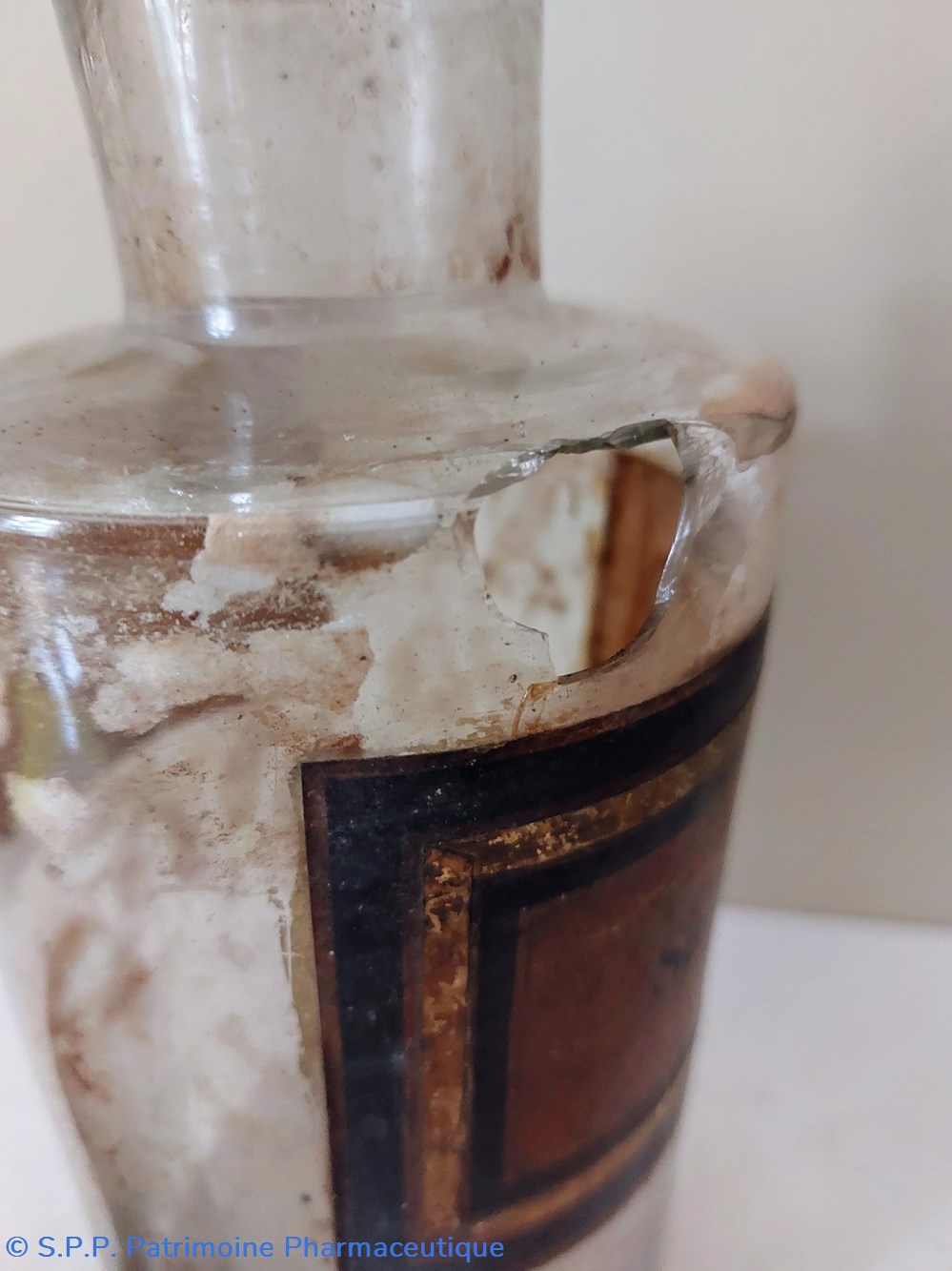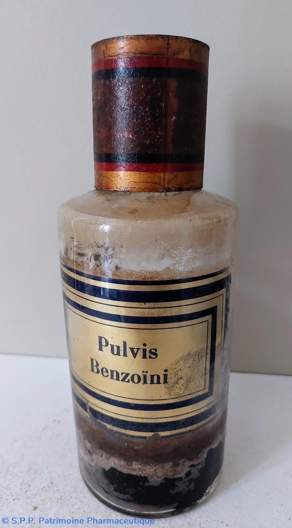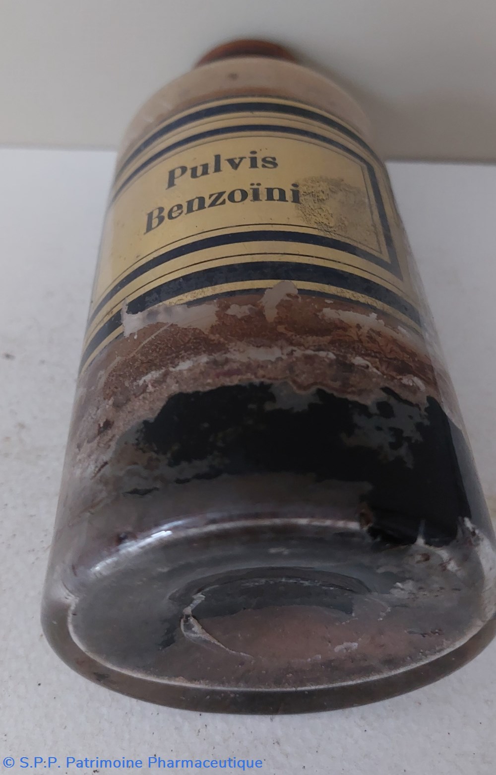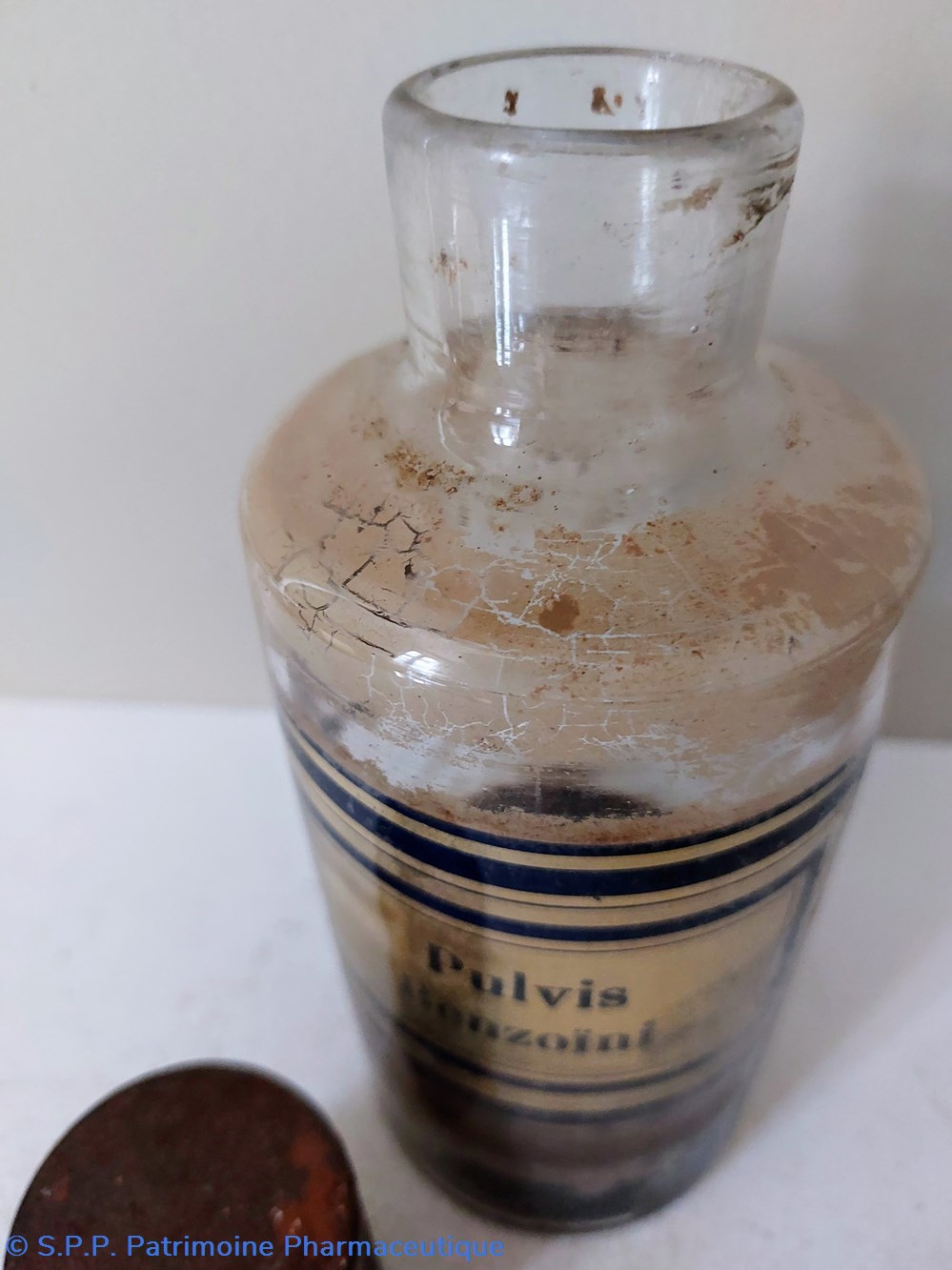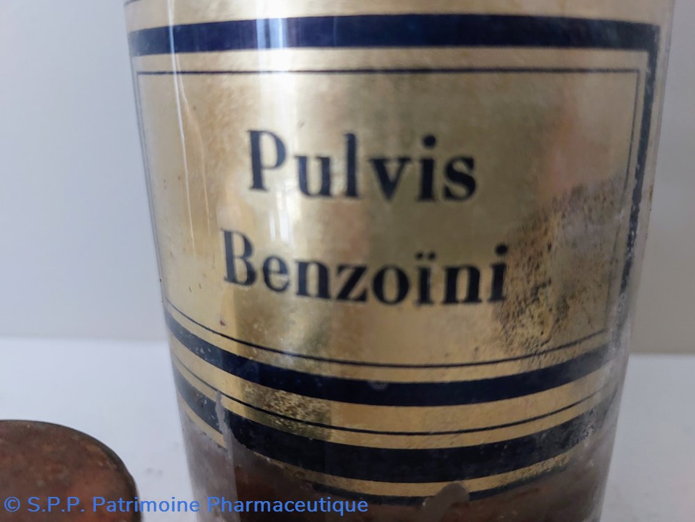 Flacon de Pharmacie vide en verre blanc. Étiquette fond or encadrement noir " PULVIS BENZOÏNI"