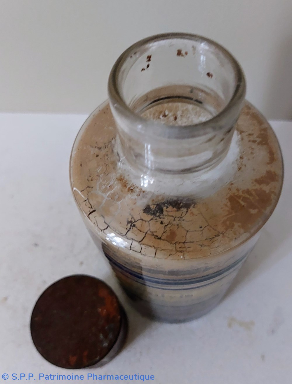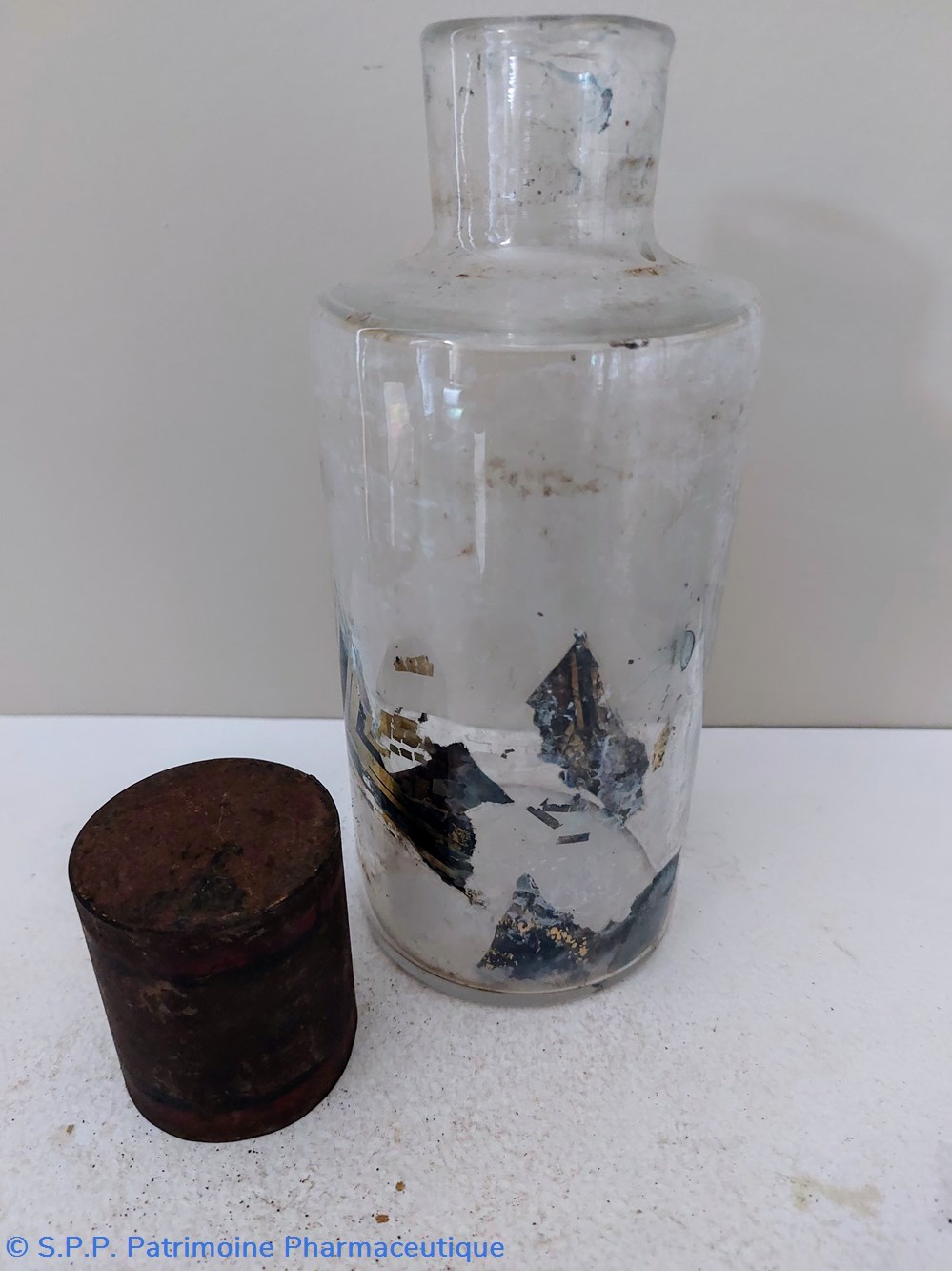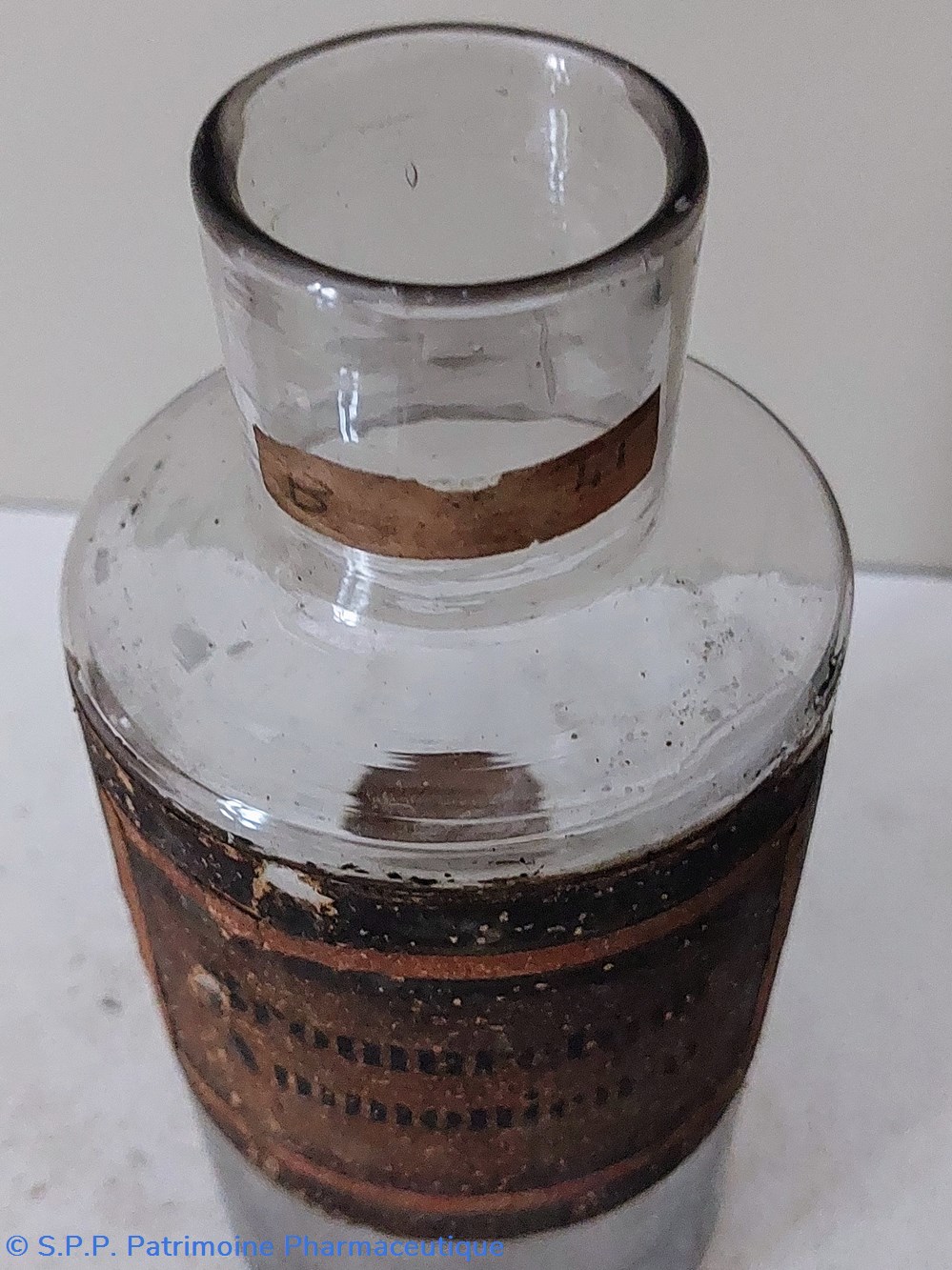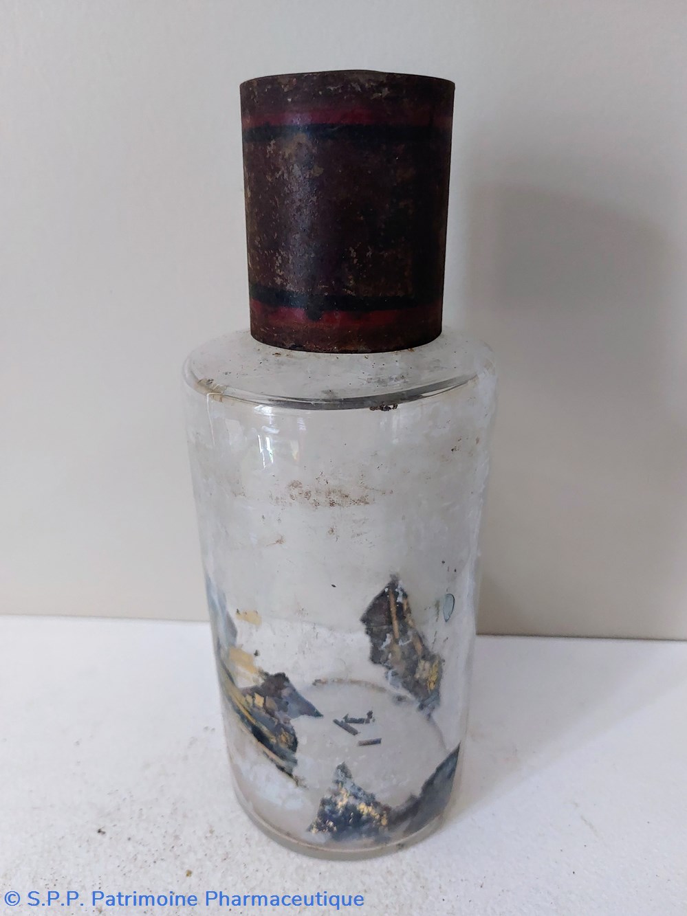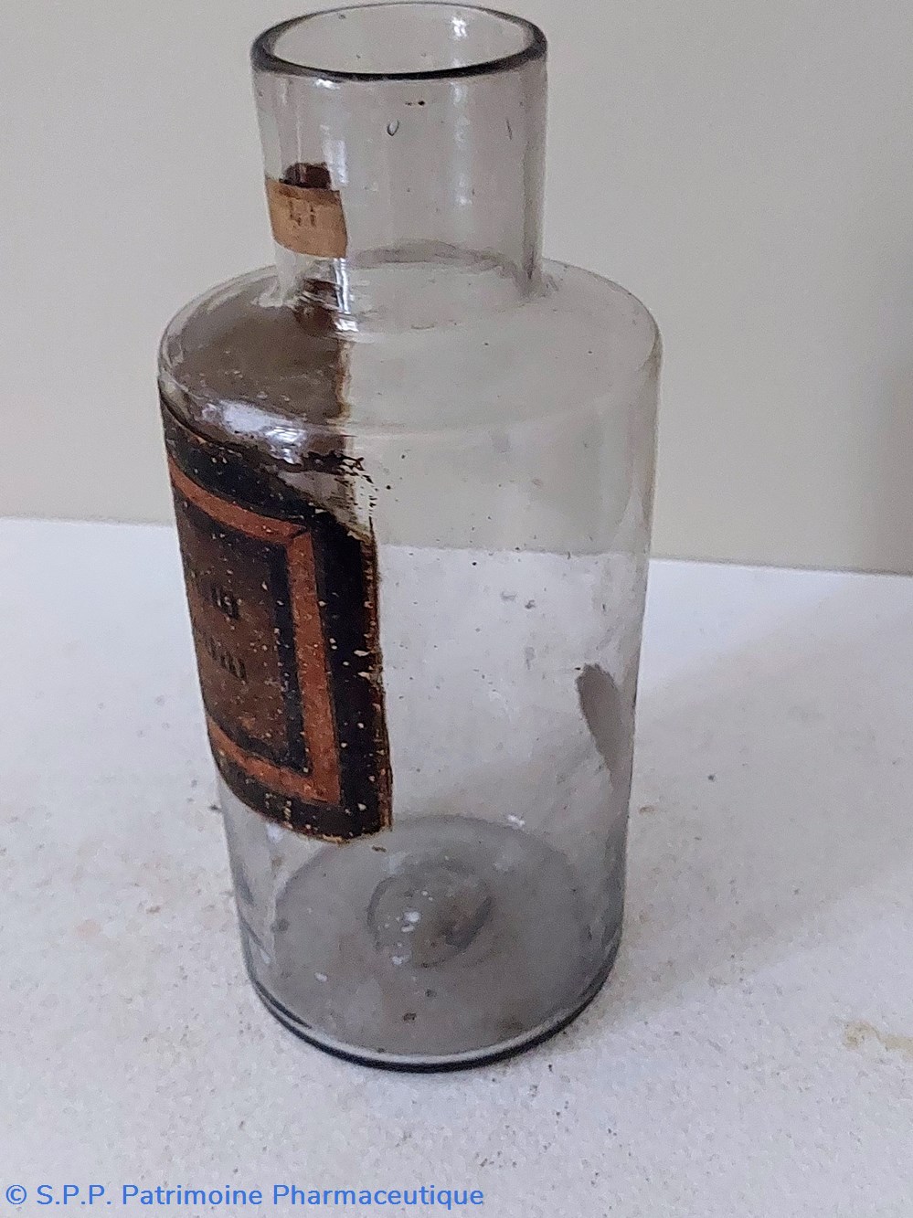 Flacon de Pharmacie vide en verre blanc. Étiquette fond or encadrement noir " PULVIS BENZOÏNI"