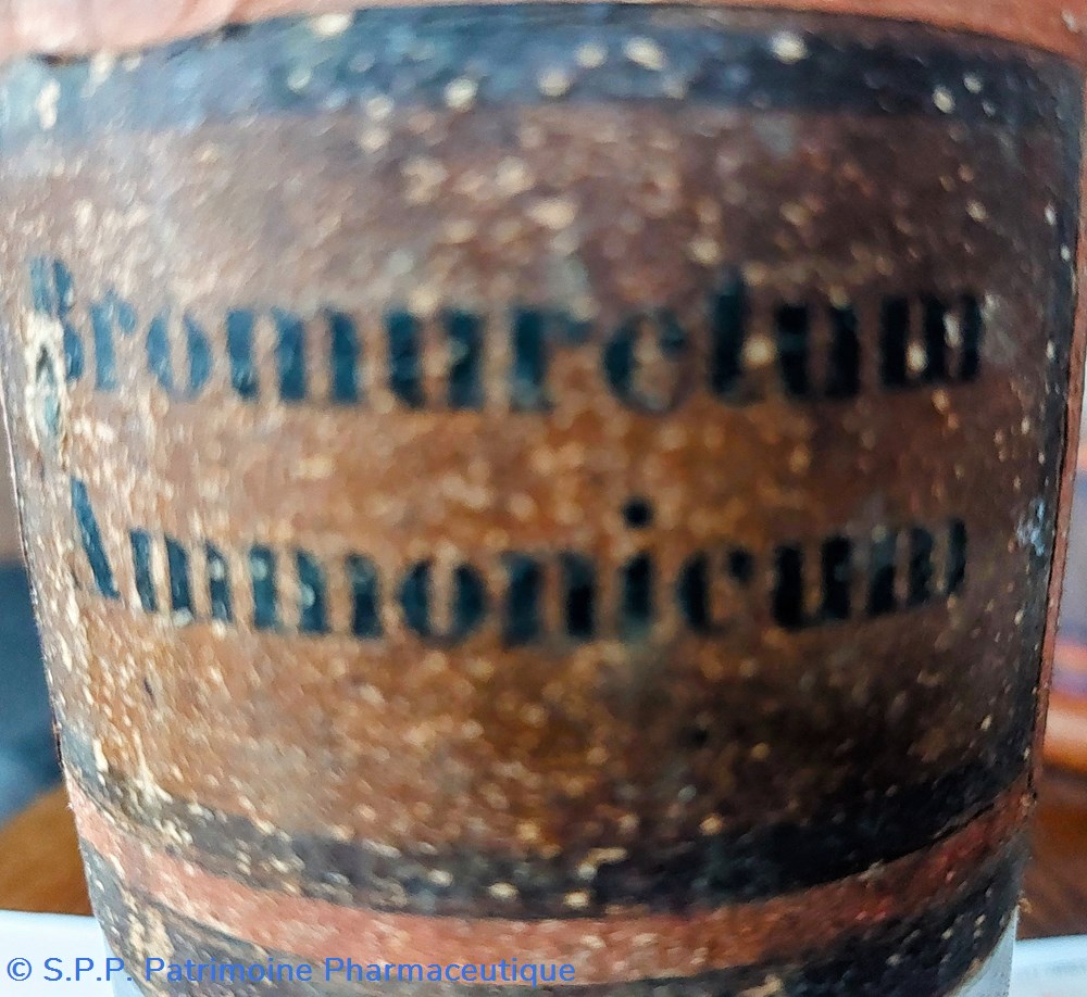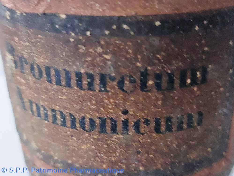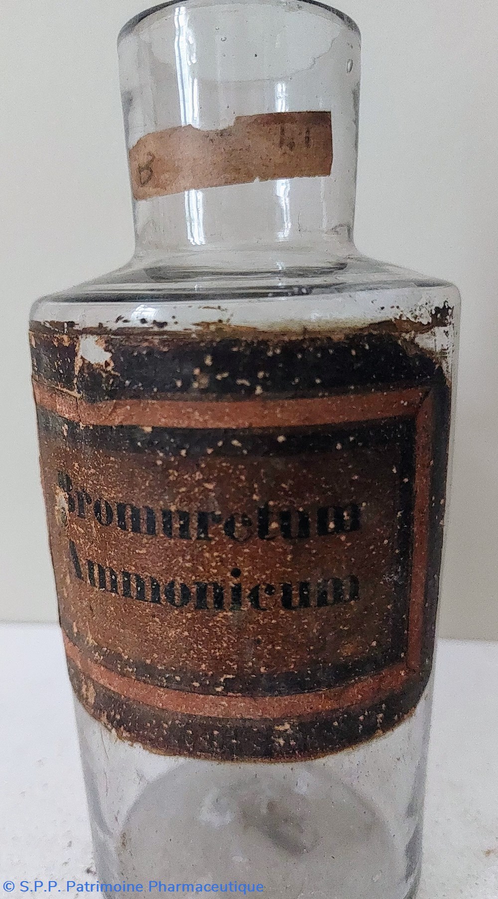 Flacon vide en verre blanc portant une étiquette ternie fond or encadrement noir et or " BROMURETUM AMMONICUM"