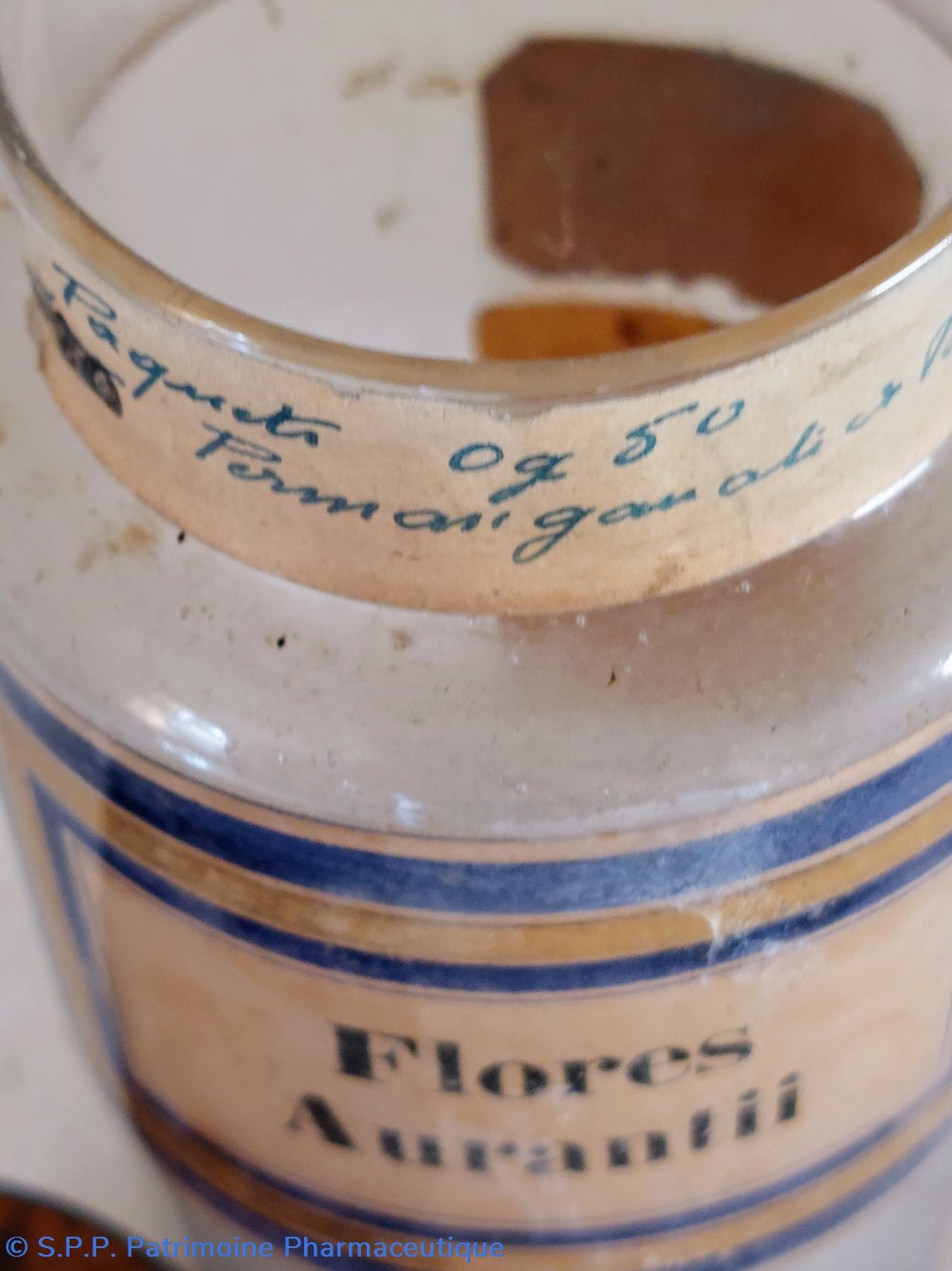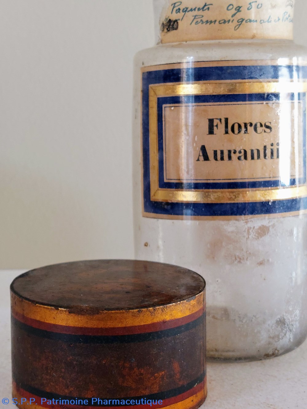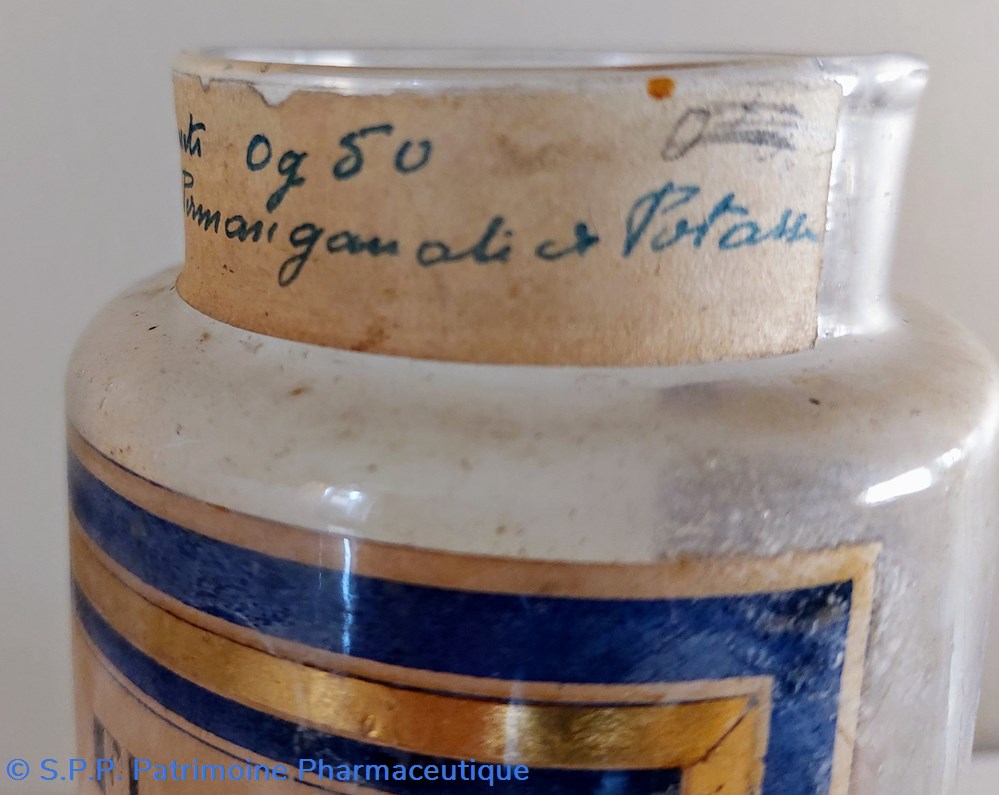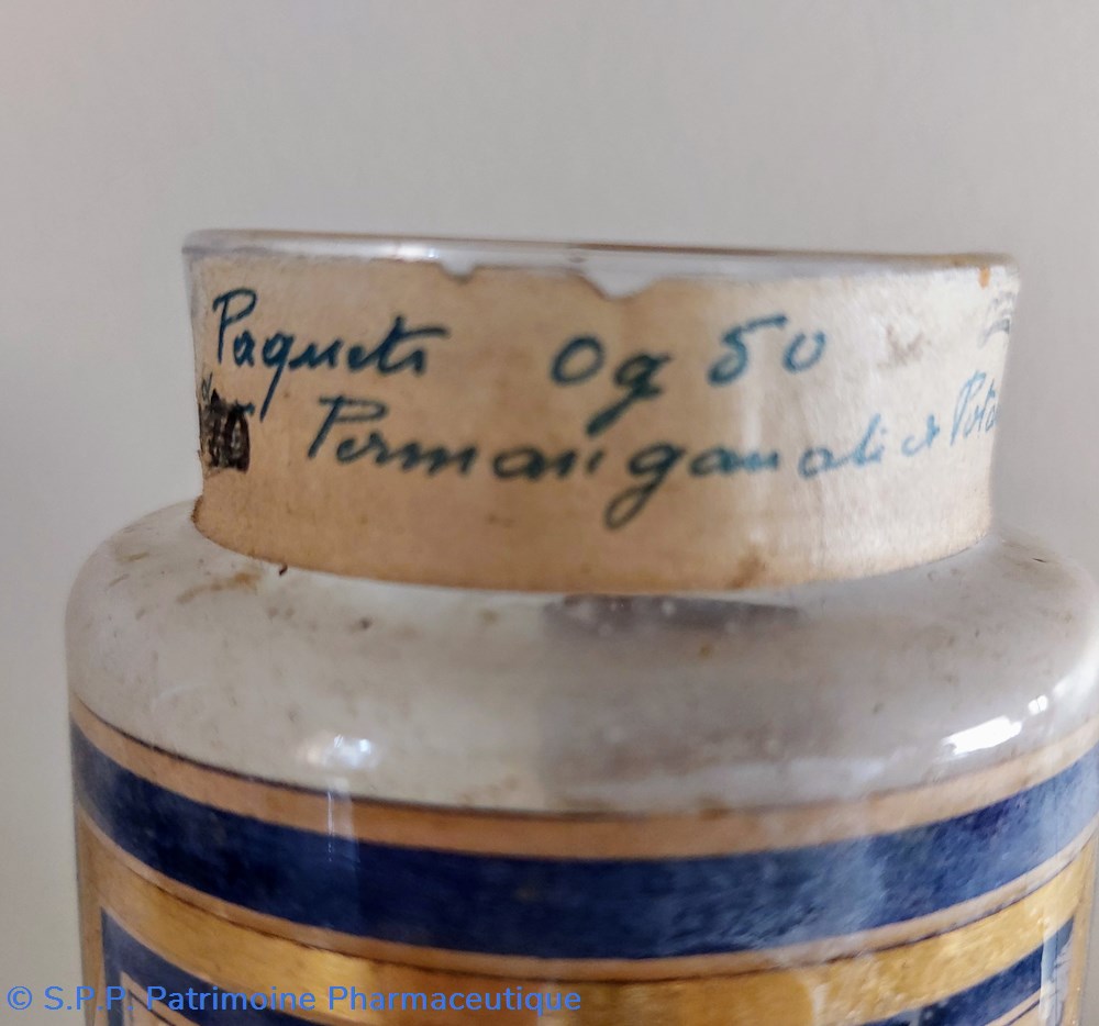 Étiquette manuscrite "Paquets 0 gr 50 Permanganate et potasse"