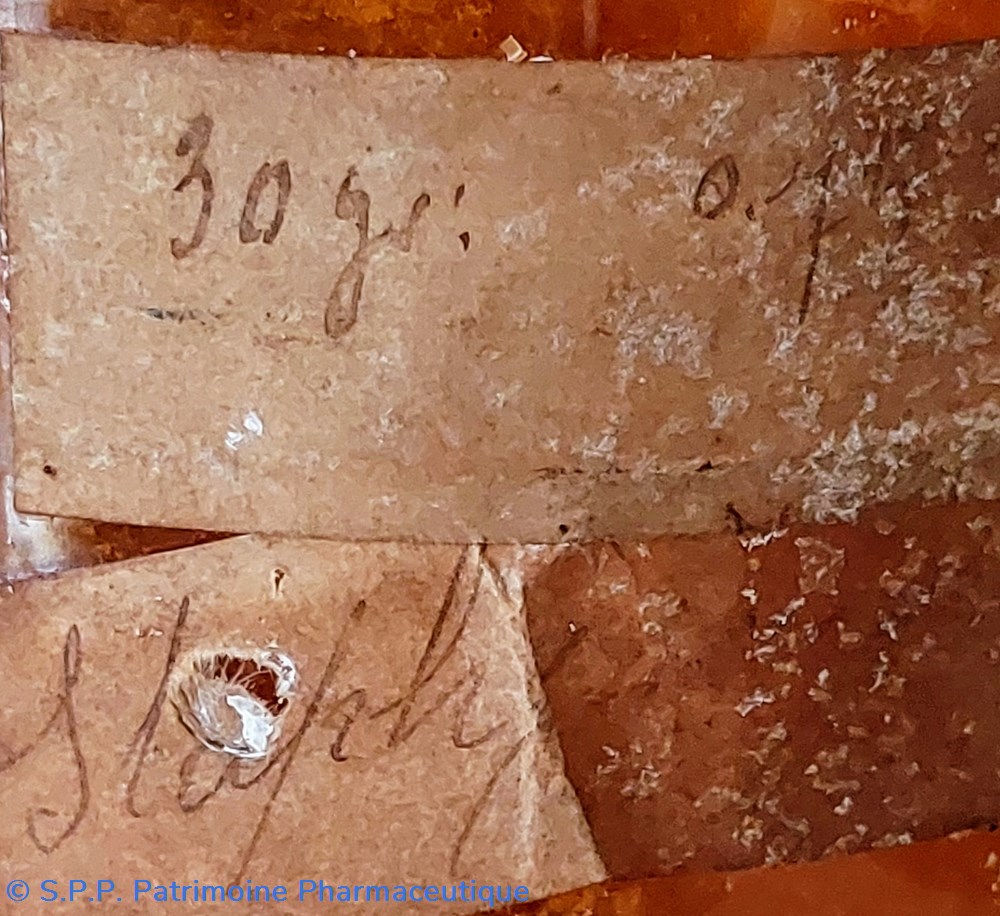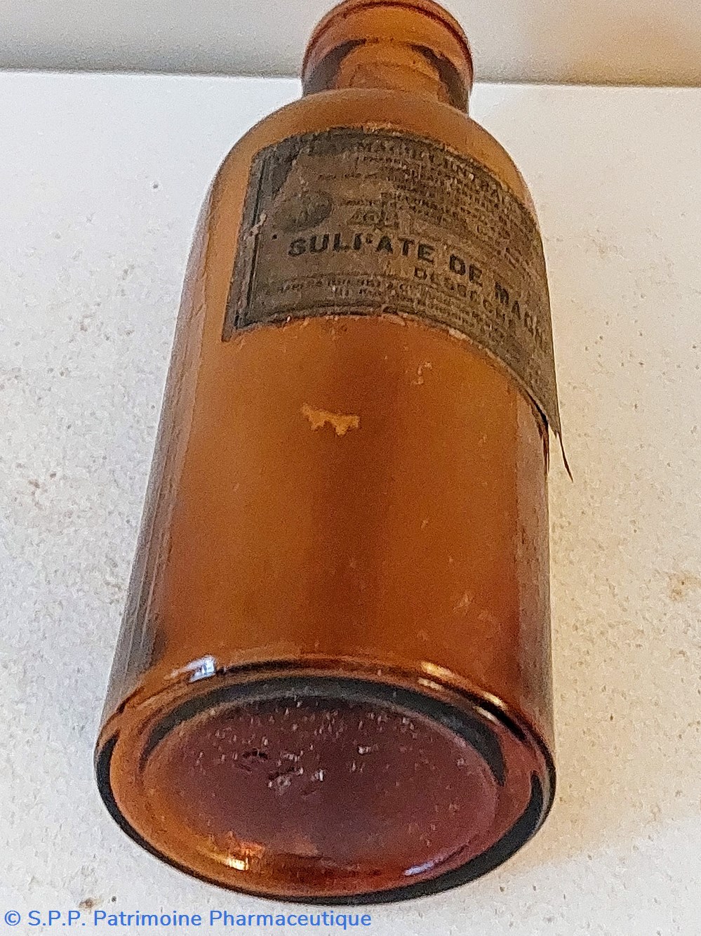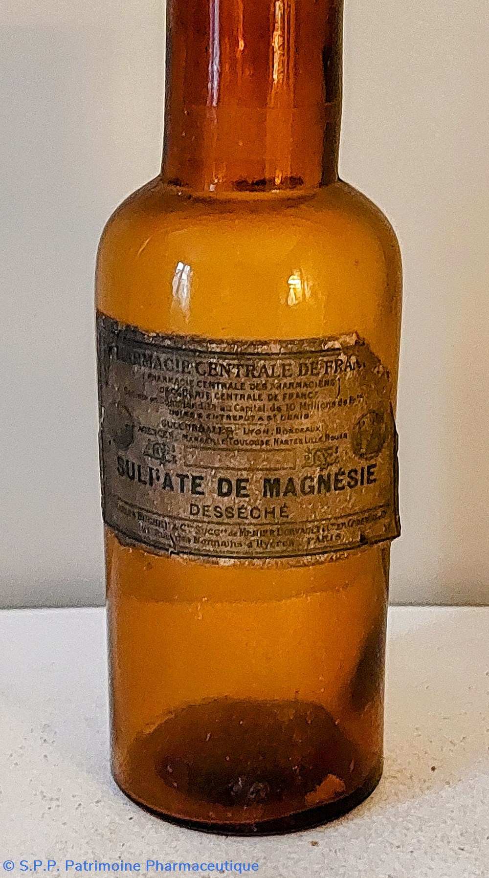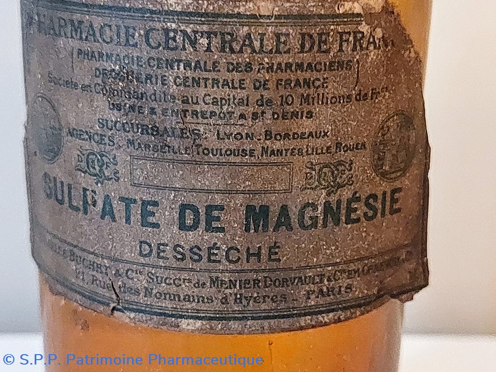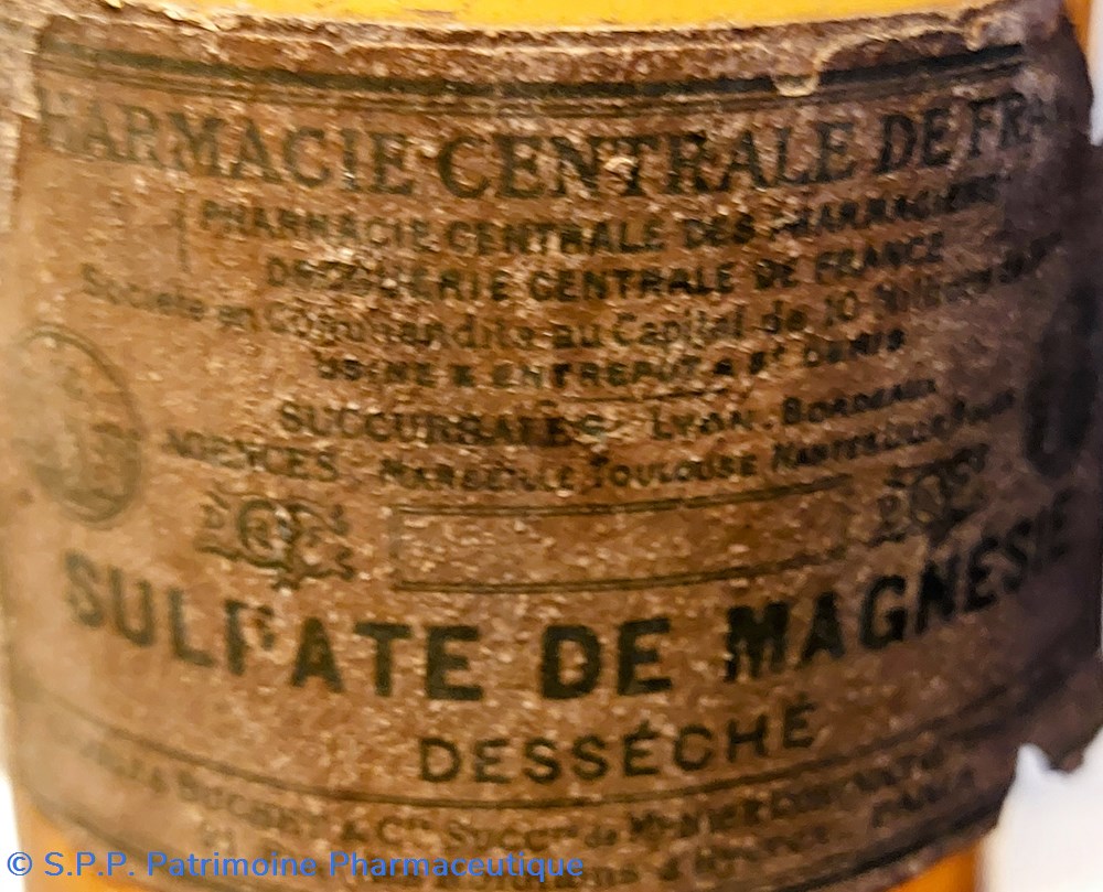 Étiquette peu lisible " SULFATE DE MAGNÉSIE Desséché" Pharmacie Centrale de France