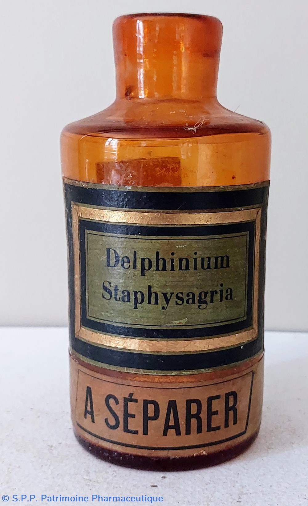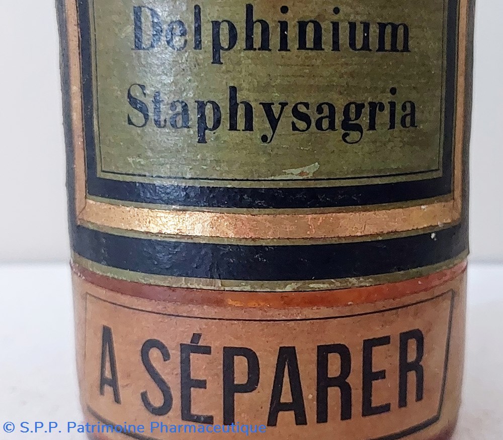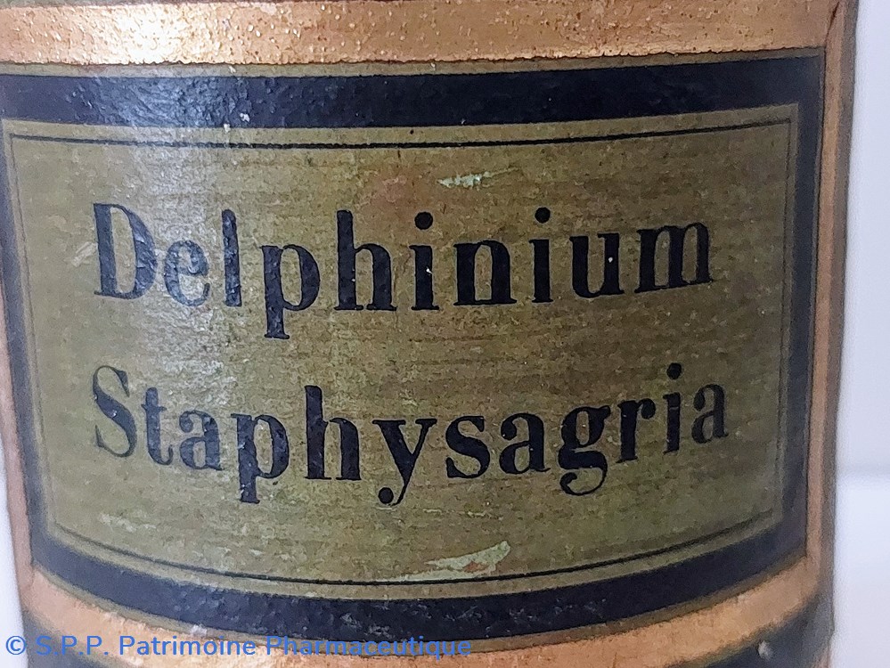 Étiquette fond vert encadrement noir et or " Delphinium Staphysagria"