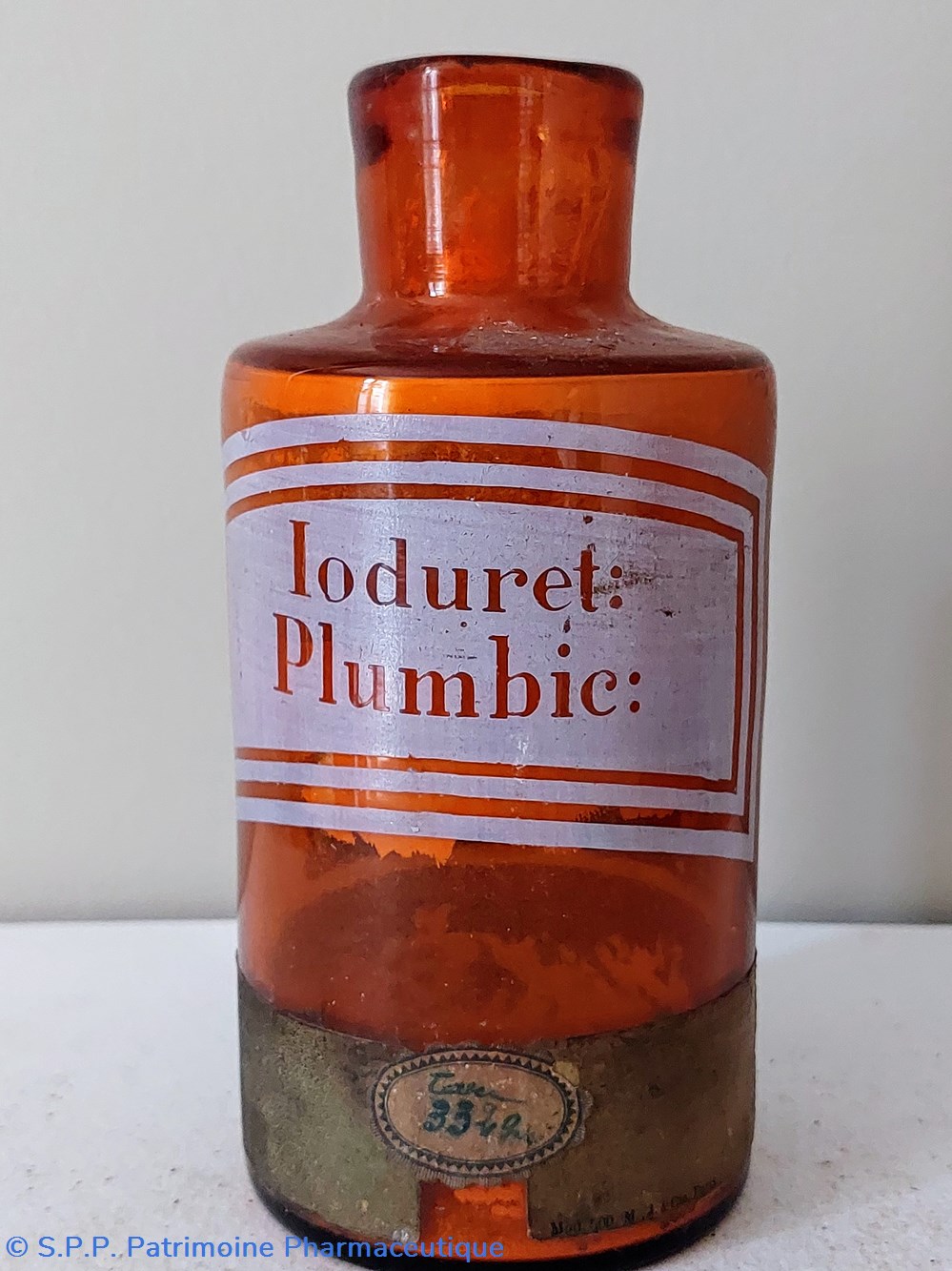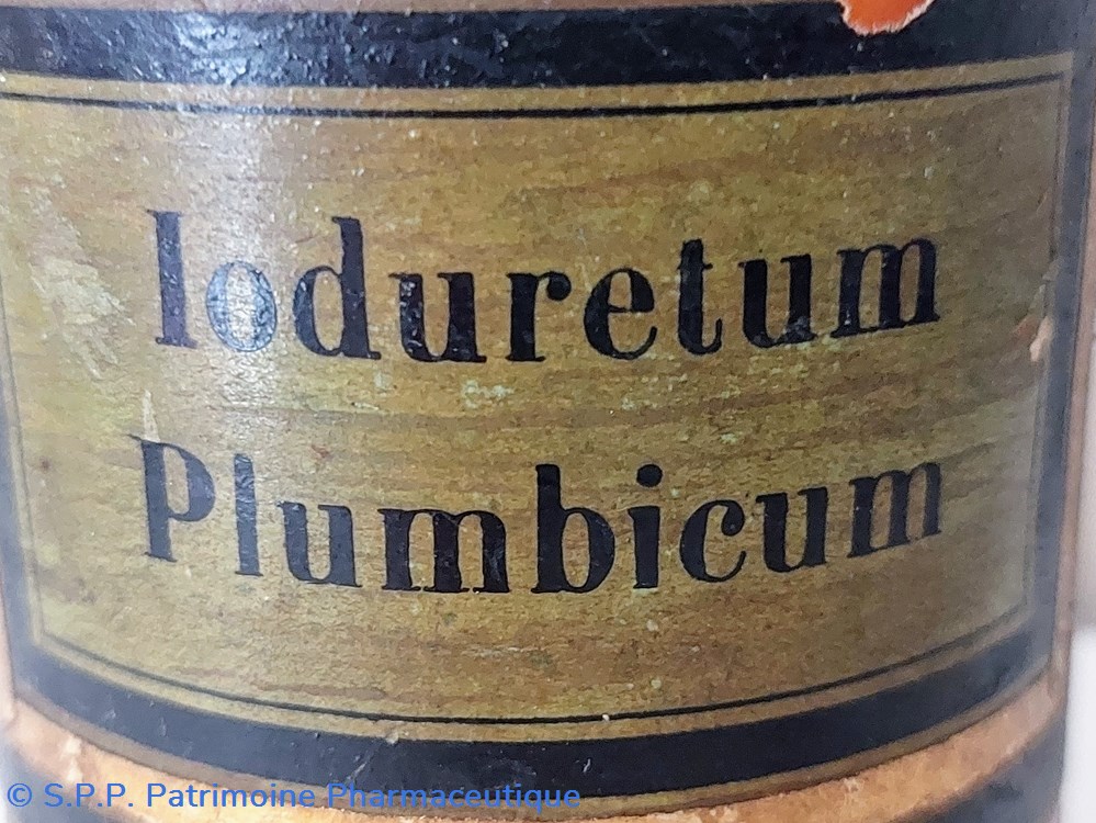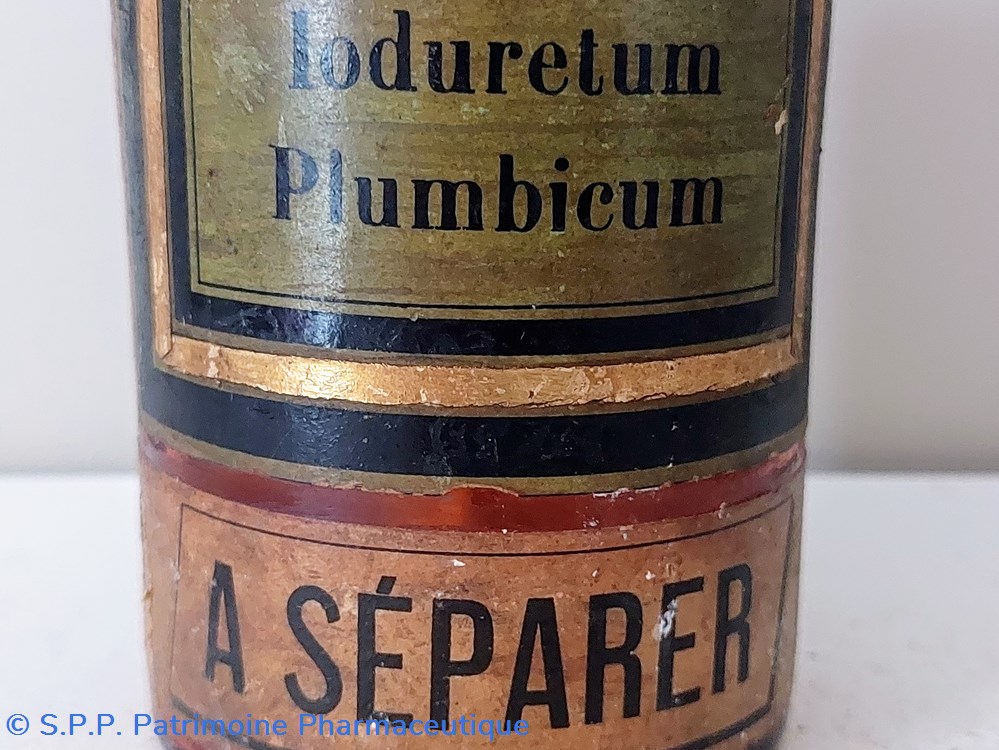 Autre étiquette imprimée blanche façon écran de soie et lettres transparentes " Ioduret : Plumbic :