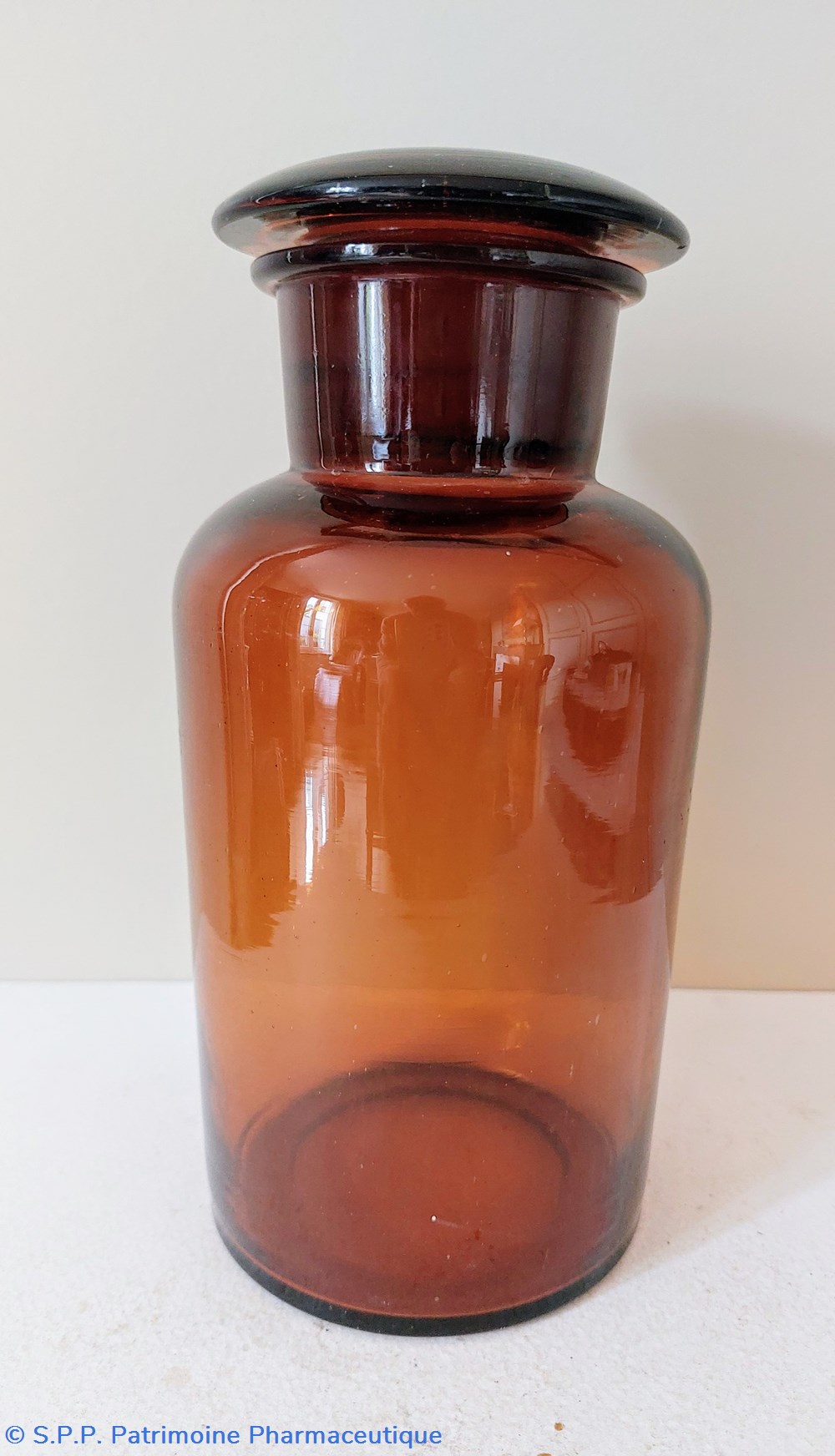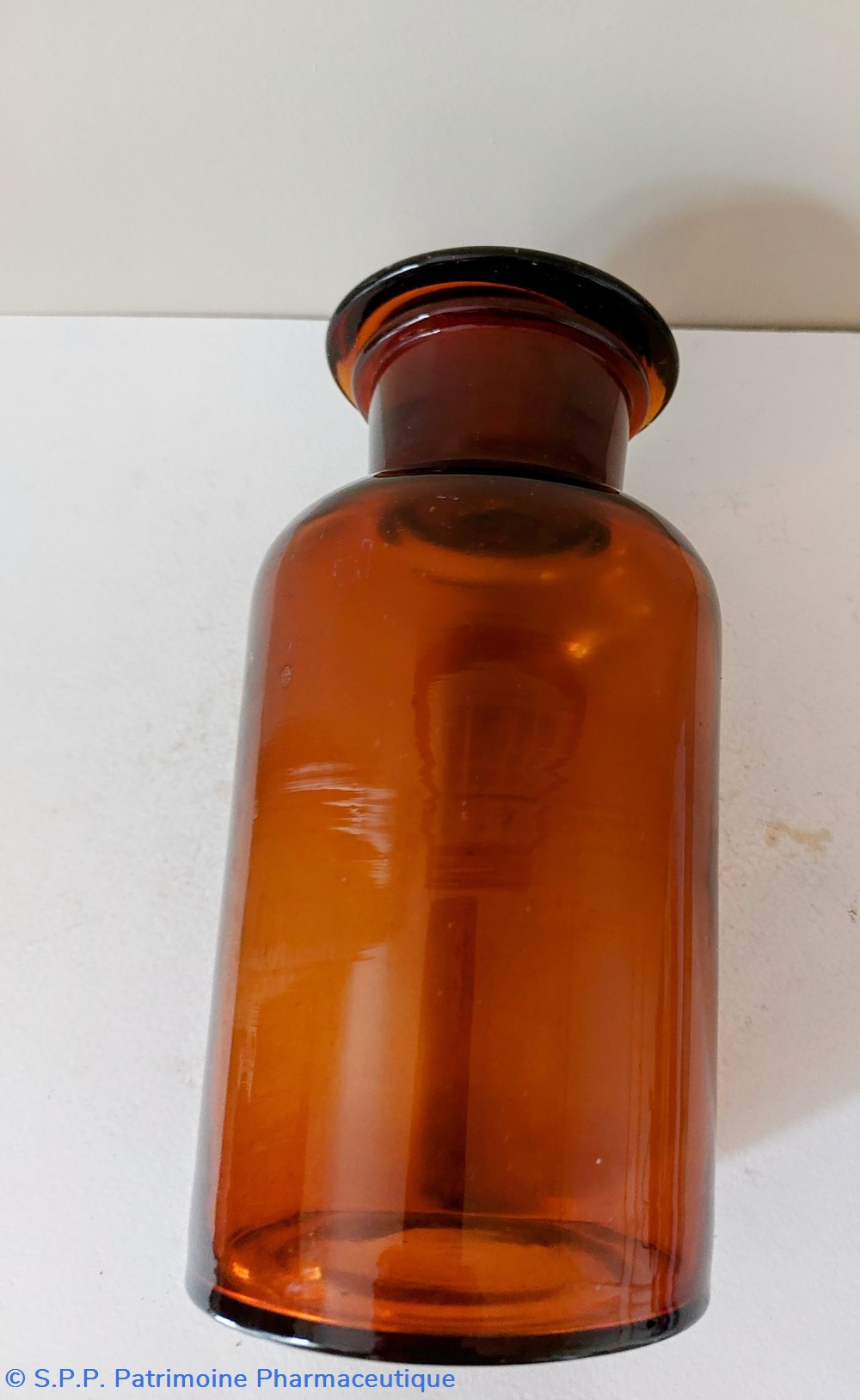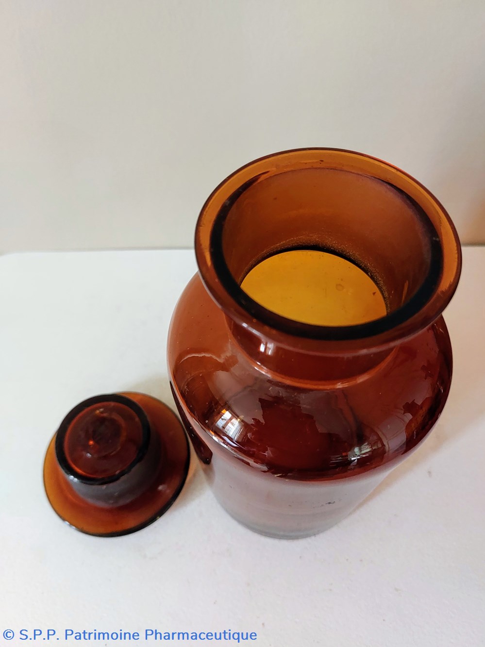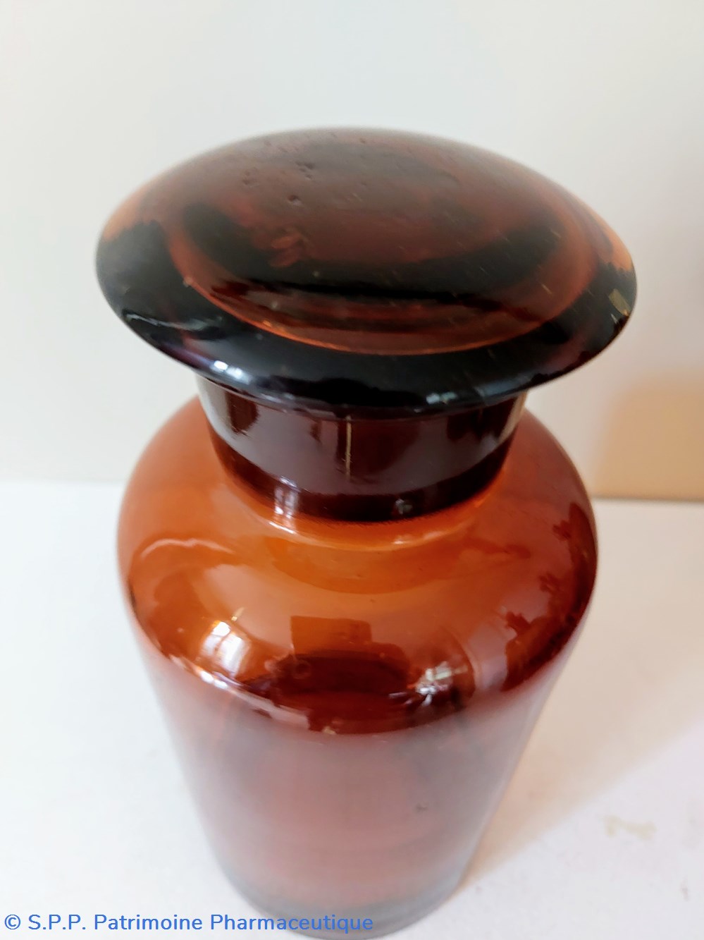 Gros Flacon vide en verre ambré mesurant 21 cm de haut avec son gros bouchon fermé à l'émeri.