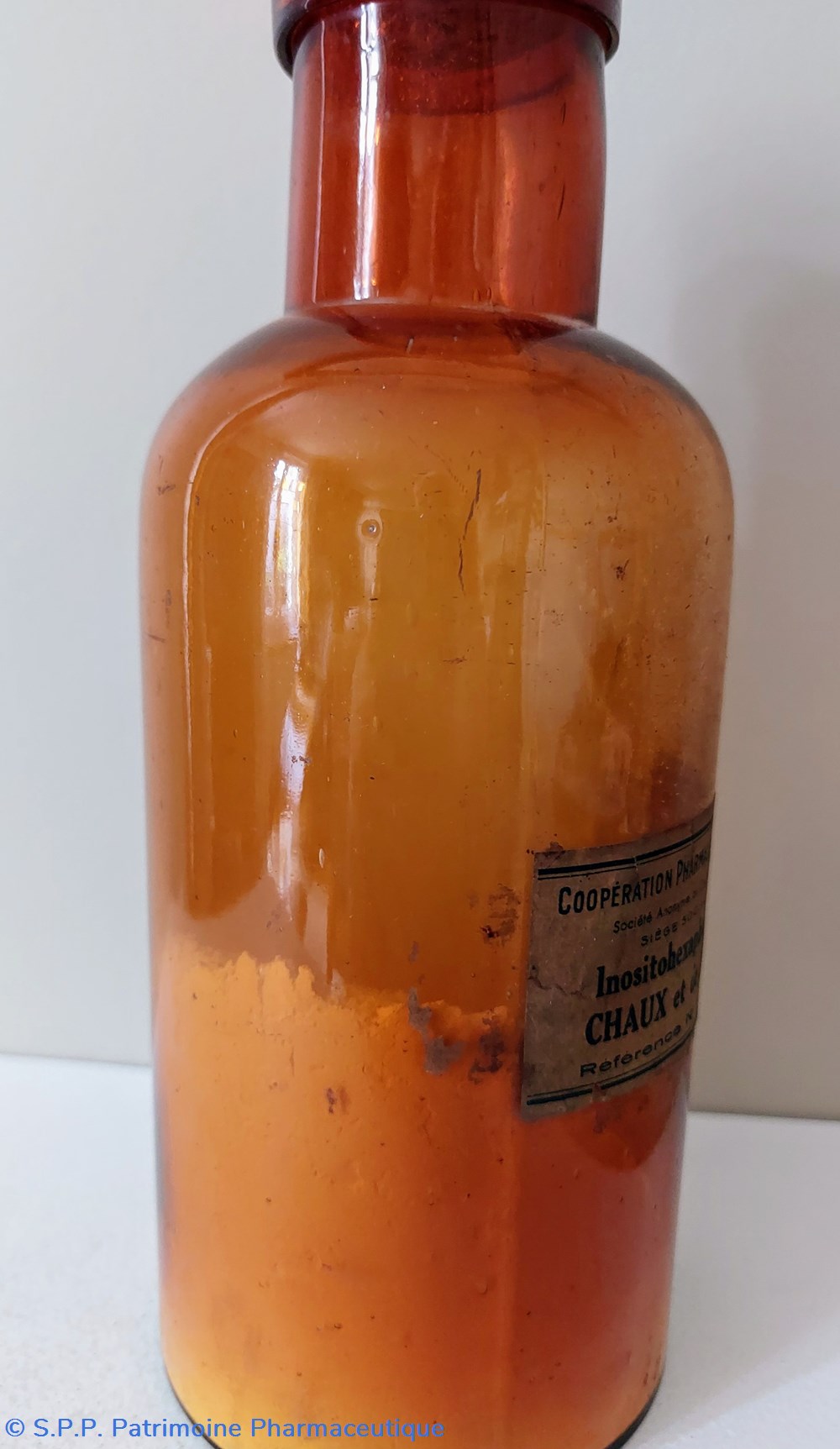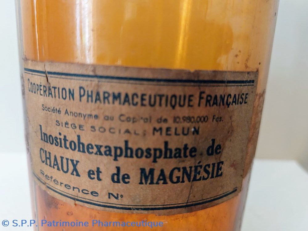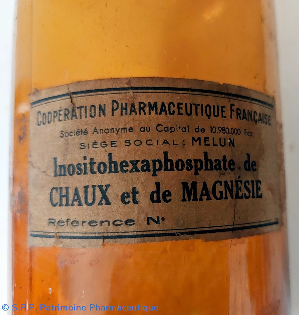 Flacon en verre ambré contenant de la poudre blanche " Inositohexaphosphate de CHAUX et de MAGNÉSIE"
