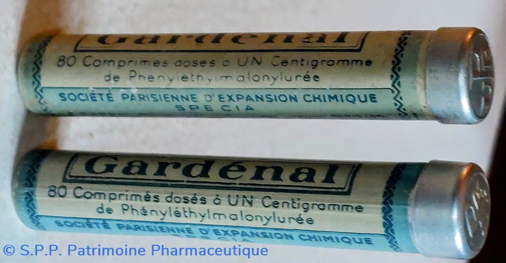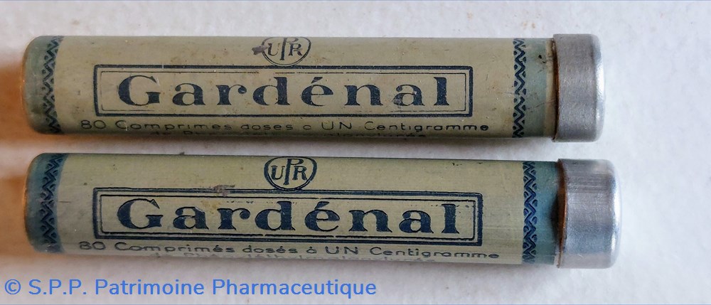 Lot de deux Petits tubes vides ayant contenu 80 comprimés dosés à Un cg de Phenyléthylmalonylurée