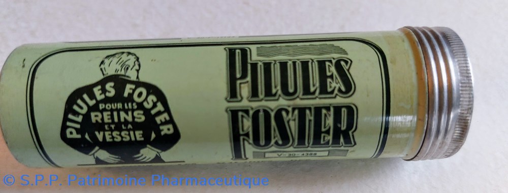 Tube métallique fermé par un bouchon à vis contenant des Pilules FOSTER Pour les maladies des reins et de sa la vessie.