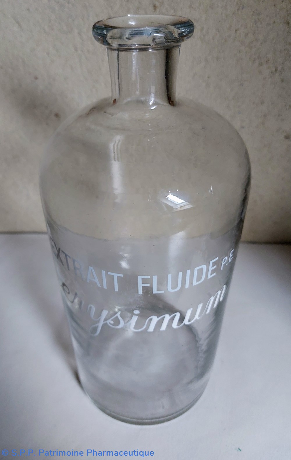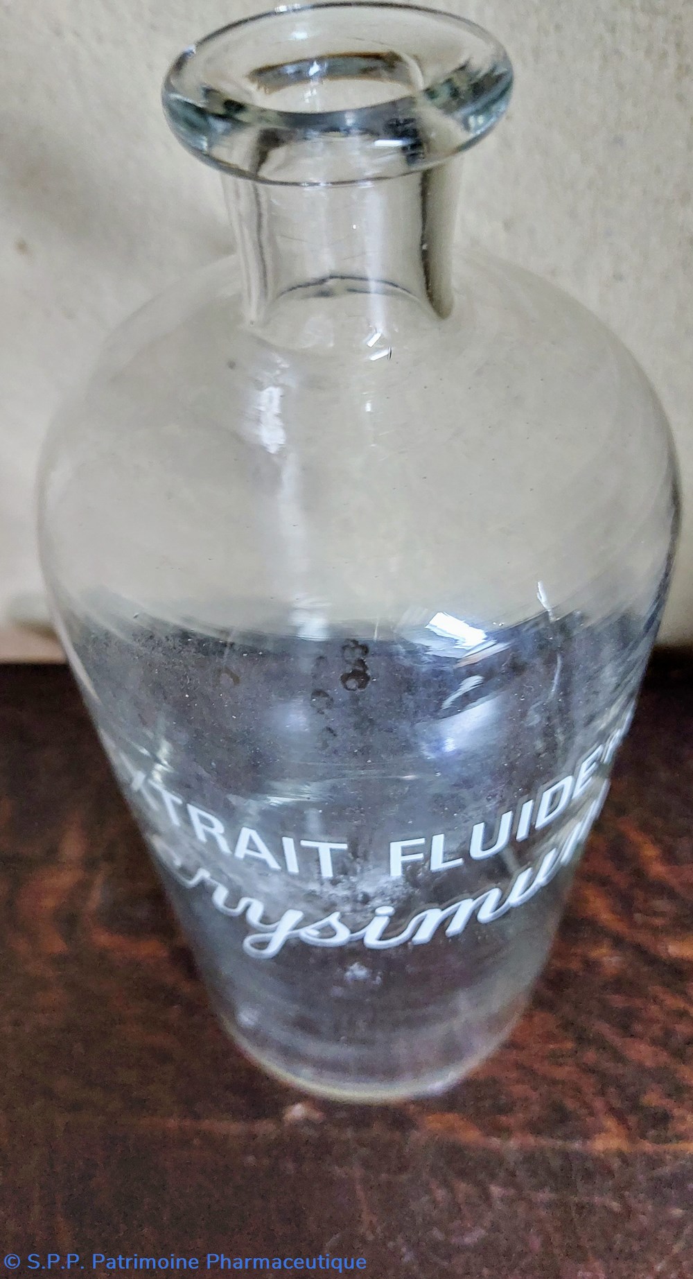 Flacon vide a1en verre transparent provenant de l'Etablissement de Ravitaillement Sanitaire des Armées ERSA. à Chartres.