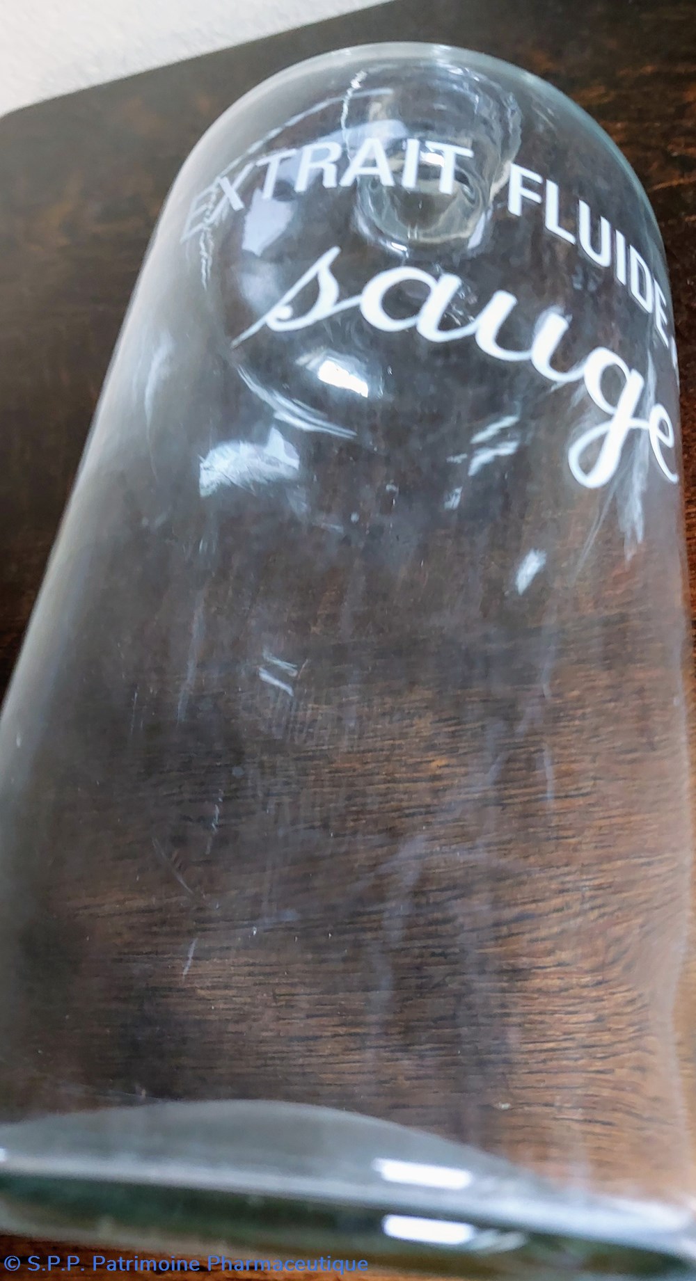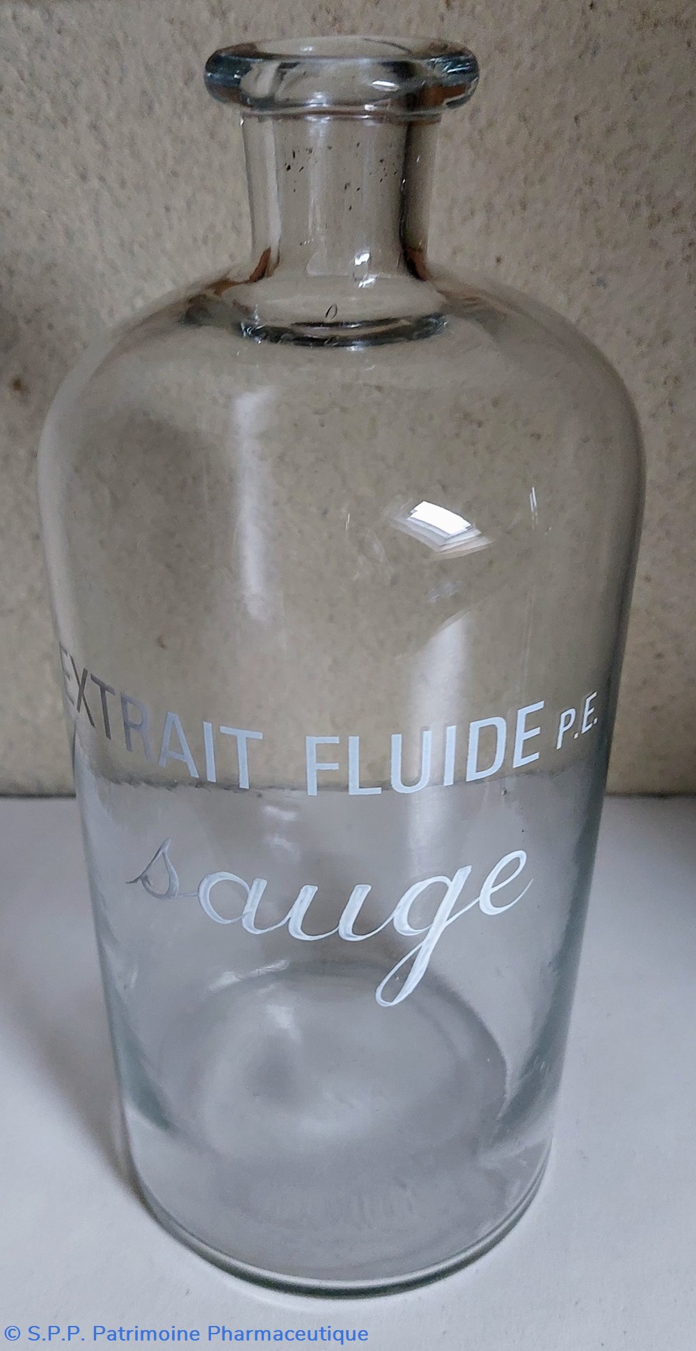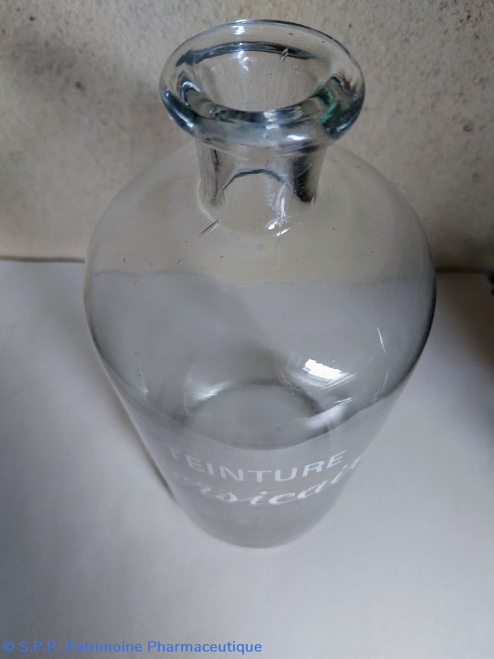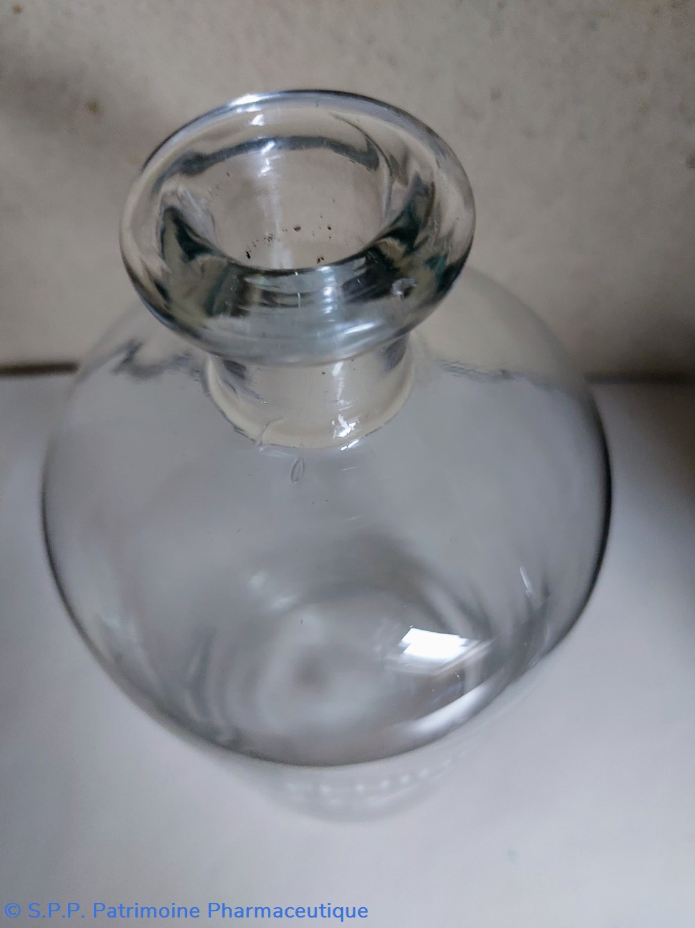 Flacon vide en verre transparent provenant de l'Etablissement de Ravitaillement Sanitaire des Armées "ERSA" à Chartres.