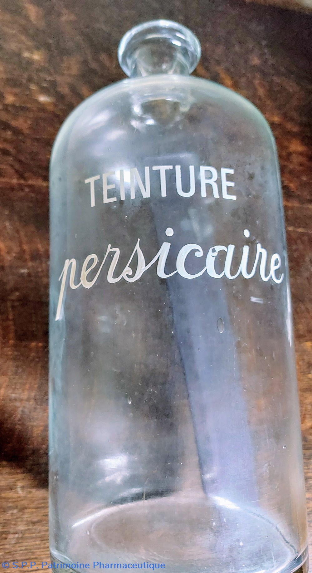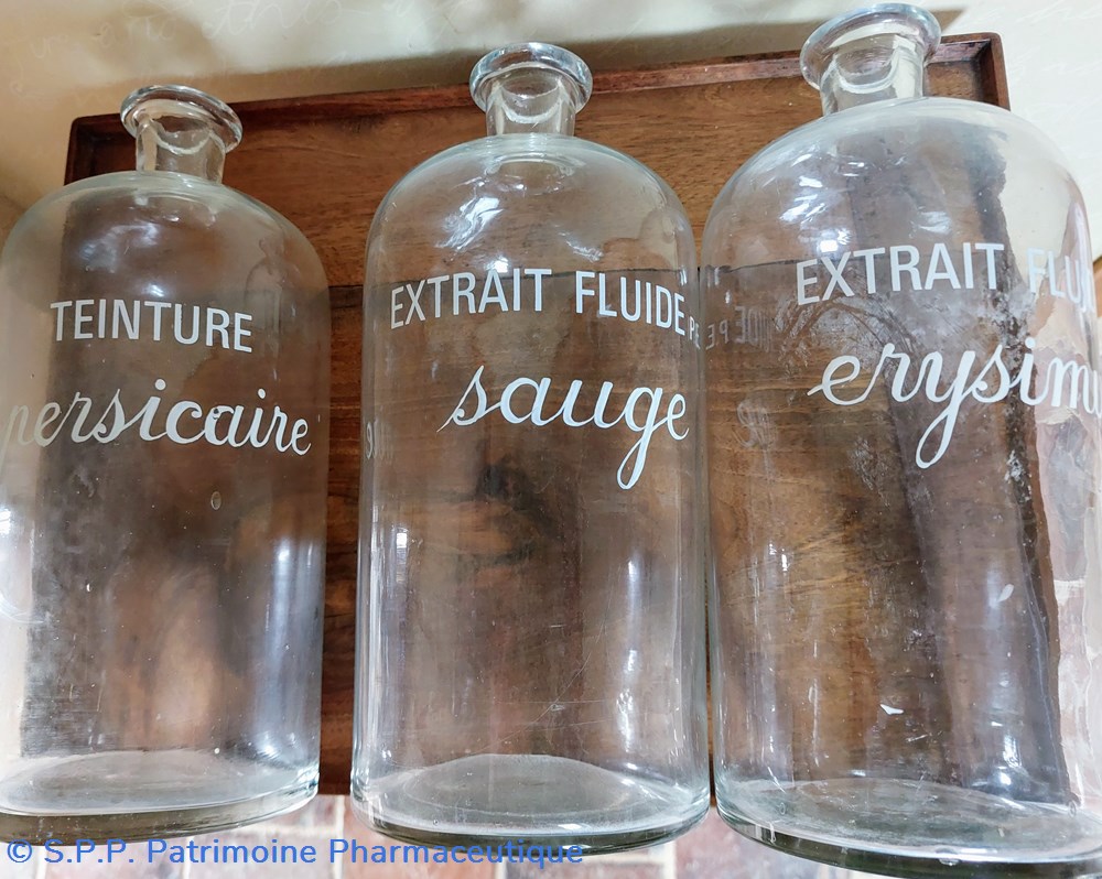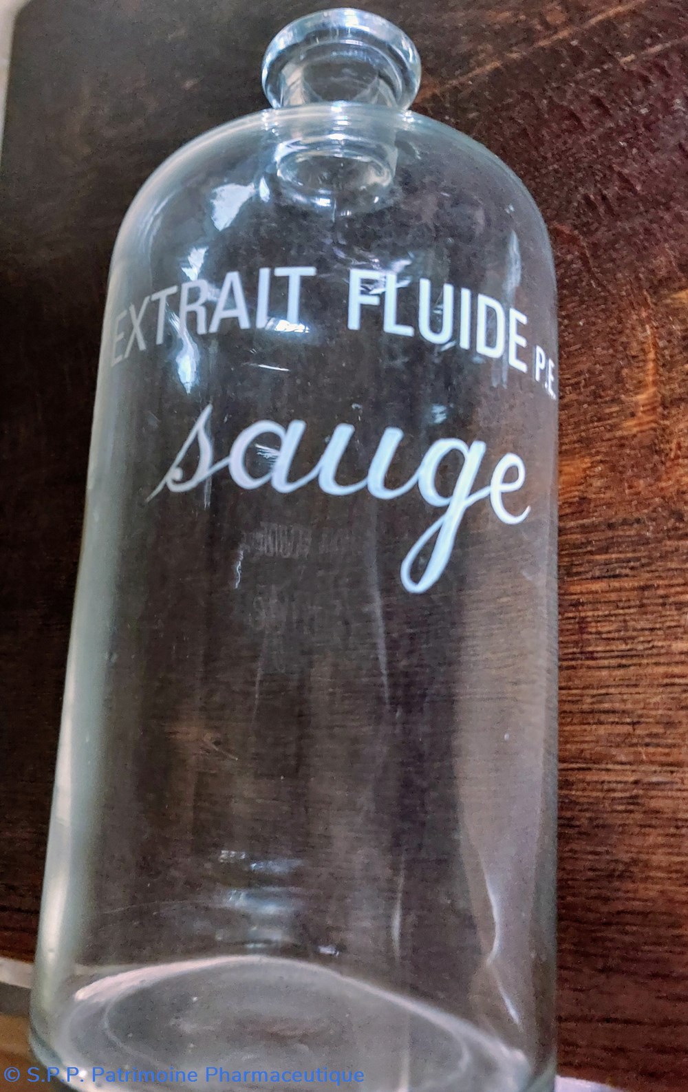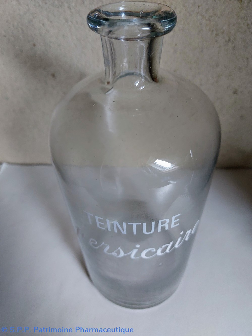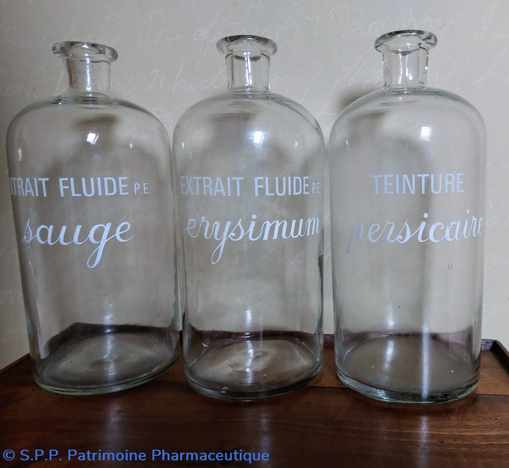 Flacon vide en verre transparent provenant de l'Etablissement de Ravitaillement Sanitaire des Armées "ERSA" à Chartres.