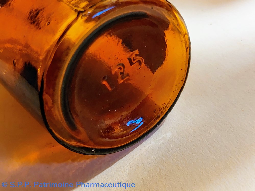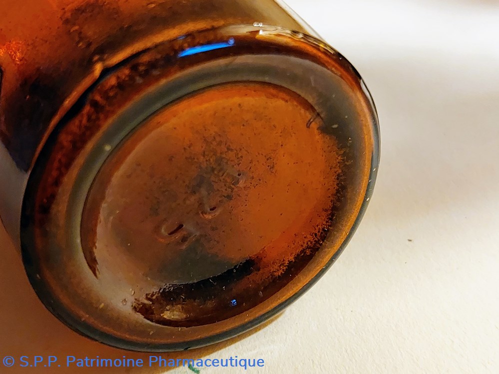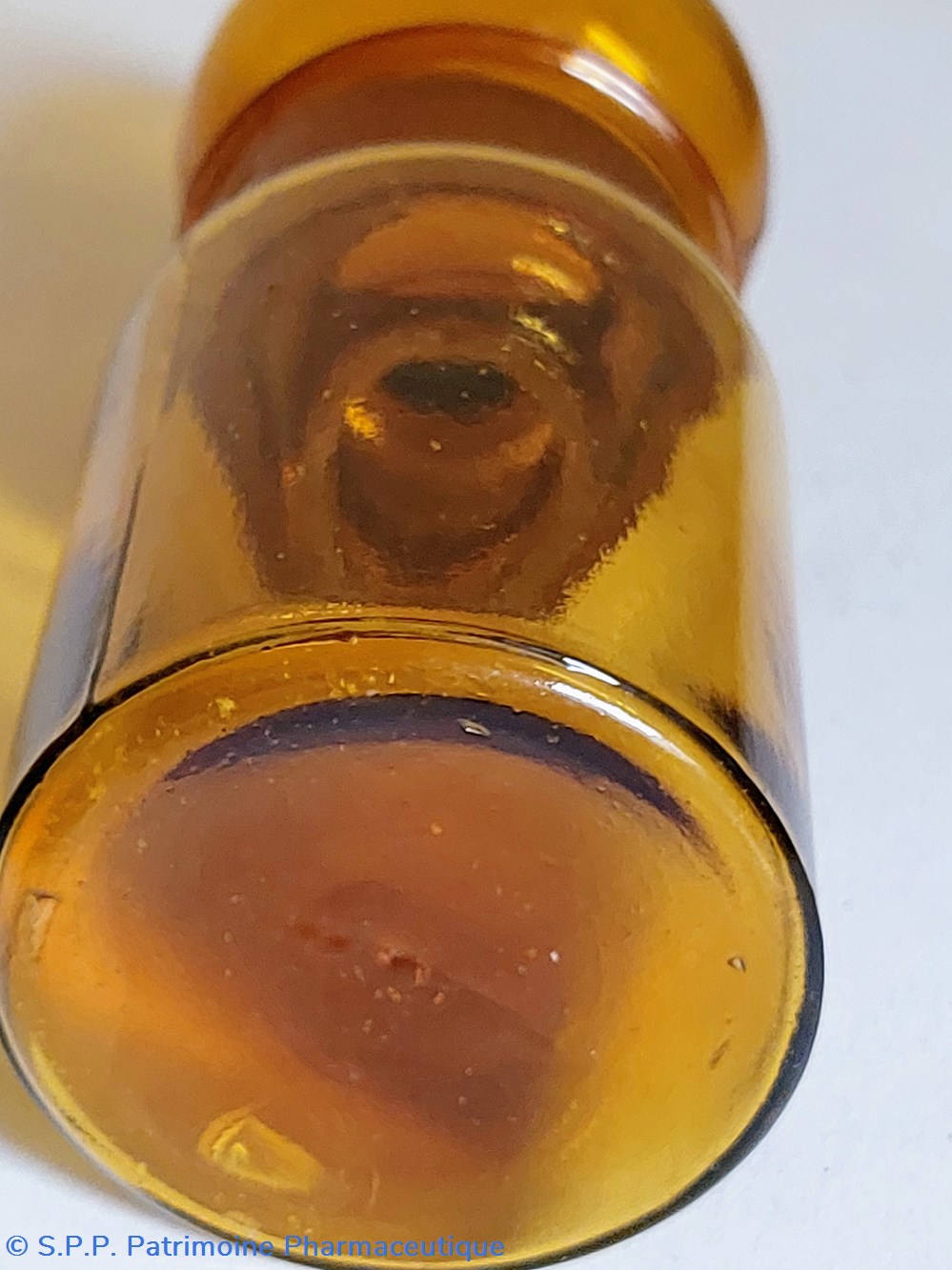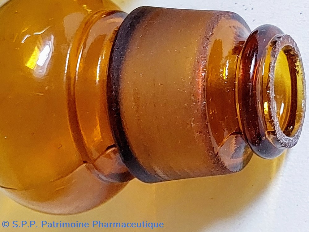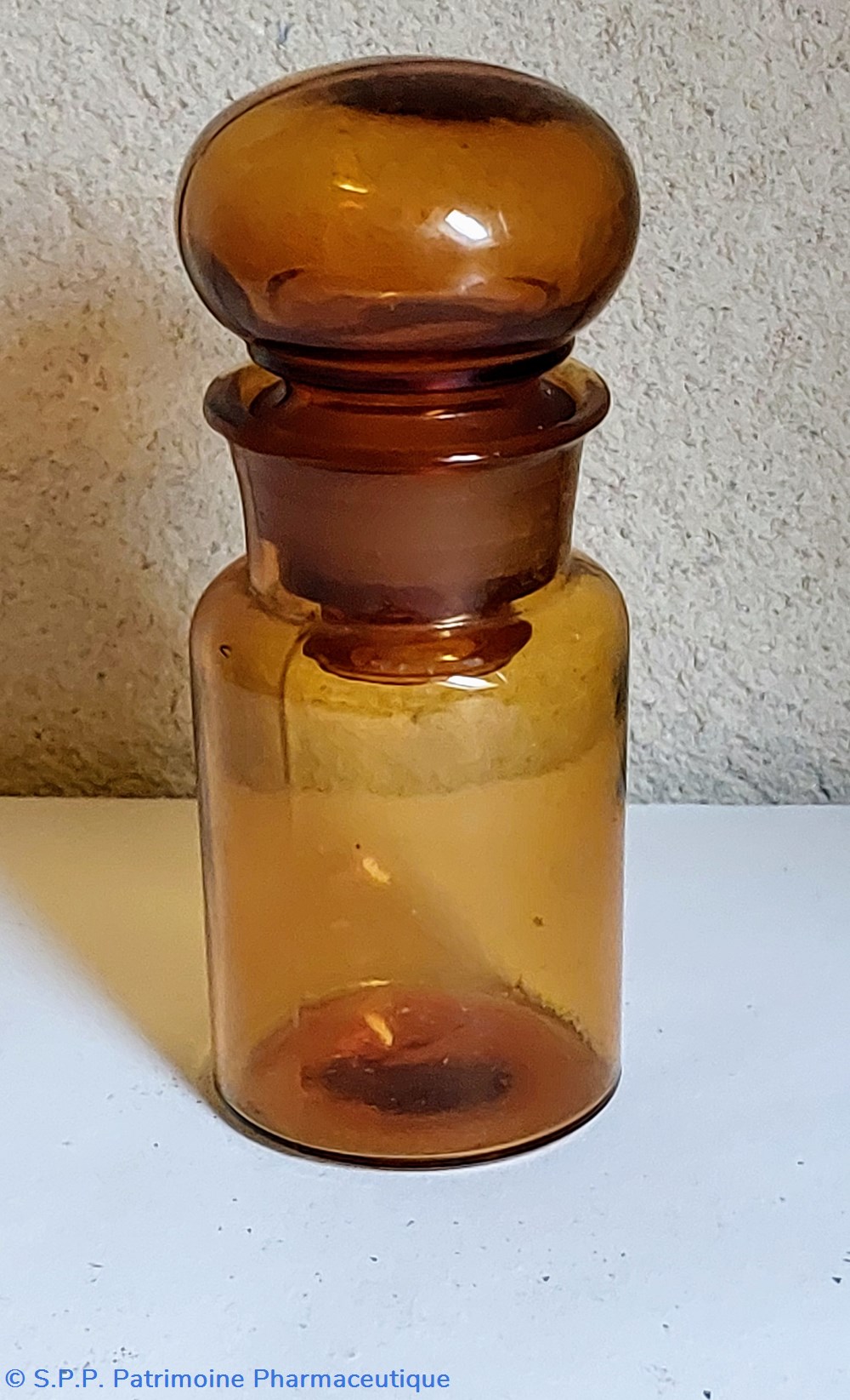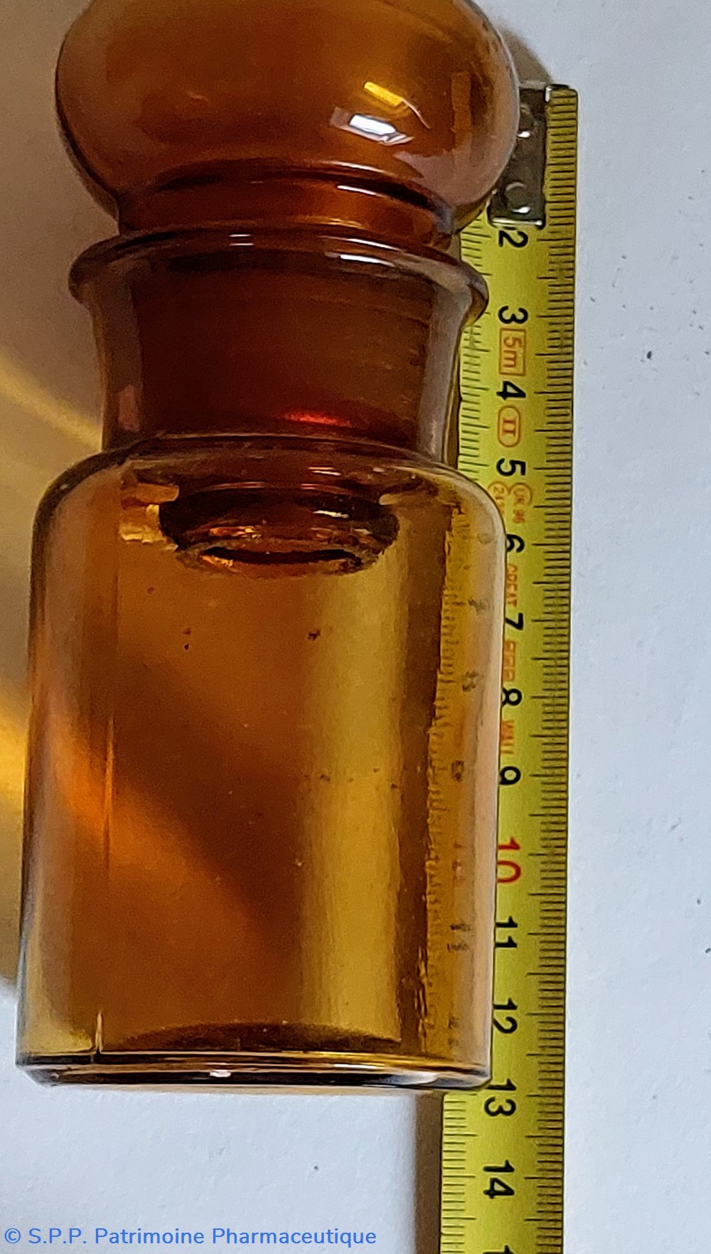 Petit flacon vide en verre ambré fermé à l'émeri par un bouchon en verre. Hauteur 11.5 cm Diamètre base 4.5 cm Diamètre goulot 1.5 cm.