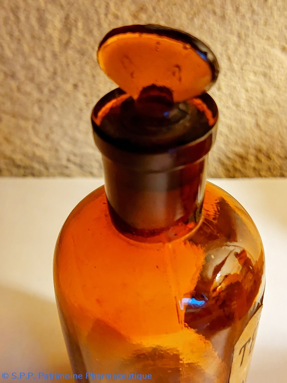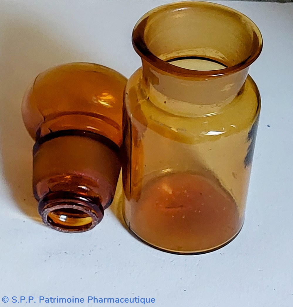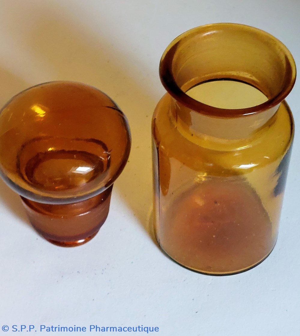 Flacon vide en verre ambré fermé à l'émeri par un bouchon en verre