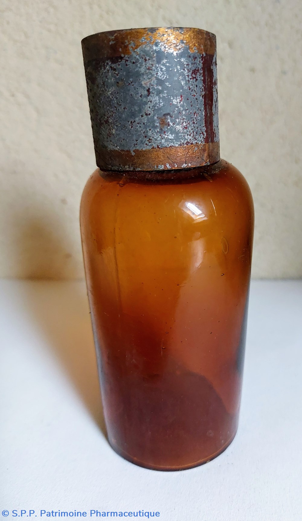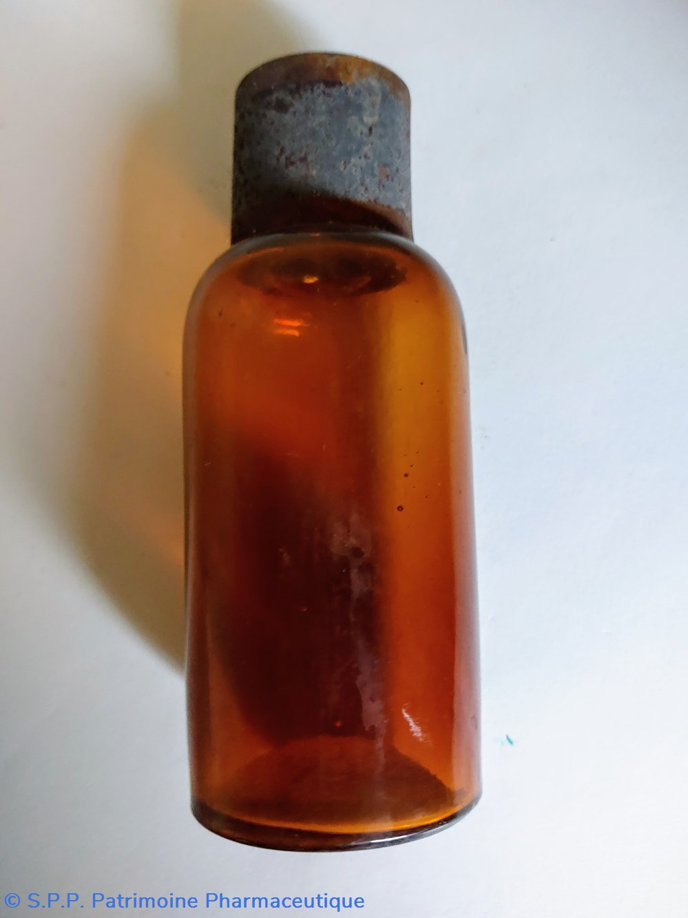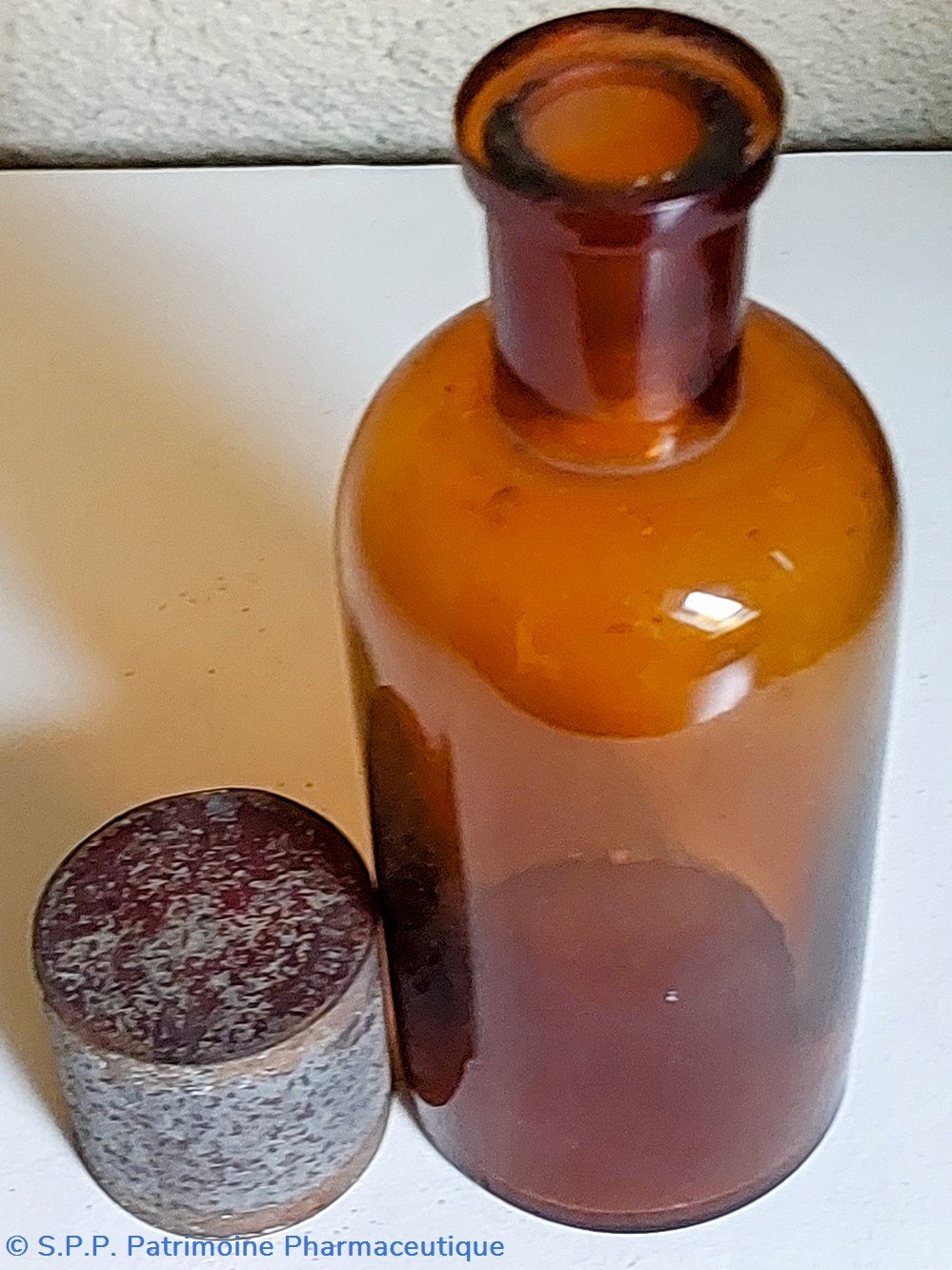 Absence d'étiquette et de bouchon mais coiffé d'un couvercle en tôle décor abîmé.