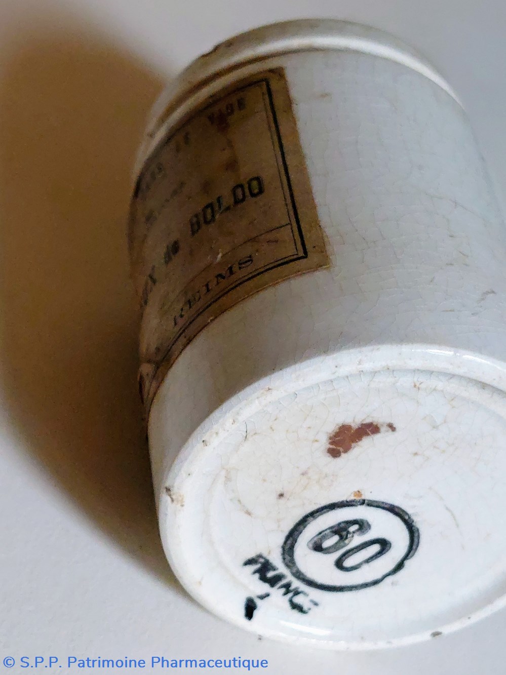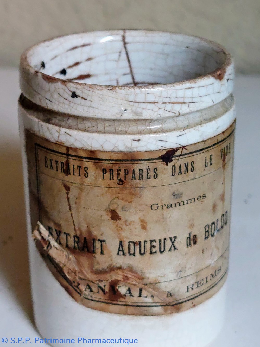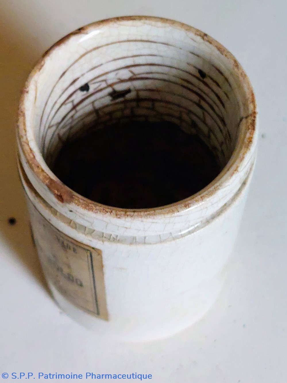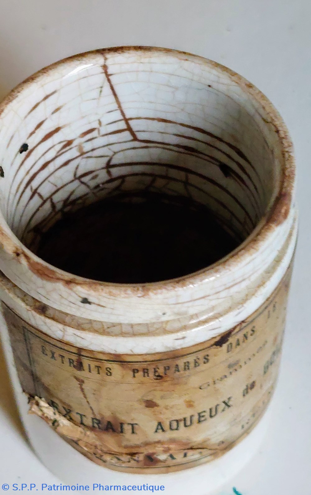 Absence d'étiquette et de bouchon mais coiffé d'un couvercle en tôle décor abîmé.
