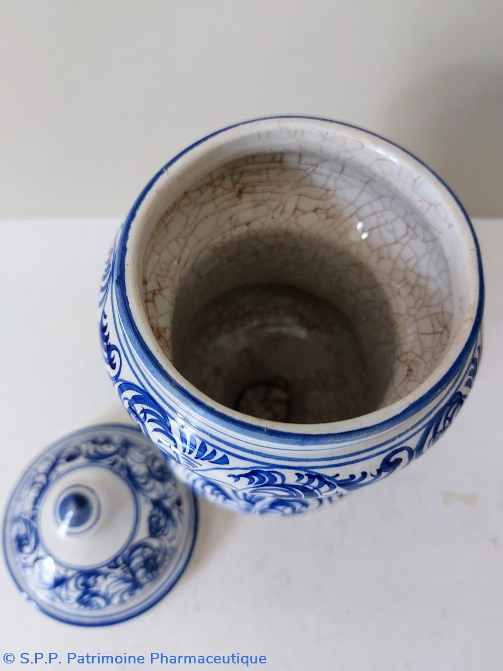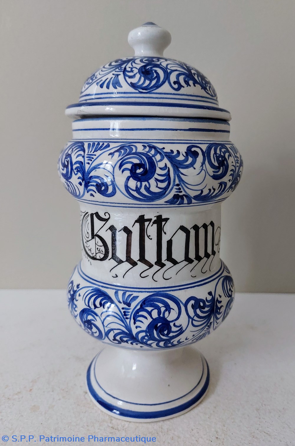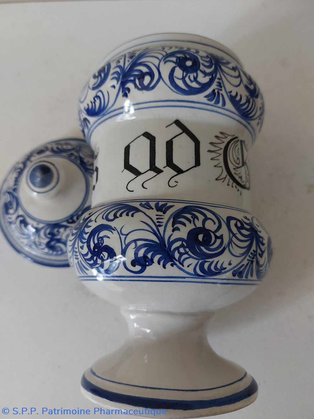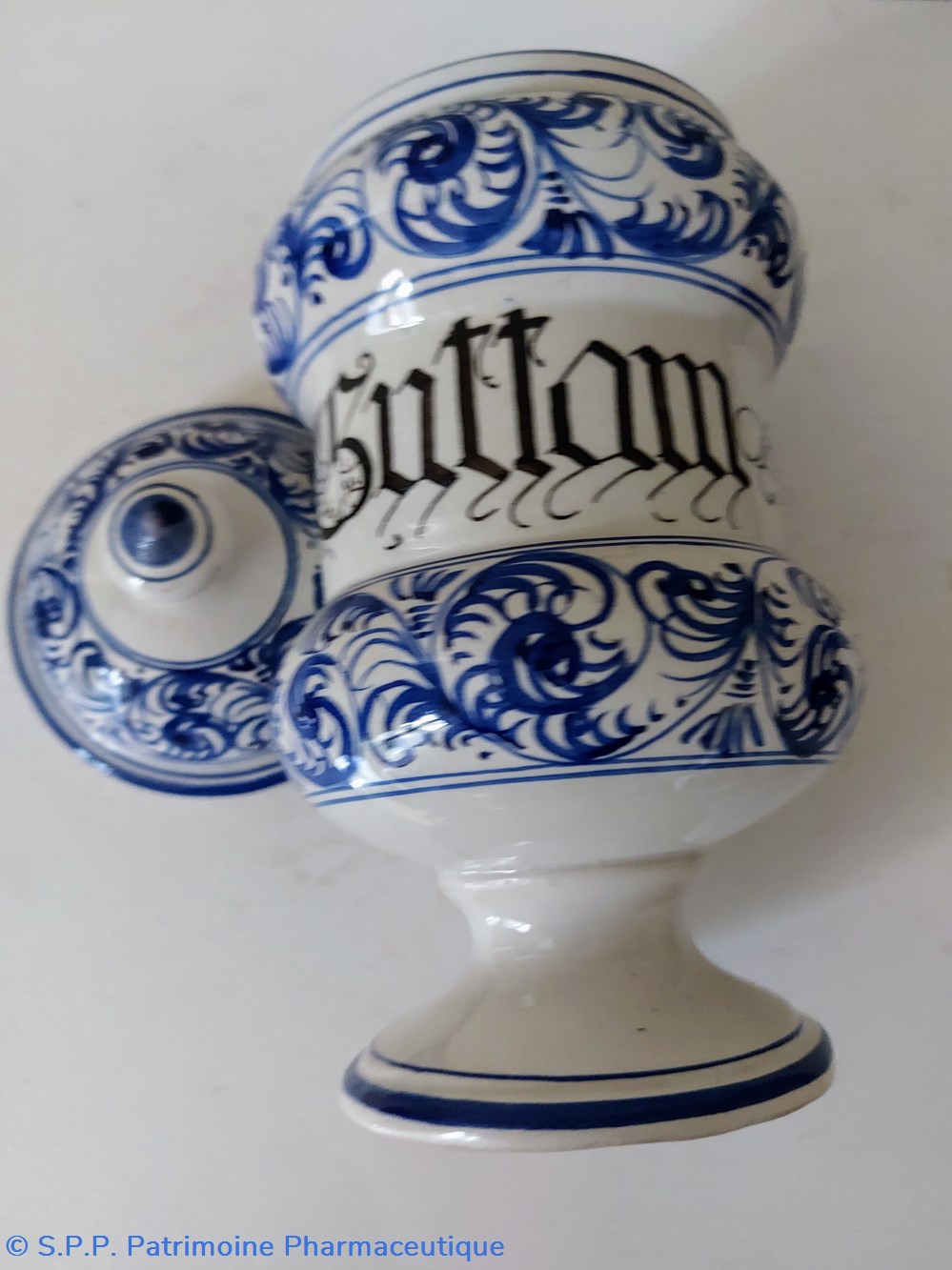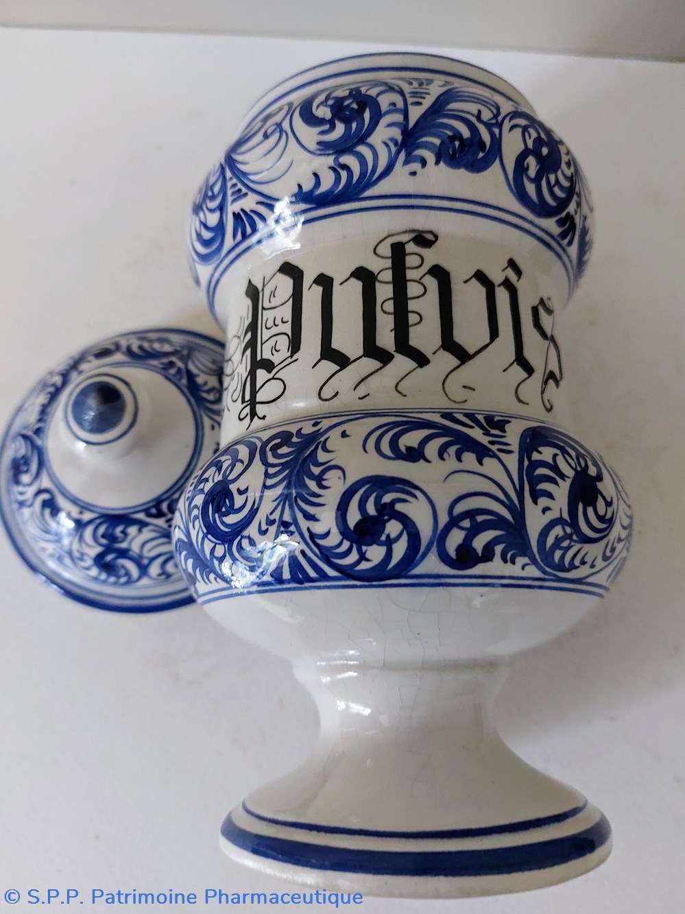 Pot canon ancien de Pharmacie - décor feuillage bleu écriture gothique " Pulvis ad guttam"