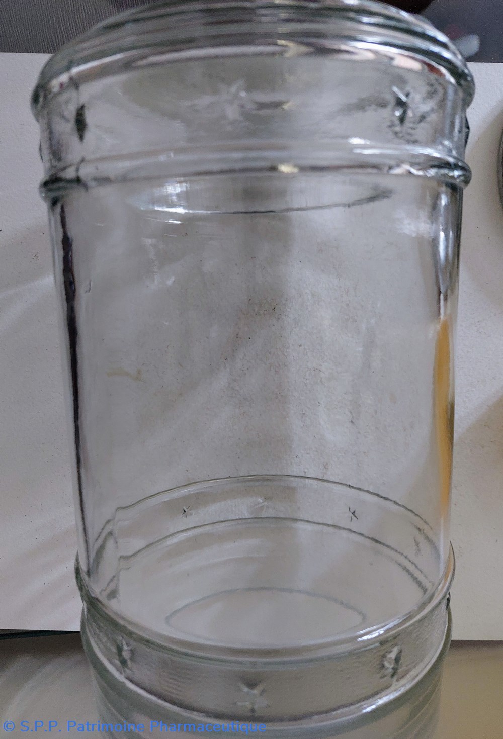 Grand pot en verre Hauteur 25 cm Diamètre d'ouverture 13 cm avec décor de bandes d'étoiles en partie supérieure et inférieure. Pot marqué dessous "VL170".