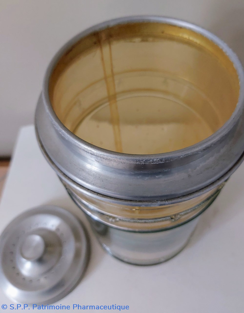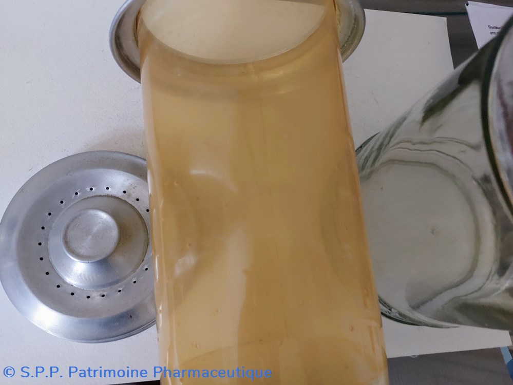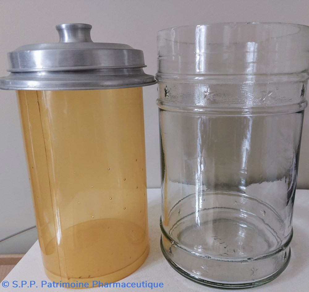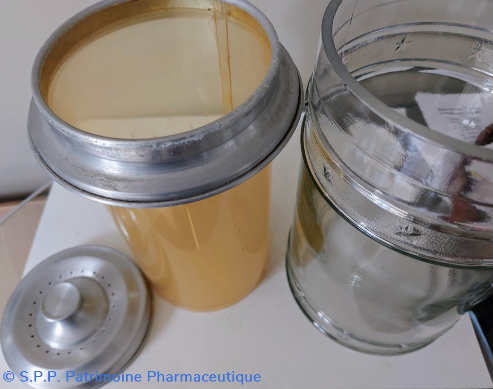 Ce pot est complété par un contenant en plastique transparent perforé dessous et en périphérie. Cette "passoire" est maintenue par un cercle en aluminium qui s'intègre sur le pot en verre.