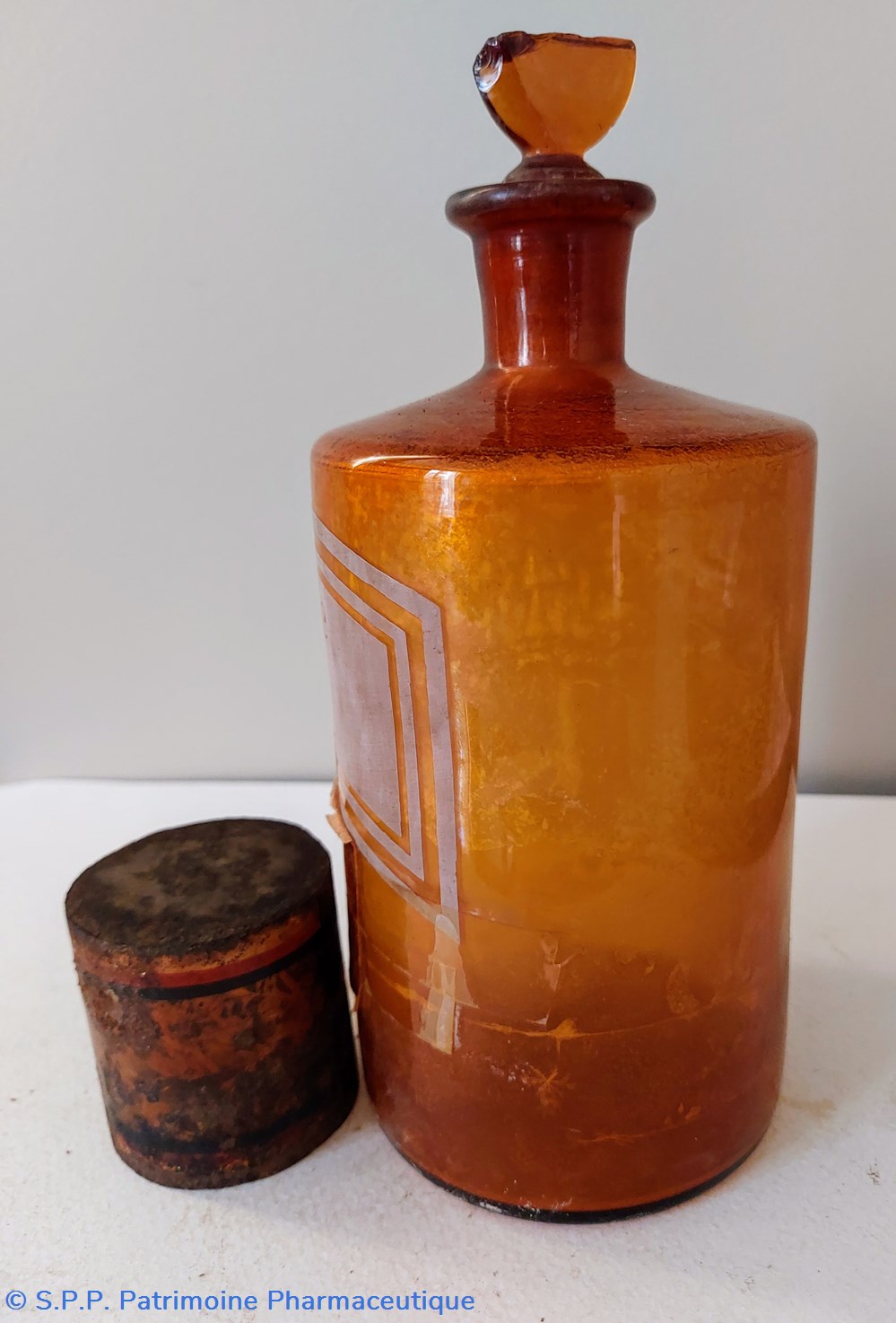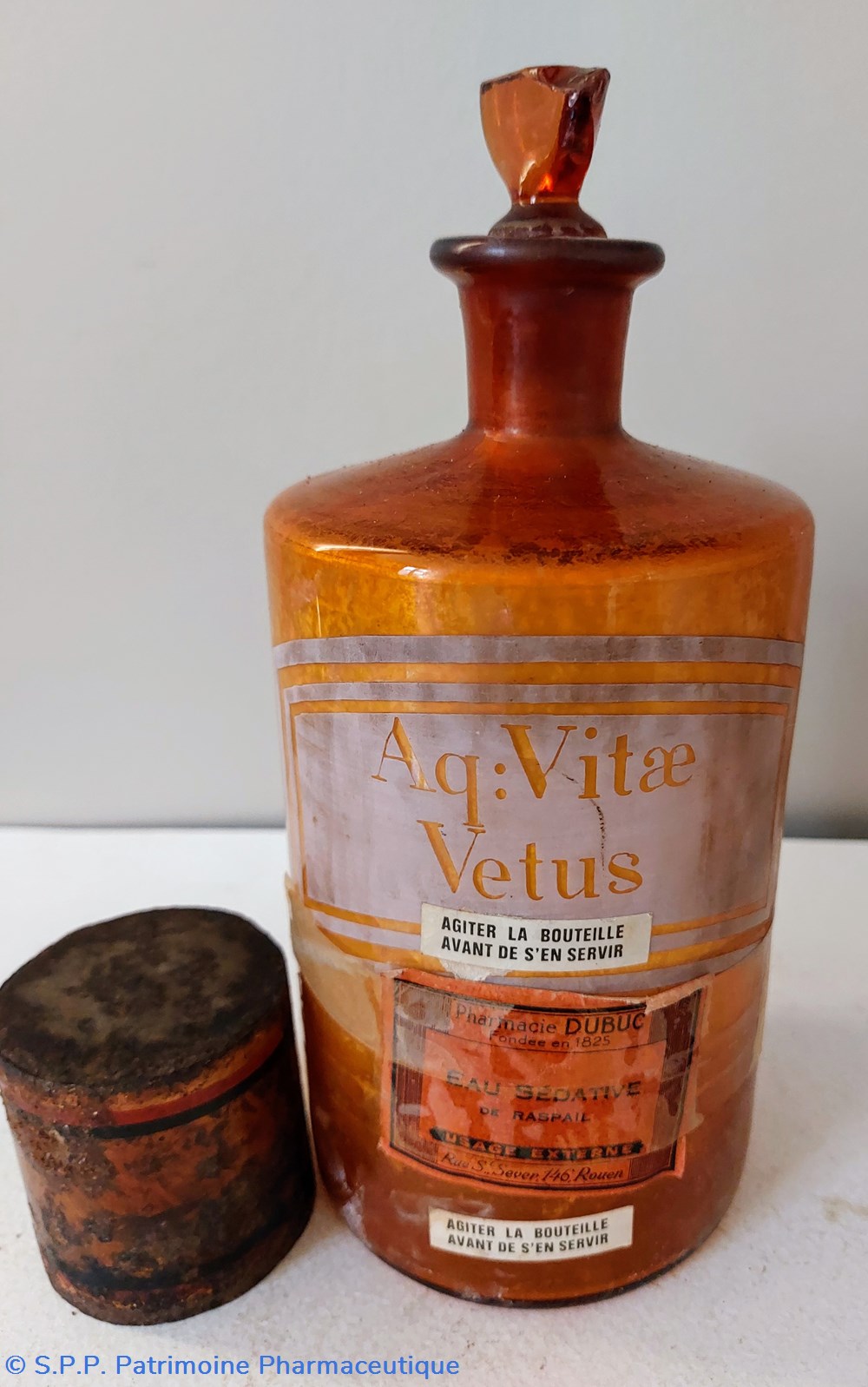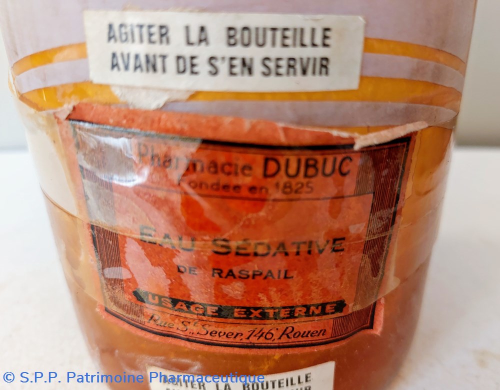 Flacon en verre ambré transparent avec étiquette imprimée de façon écran de soie. Une autre étiquette " Eau Sédative de Raspail"