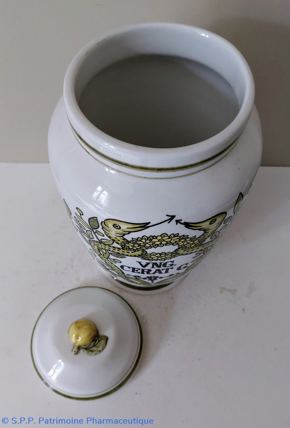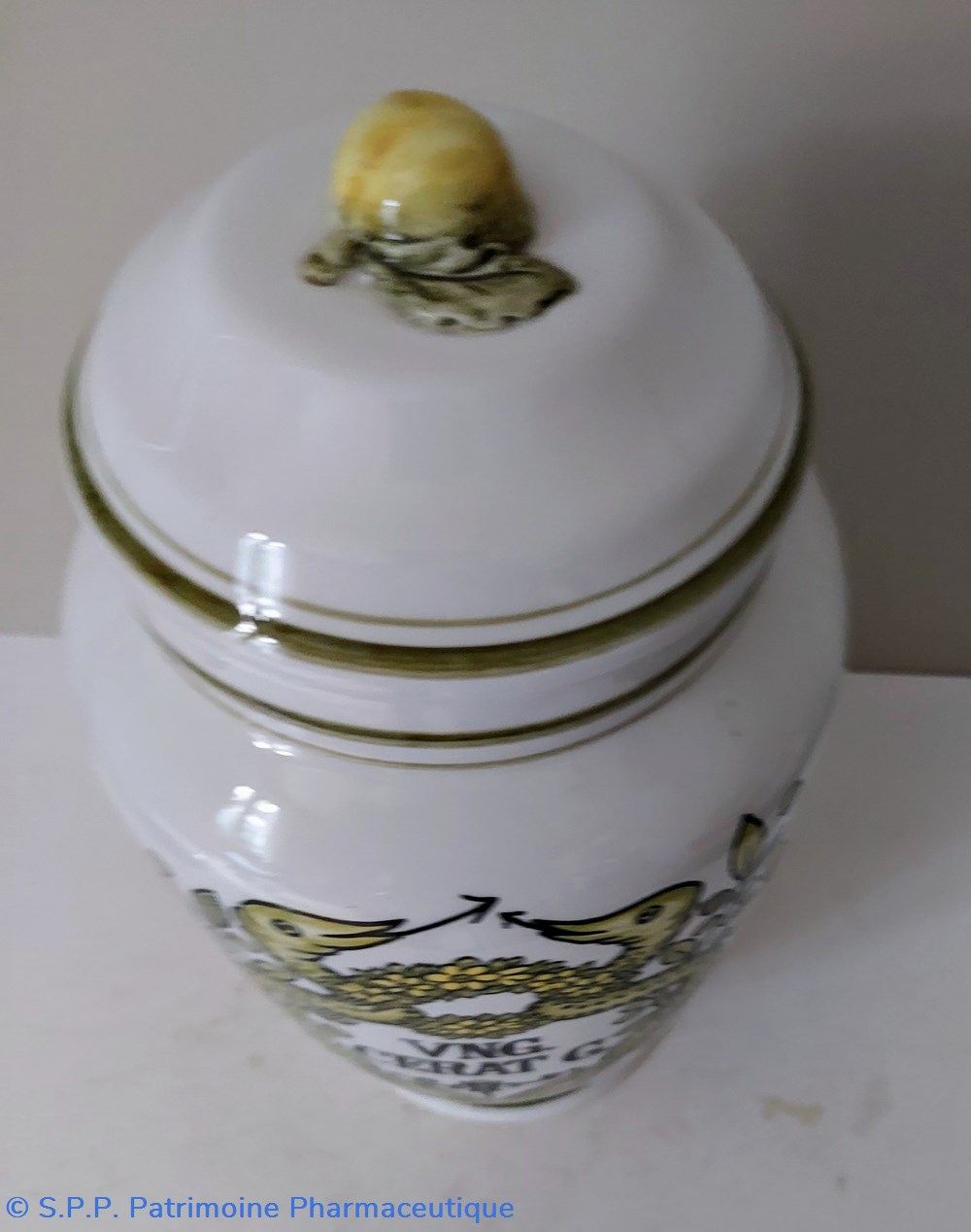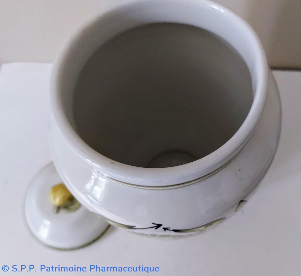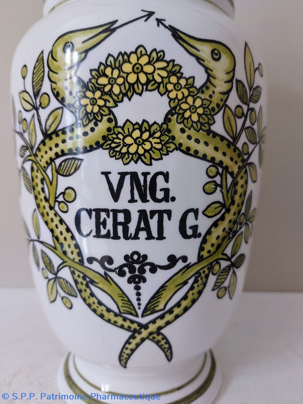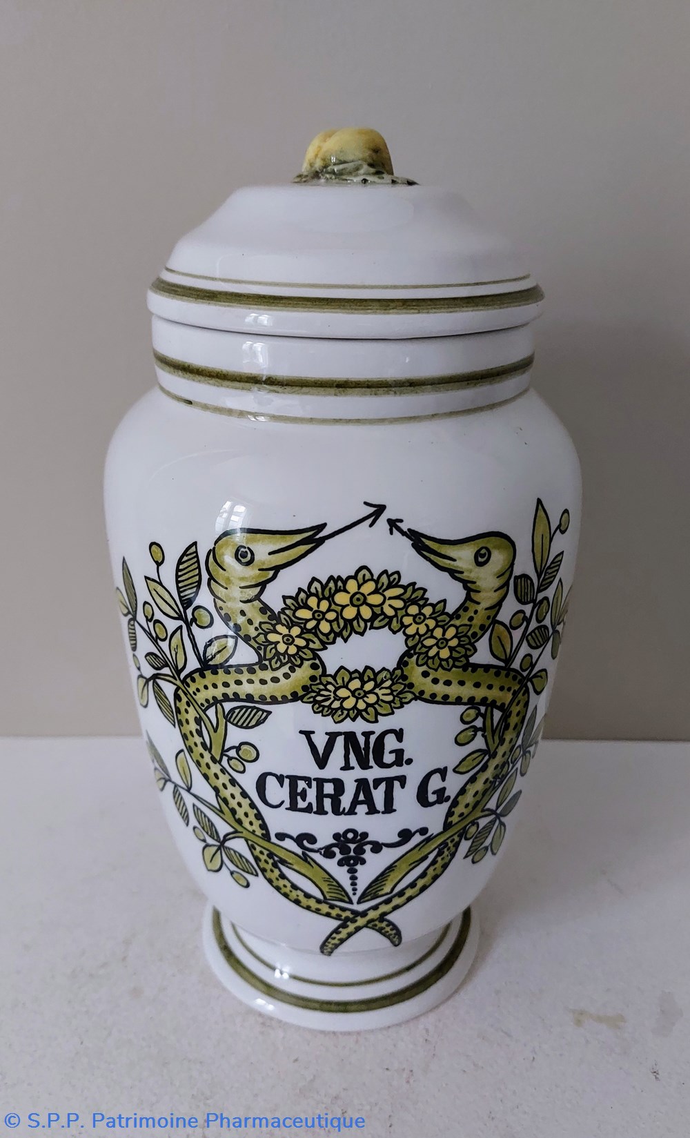 Pot de pharmacie couvert en faience décorée -Décor caducée : Feuillage et serpents reliés par une couronne de fleurs couleur jaune vert .