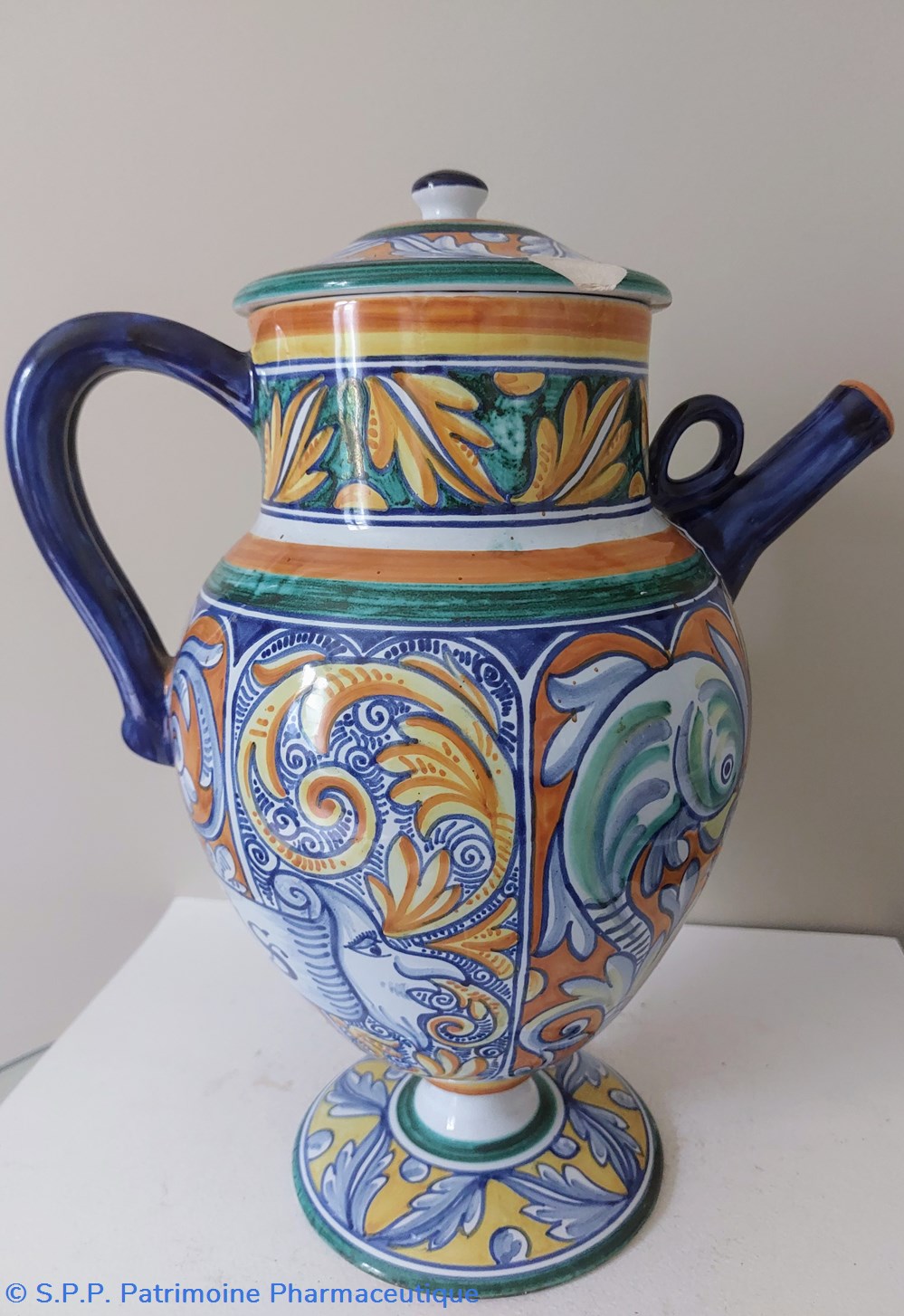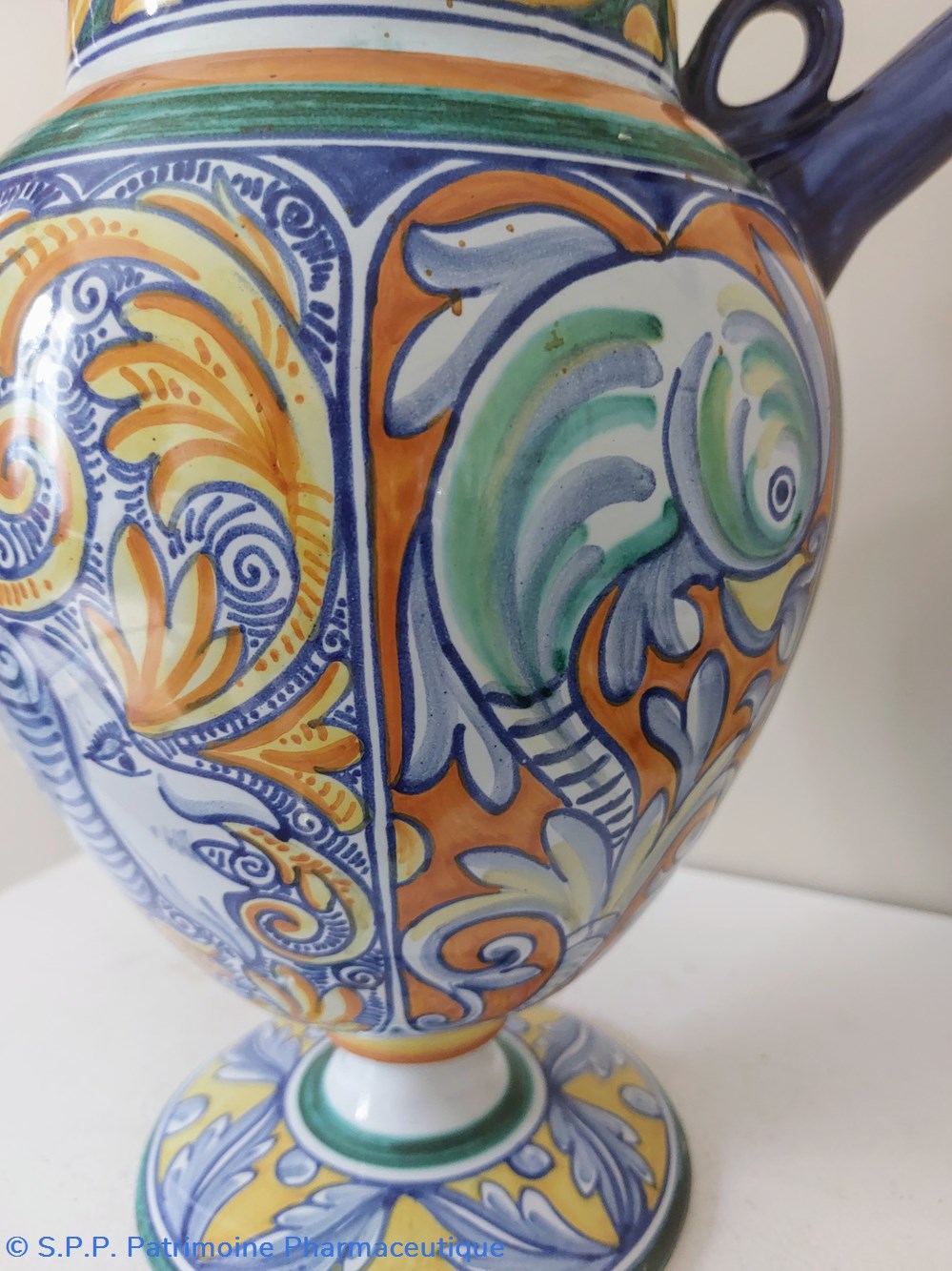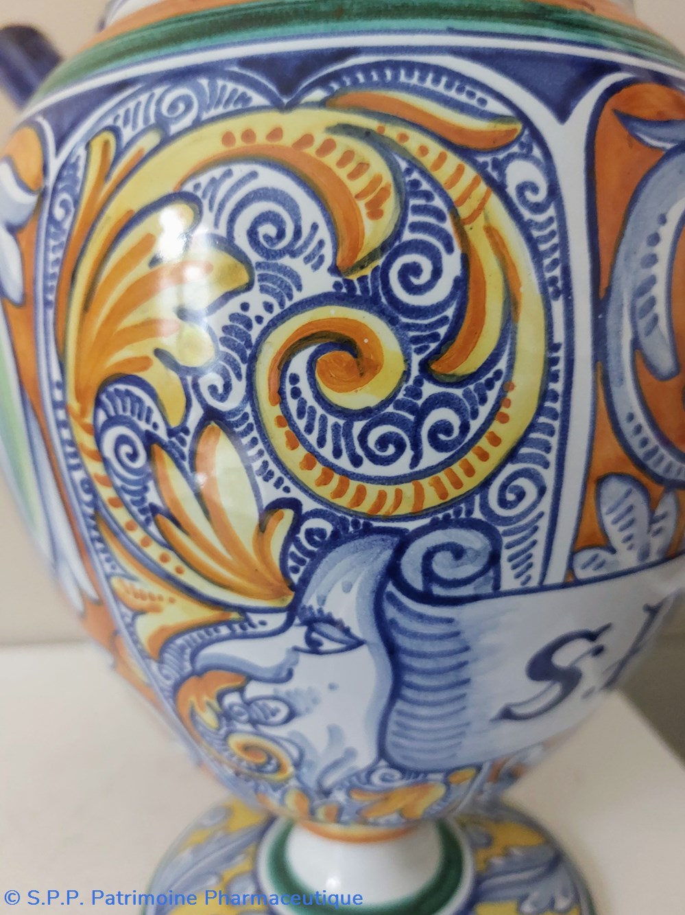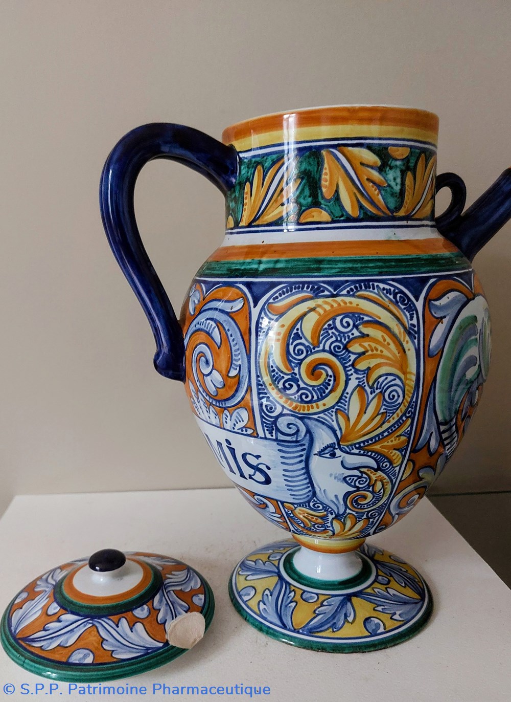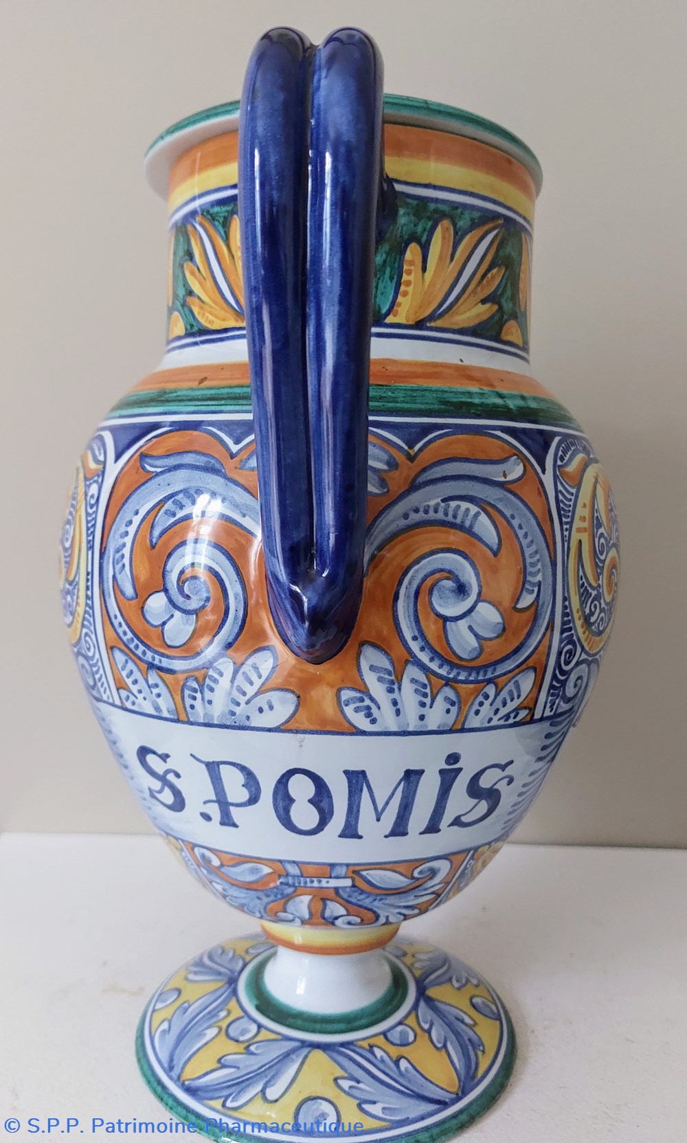 Décor intégral très coloré d'inspiration Majolique - couleurs dominantes : jaune, orange, vert et bleu. Thème : Feuillages, 2 poissons et 2 masques encadrant l'étiquette imprimée : S.POMIS"