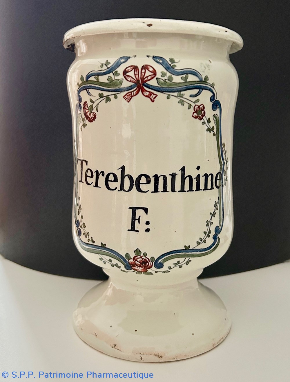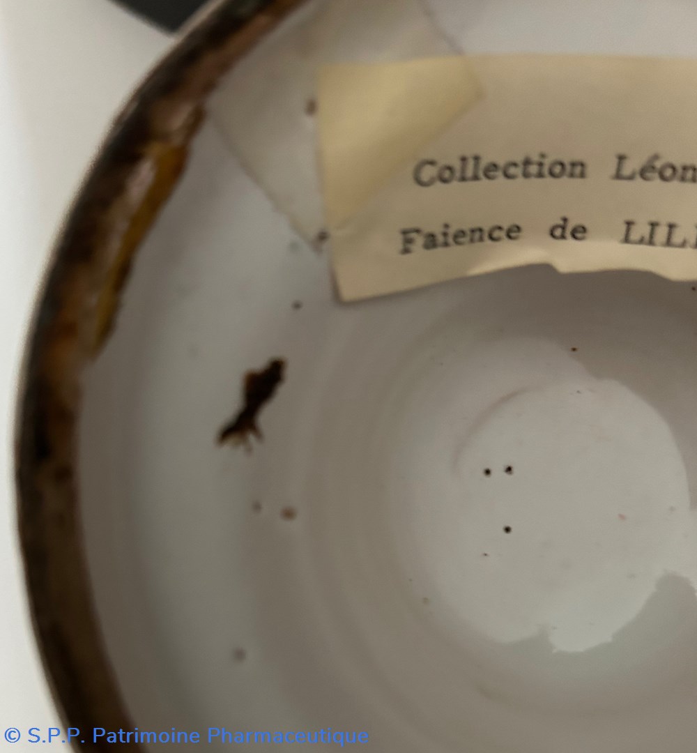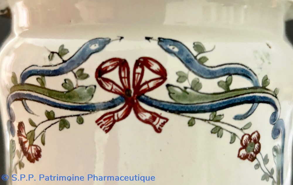 Pot canon de pharmacie en faïence émaillée avec l'inscription au centre dans un cartouche à motif de noeud, oeillet, rose et serpents affrontés :