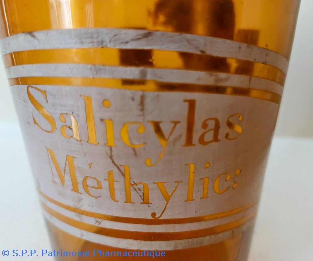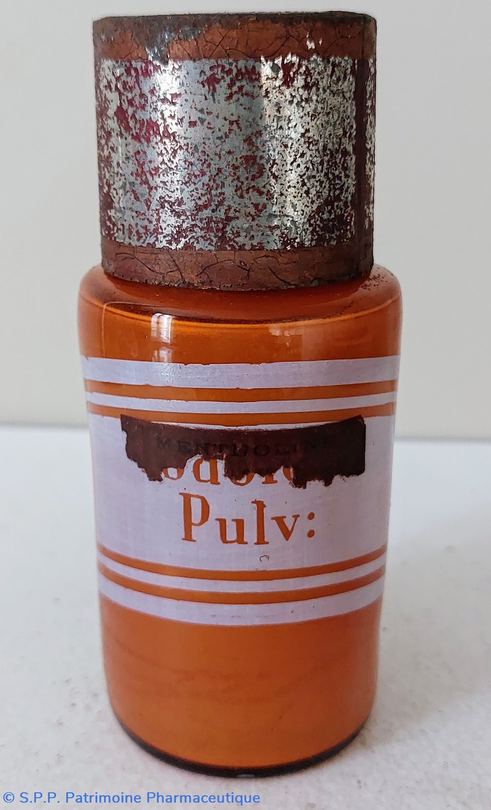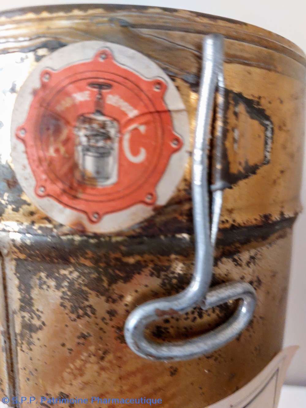 Le goulot est fermé avec un bouchon en liège et coiffé par un couvercle en tôle peinte - Décor : Filets or bordeaux et noir
