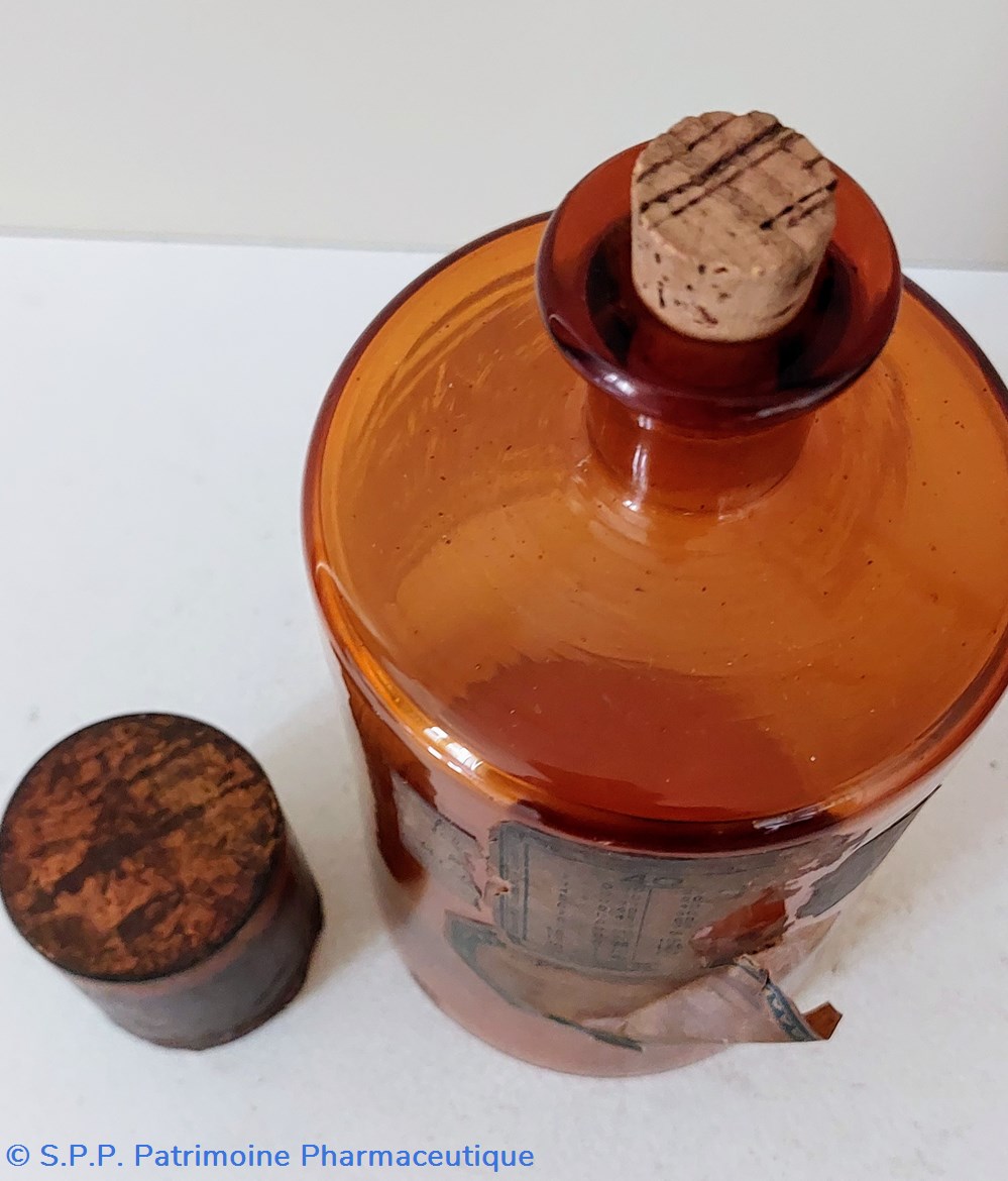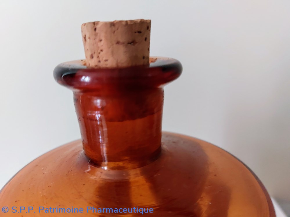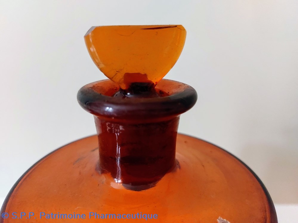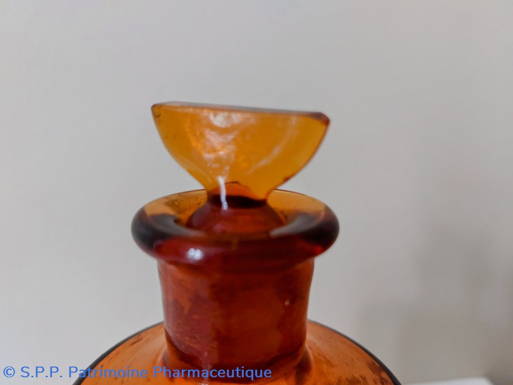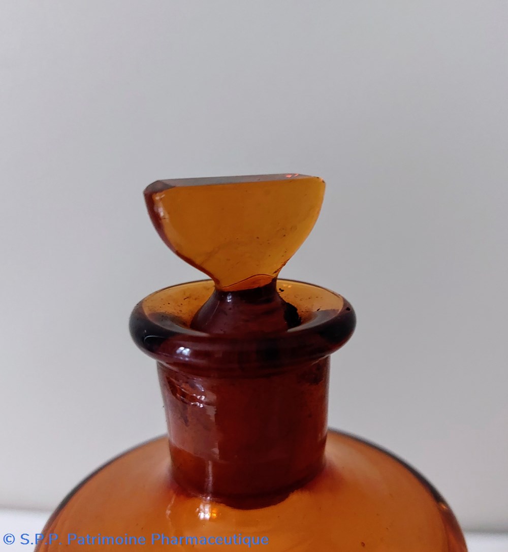 Flacon en verre ambré vide bouché à l'émeri avec un bouchon en forme de demi cercle plat.