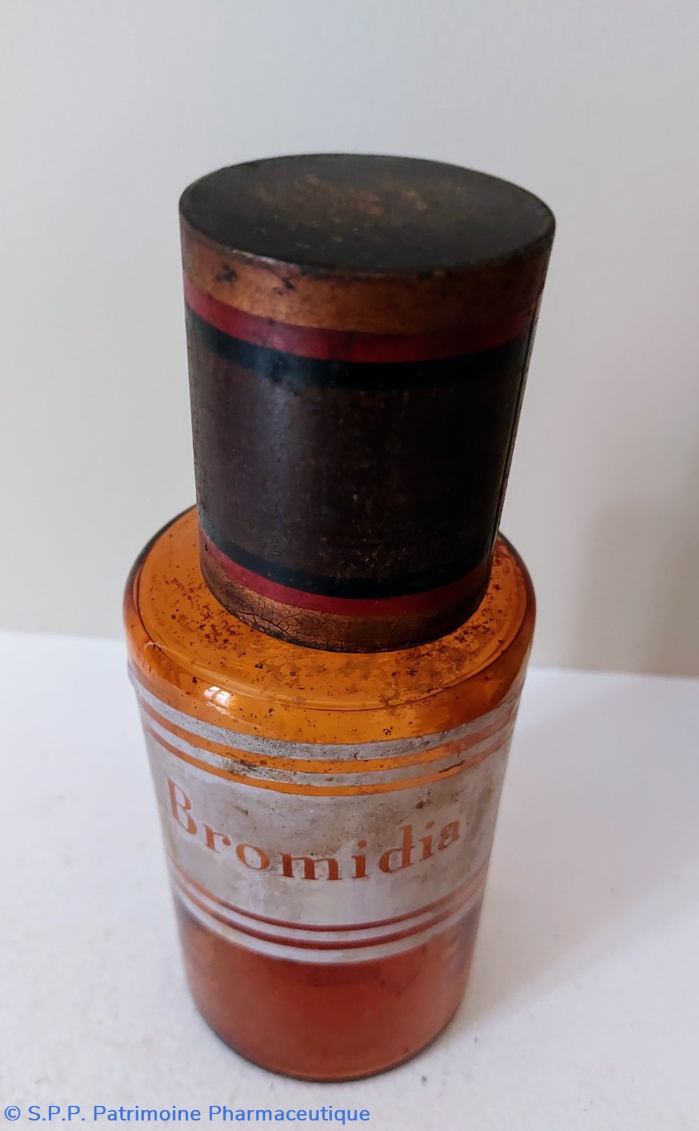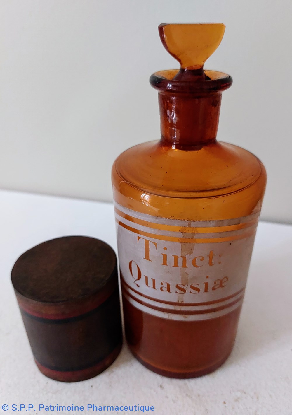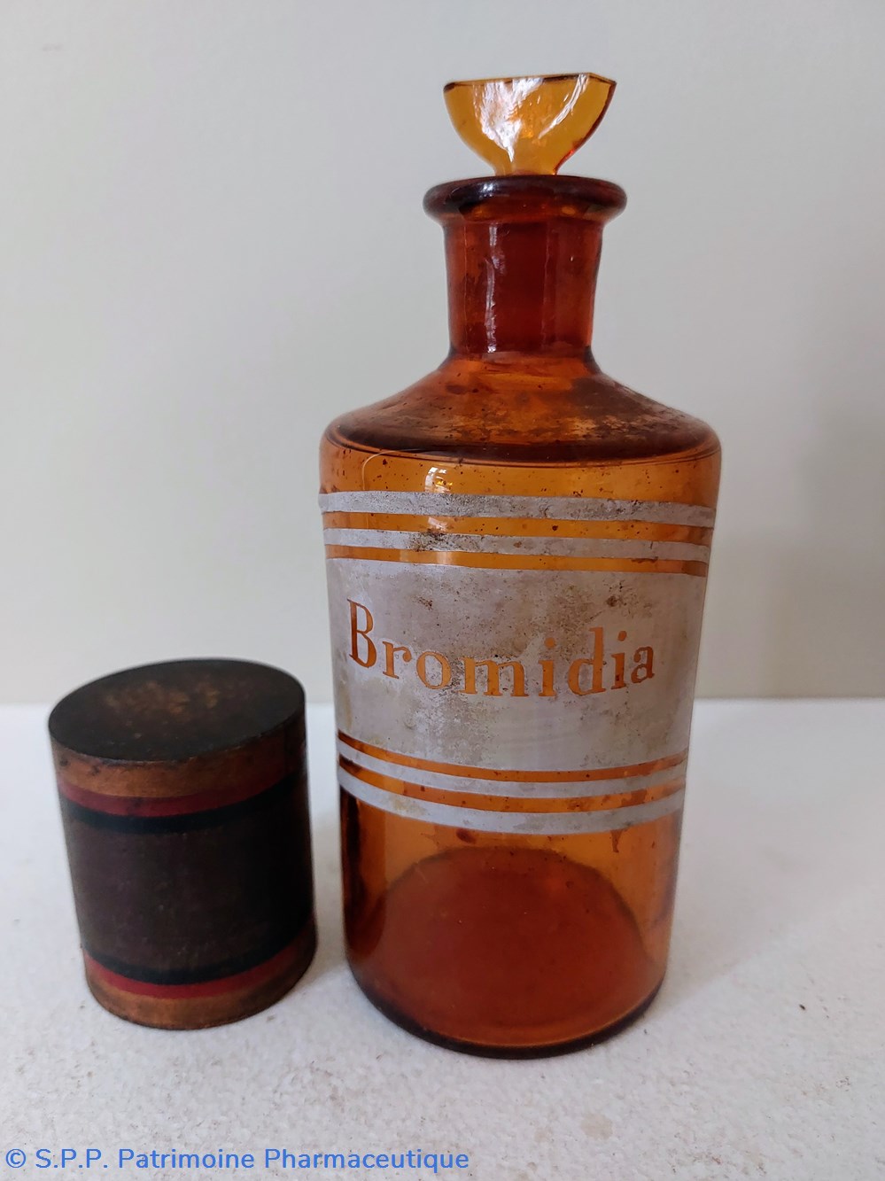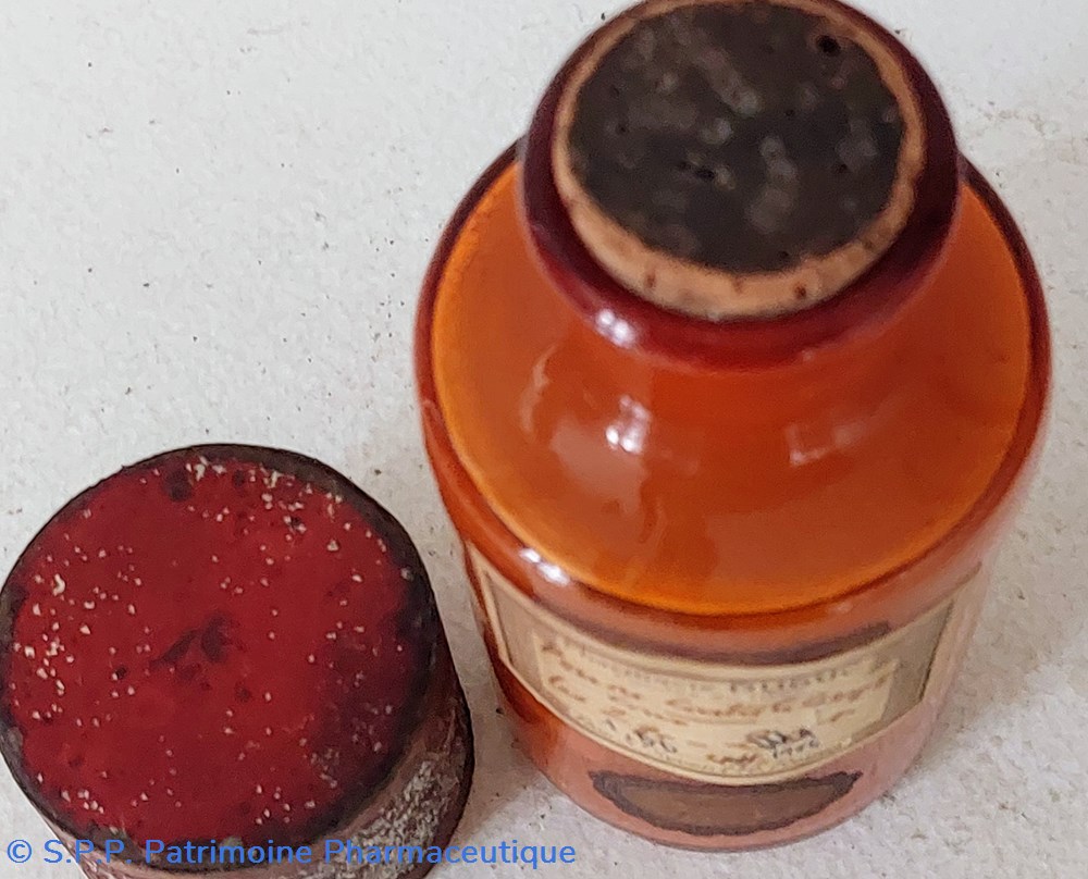 Flacon en verre ambré vide bouché à l'émeri avec un bouchon en forme de demi cercle plat.