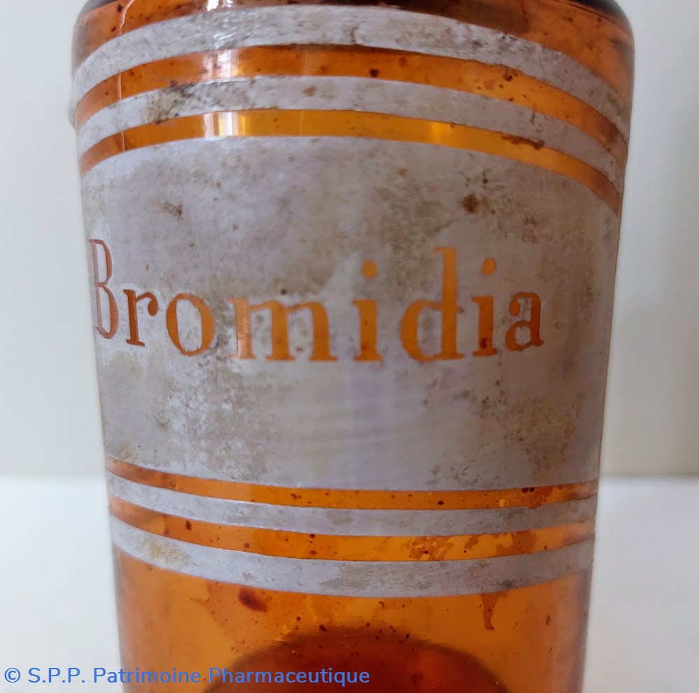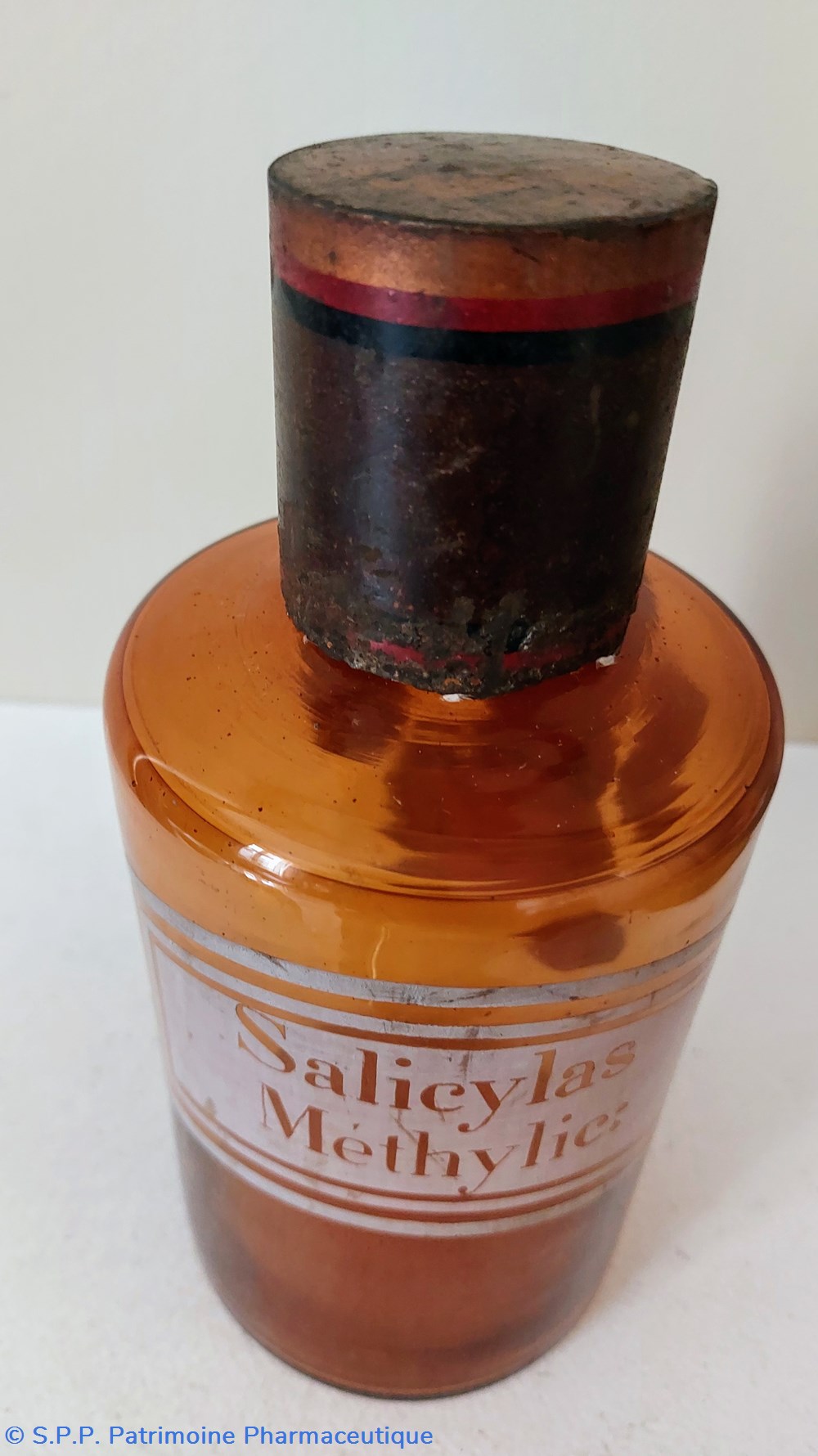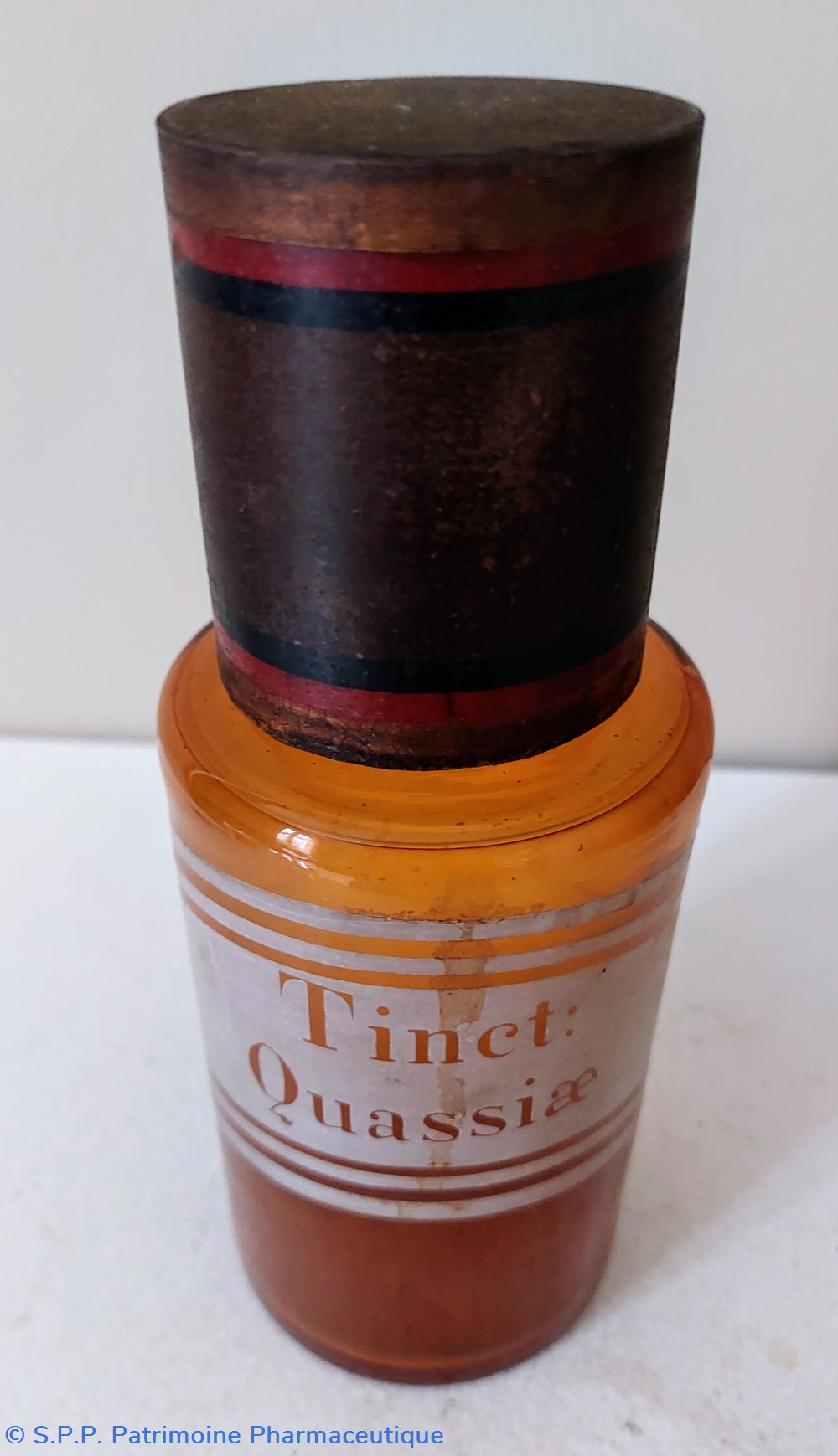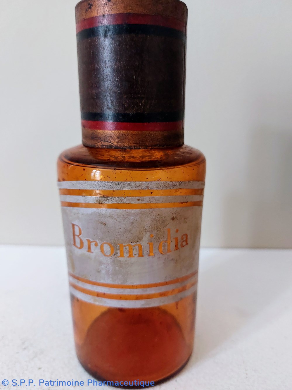 Flacon en verre ambré vide bouché à l'émeri avec un bouchon en forme de demi cercle plat.