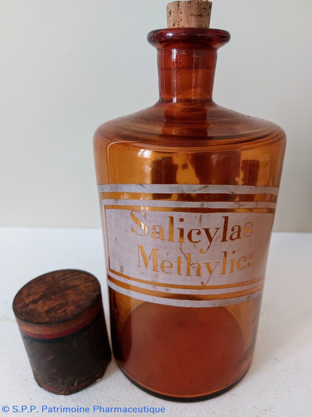 Flacon vide en verre ambré fermé à la maison l'émeri par un bouchon plat en verre en forme de demi cercle.