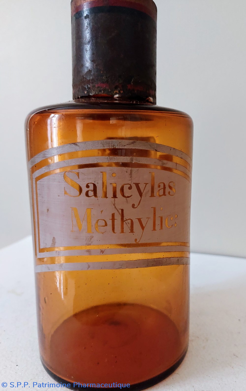 Flacon vide en verre ambré fermé à l'émeri par un bouchon plat en forme de demi cercle
