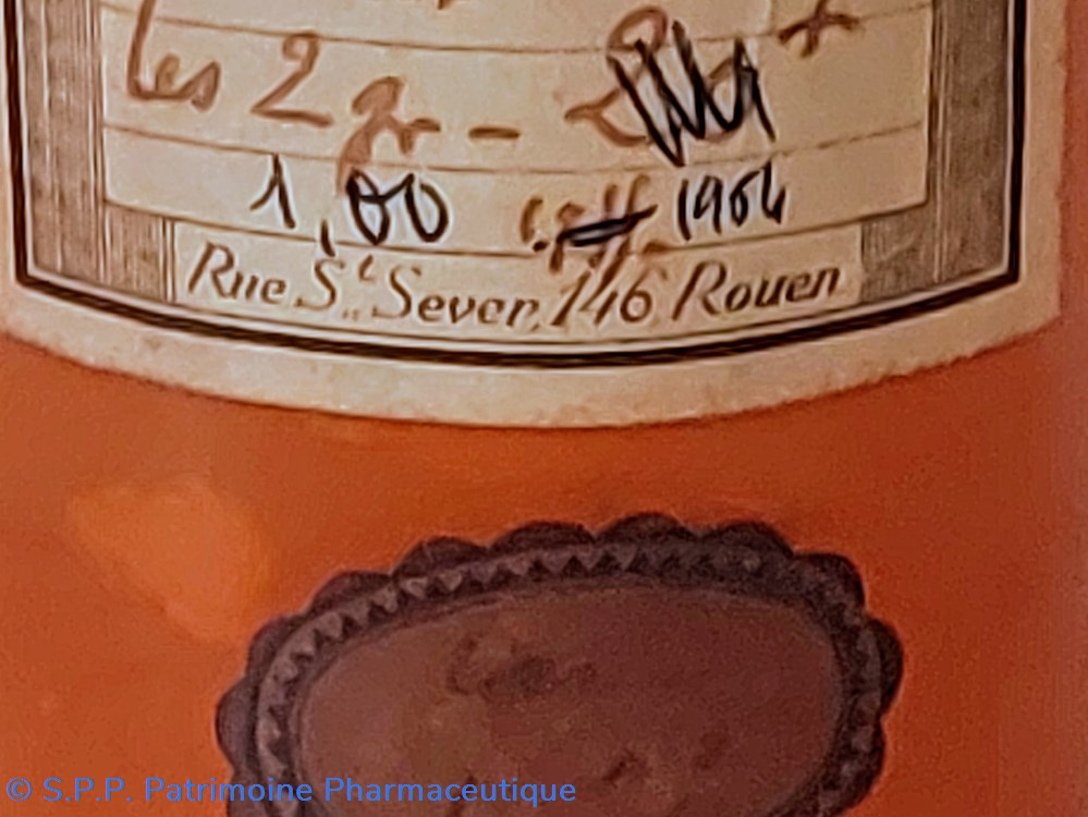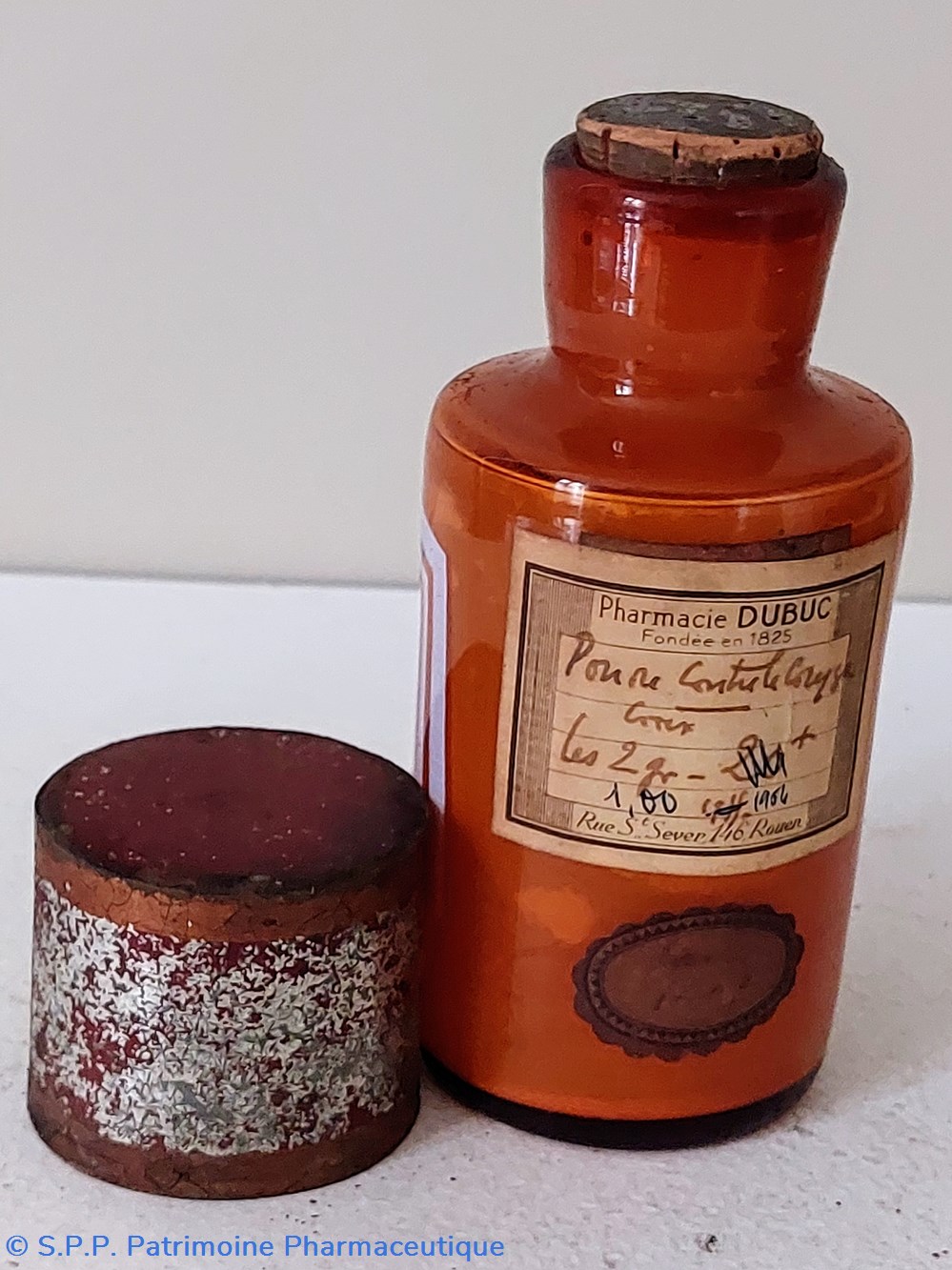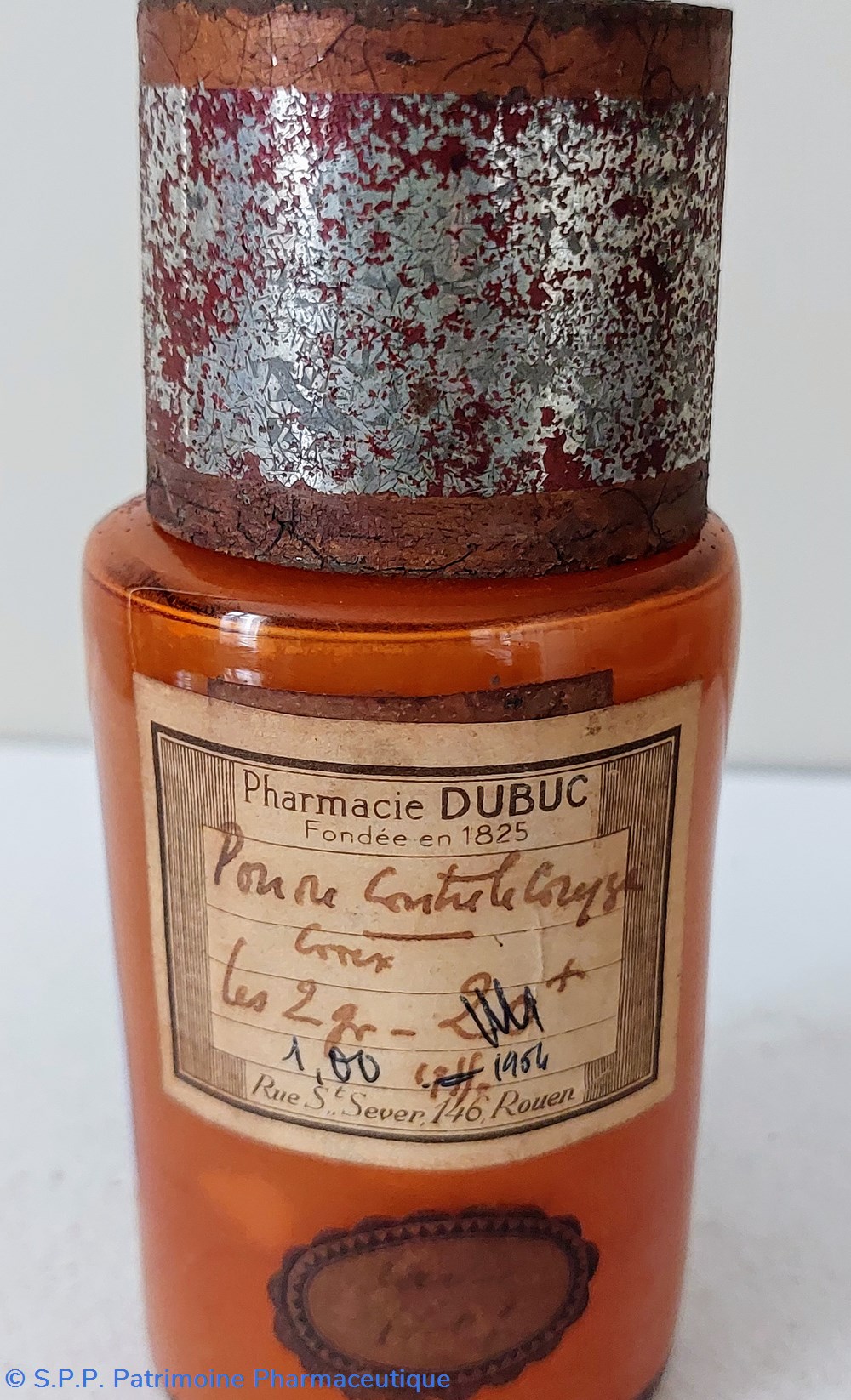 Une étiquette manuscrite indique " Poudre contre le Coryza" provenant de la Pharmacie DUBUC à Rouen. On y trouve une date en bas à droite " 1954"
